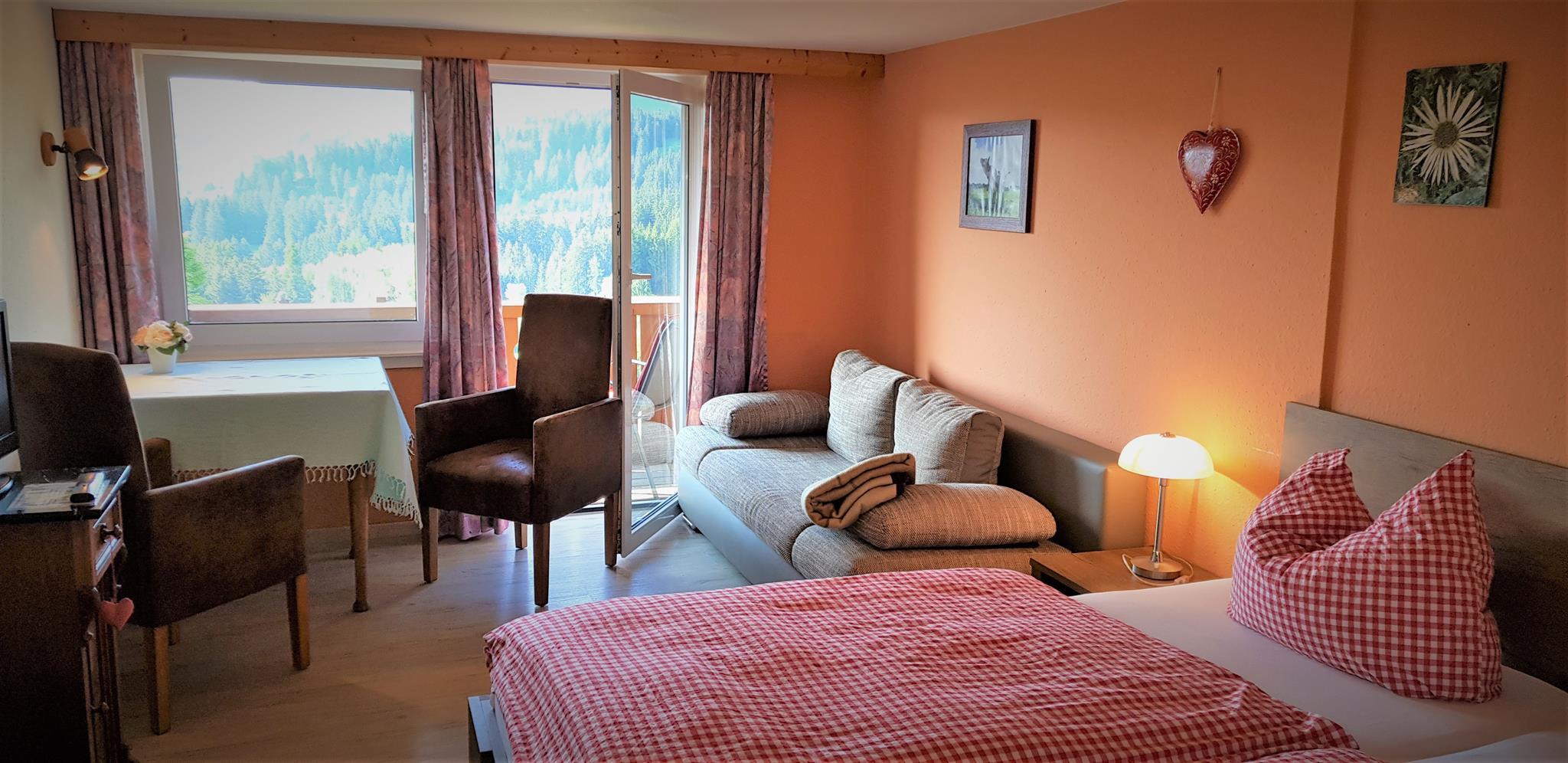Fühlen Sie sich wohl in unseren hellen geräumigen Doppelzimmern, die individuell ausgestattet sind. Alle Zimmer haben einen Balkon mit Blick in den Garten und ins Allgäu Paradies.  Die Balkone sind mit bequemen Stühlen und Tisch ausgestattet, so können Sie dort gemütlich ein Getränk oder eine Brotzeit einnehmen. Auch ein TV  mit Sitzecke, Dusche/WC/Fön gehören zur Ausstattung.