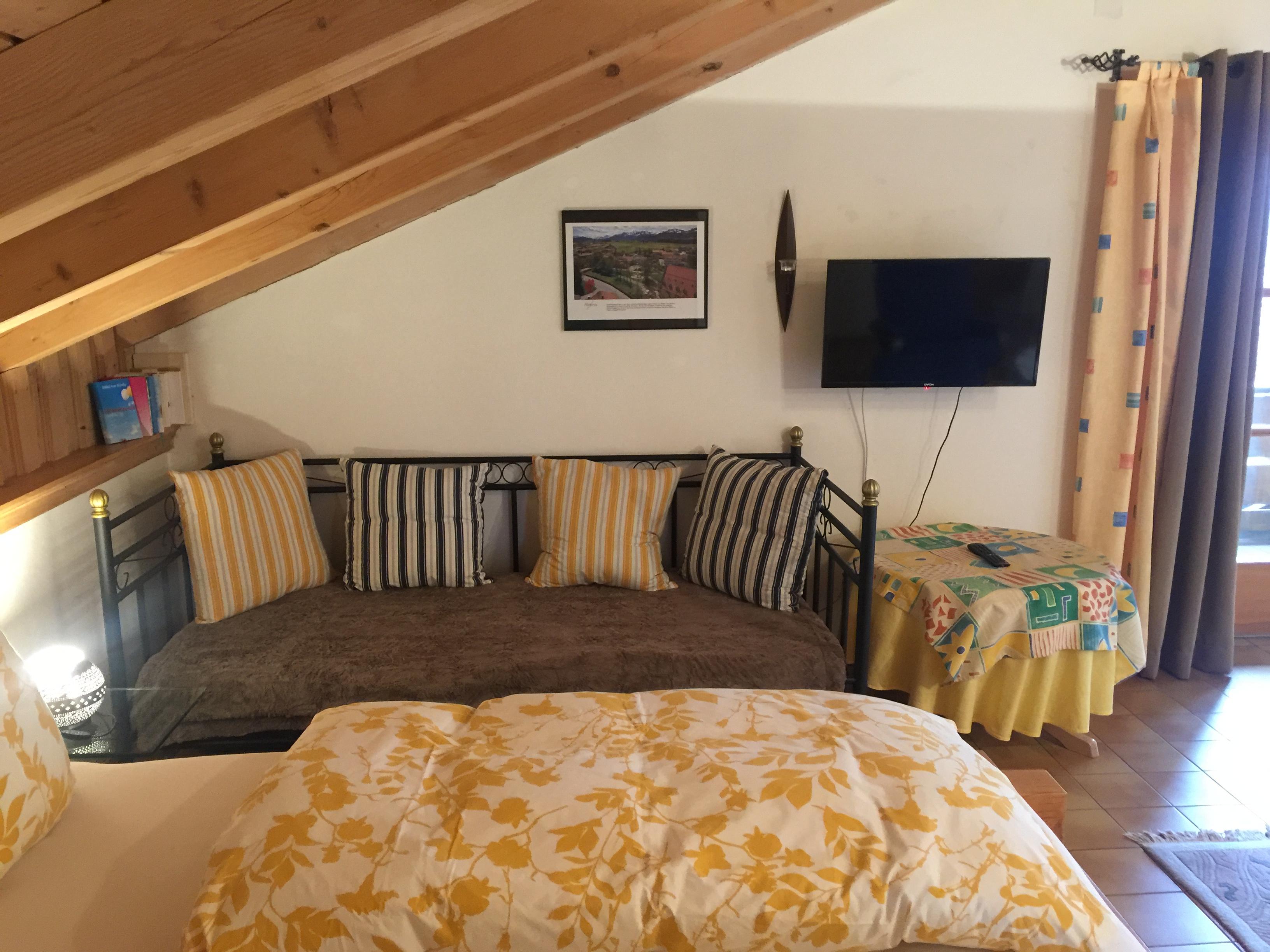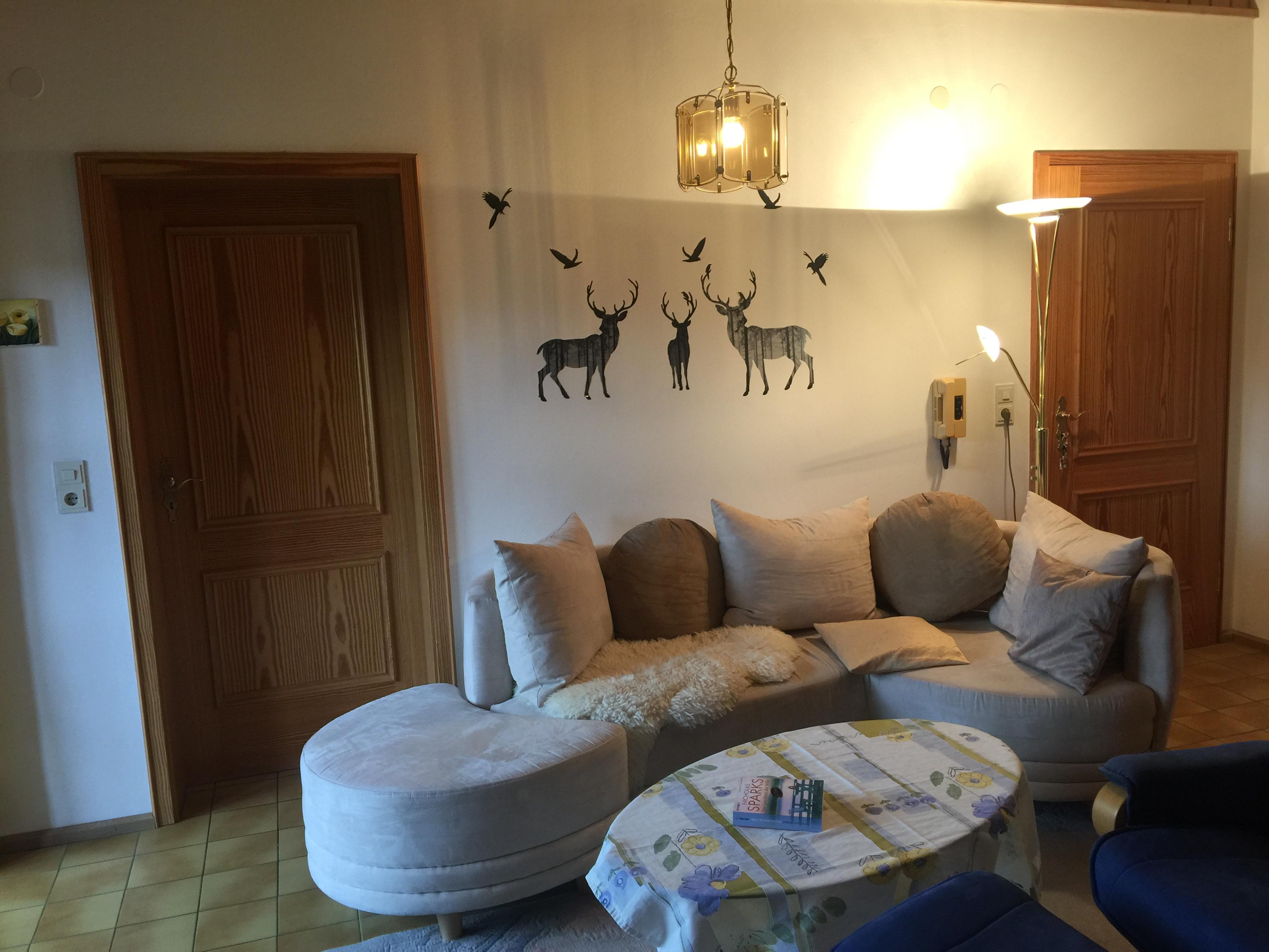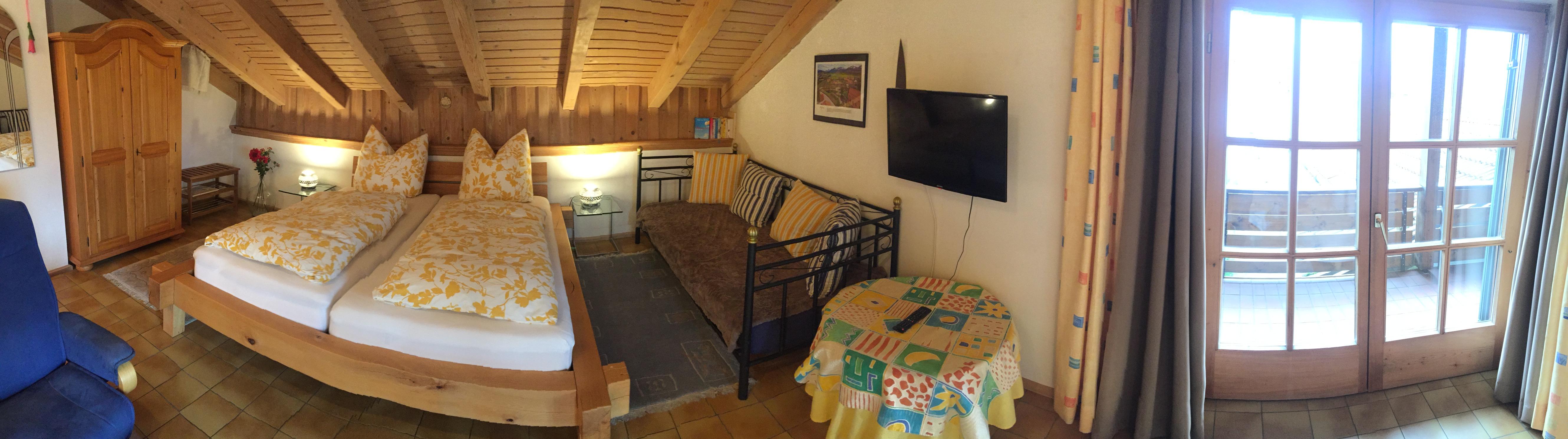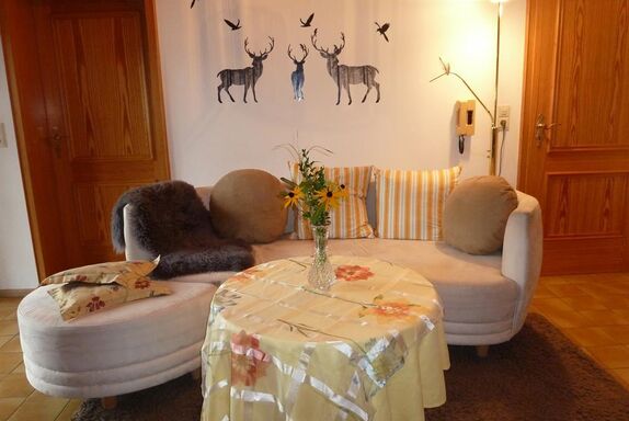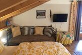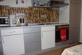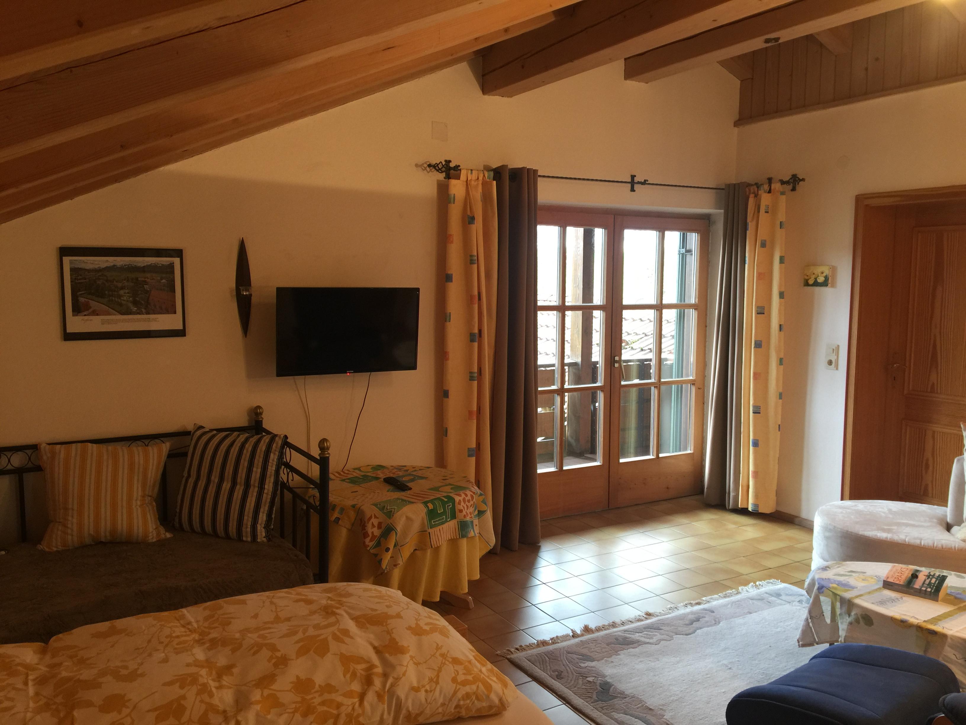 Unser Ferienappartement im Obergeschoss besteht aus - einem großen Wohn-/Schlafraum (ca. 28qm) mit einem Doppelbett und einem Einzelbett, mit bequemen Polstermöbeln, einem Relaxsessel und SAT/TV, - einer separaten Küche (ca 9qm) mit Esstisch, Elektroherd und Backofen, einem Kühl/Gefrierschrank, Kaffeemaschine, Mikrowelle - einem Bad mit Du/WC und Badewanne, W-Lan.
