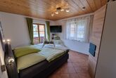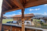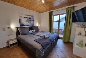 Im Schlafzimmer erwartet Sie ein komfortables Boxspringbett, von dem aus Sie direkt auf den großzügigen Balkon gelangen. Dieser umschließt die gesamte Hausfront und einen Teil der Seitenfront und bietet Ihnen einen atemberaubenden Panoramablick auf die umliegende Bergwelt. Auch vom Wohnbereich aus können Sie die frische Alpenluft in vollen Zügen genießen.
