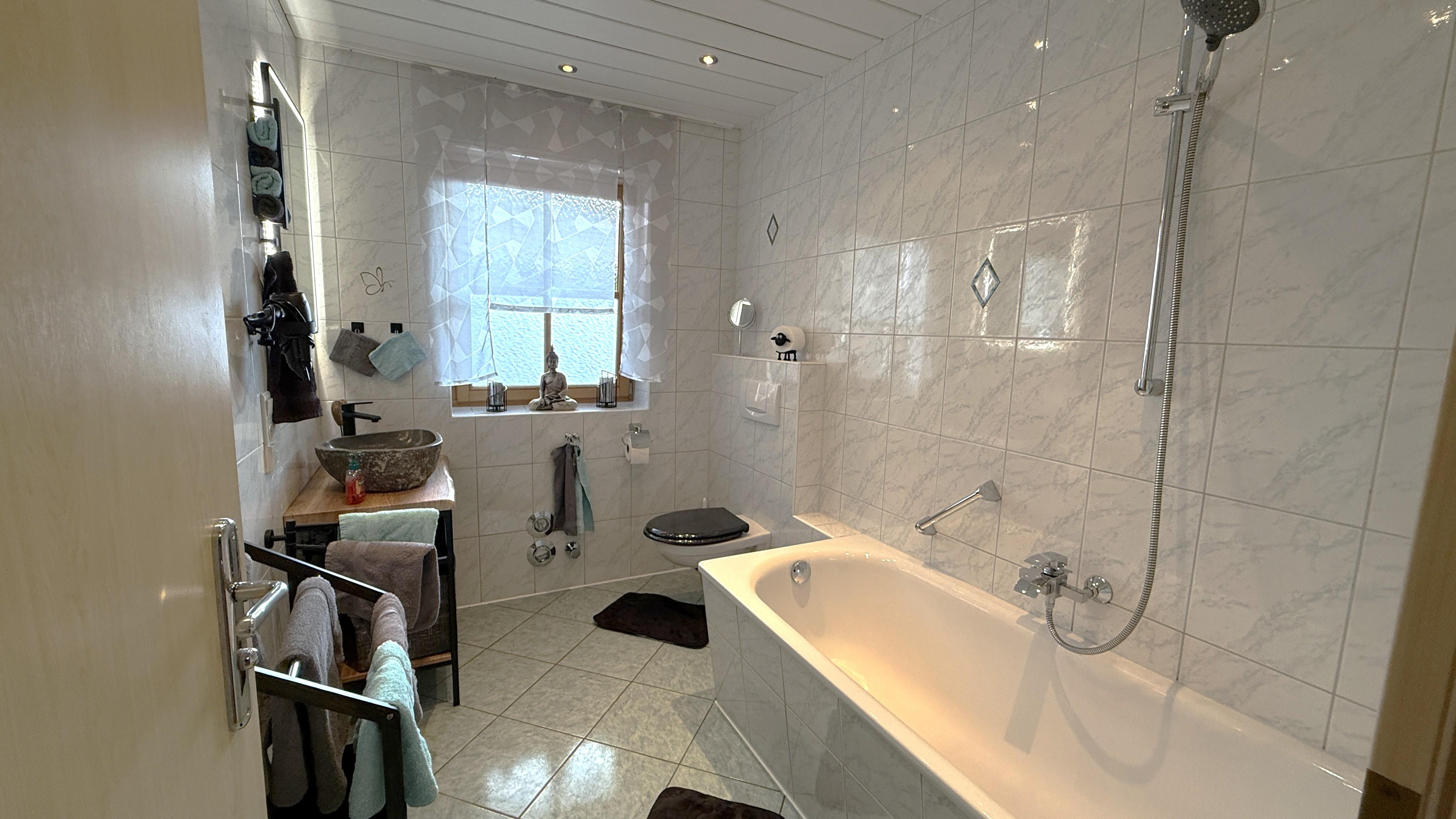 Das Badezimmer punktet mit einer Duschbadewanne, WC und Fußbodenheizung, die sich durch alle Räume zieht und für wohlige Wärme sorgt. Kostenloses WLAN und ein eigener PKW-Stellplatz runden das Angebot ab.