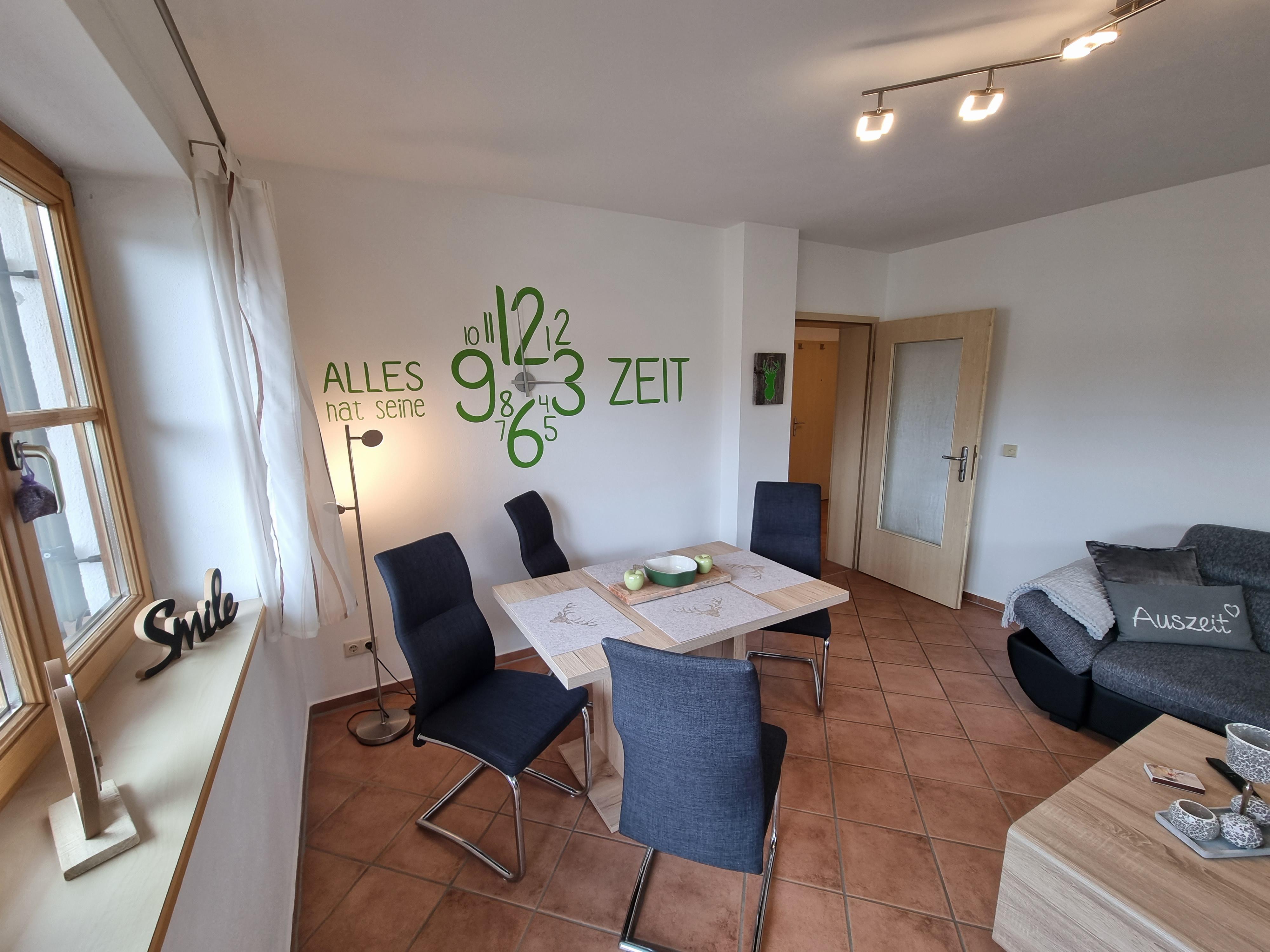 Unsere moderne und lichtdurchflutete Ferienwohnung ist der perfekte Rückzugsort für zwei Personen, die einen unvergesslichen Urlaub in den Bergen suchen. Freuen Sie sich auf einen großzügigen Wohnbereich mit gemütlicher Couch, stilvollem Esstisch und einem beeindruckenden 55-Zoll-Fernseher für entspannte Abende.