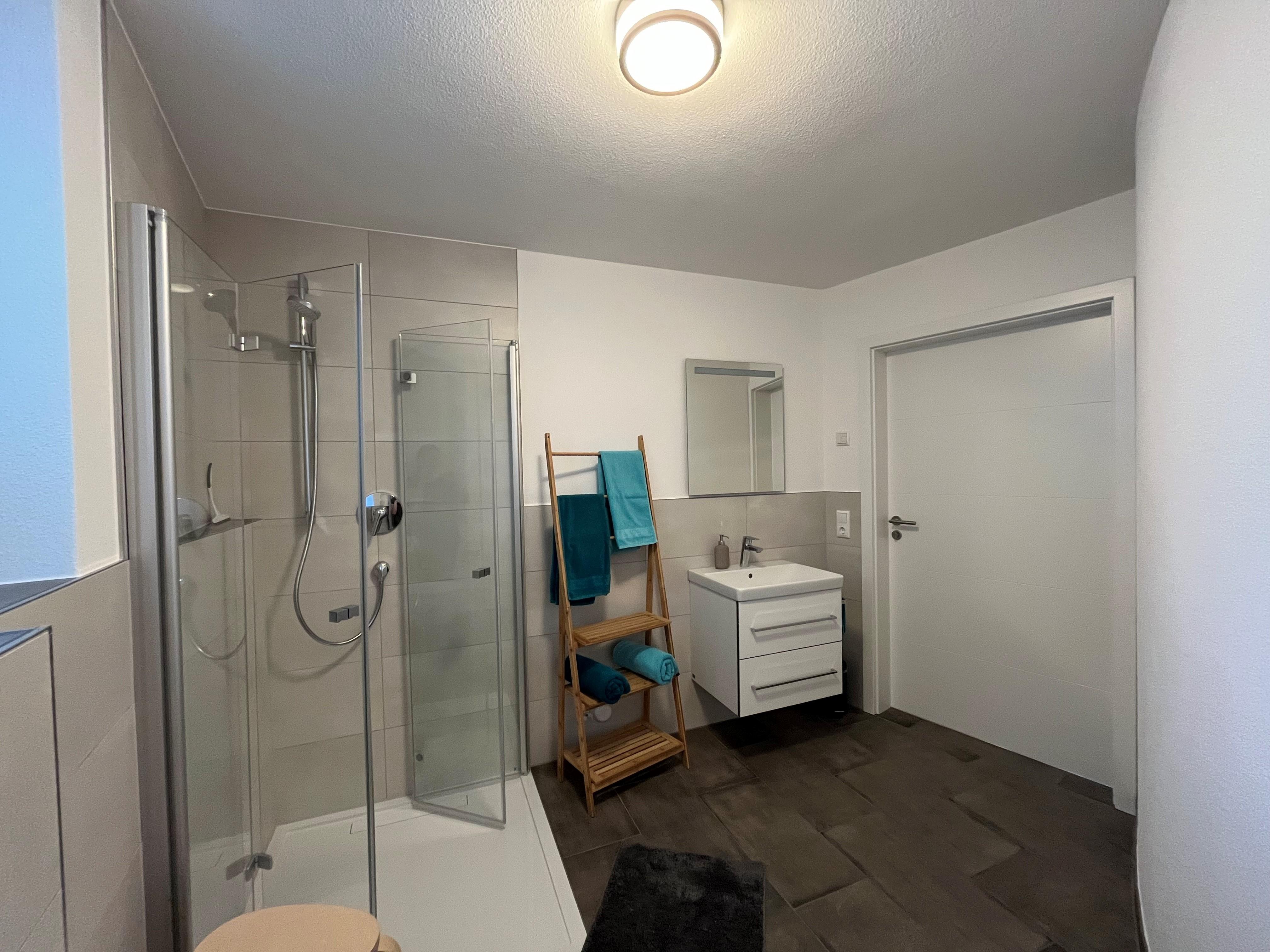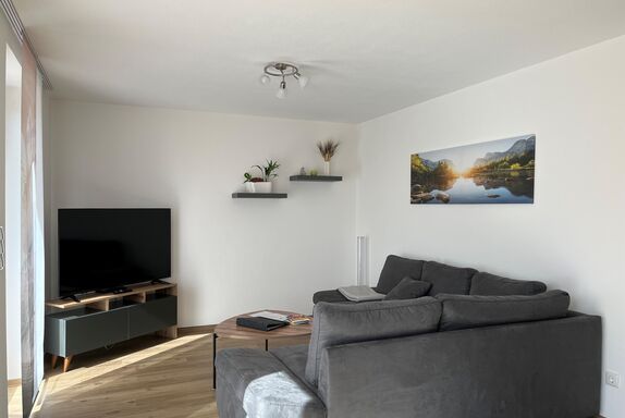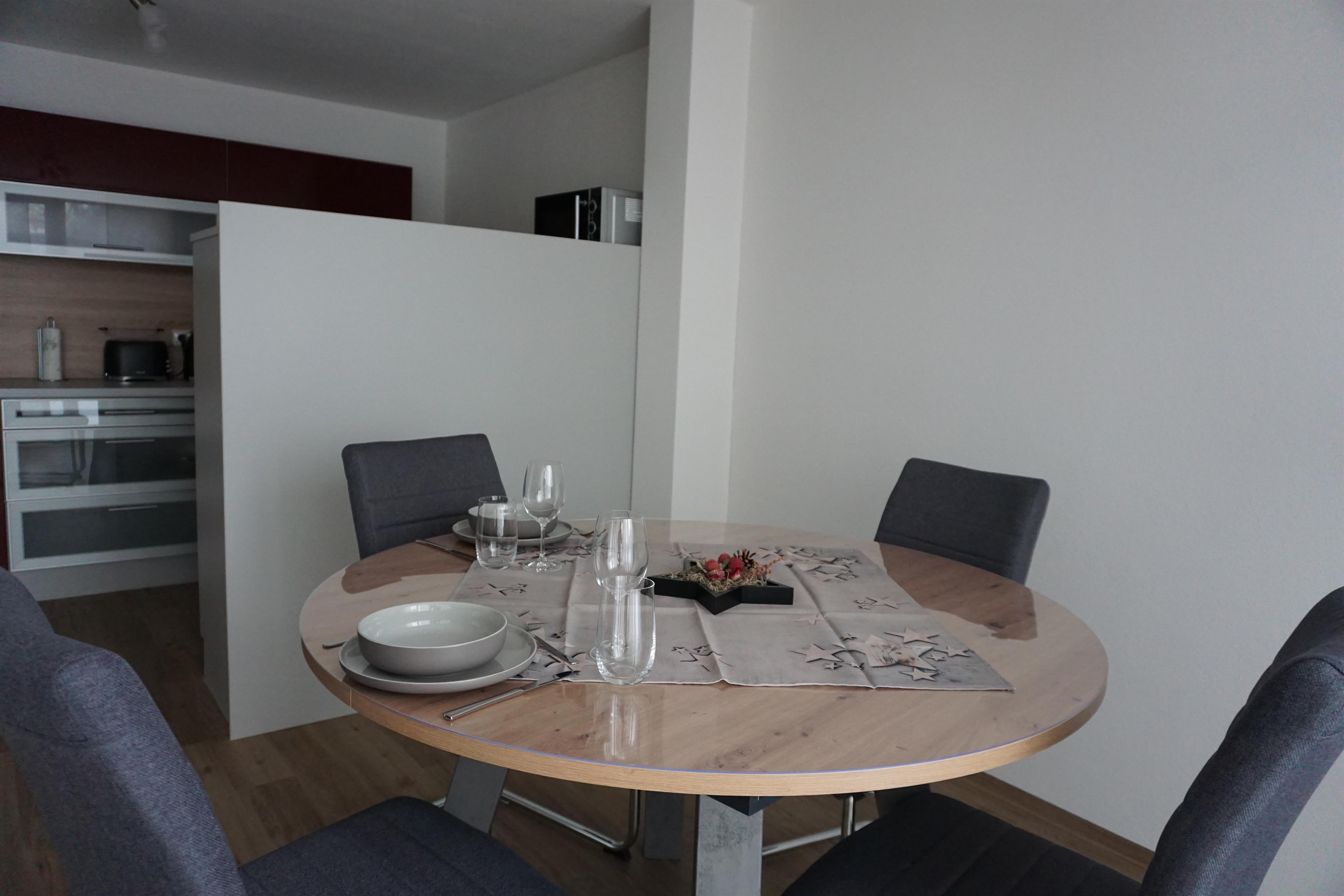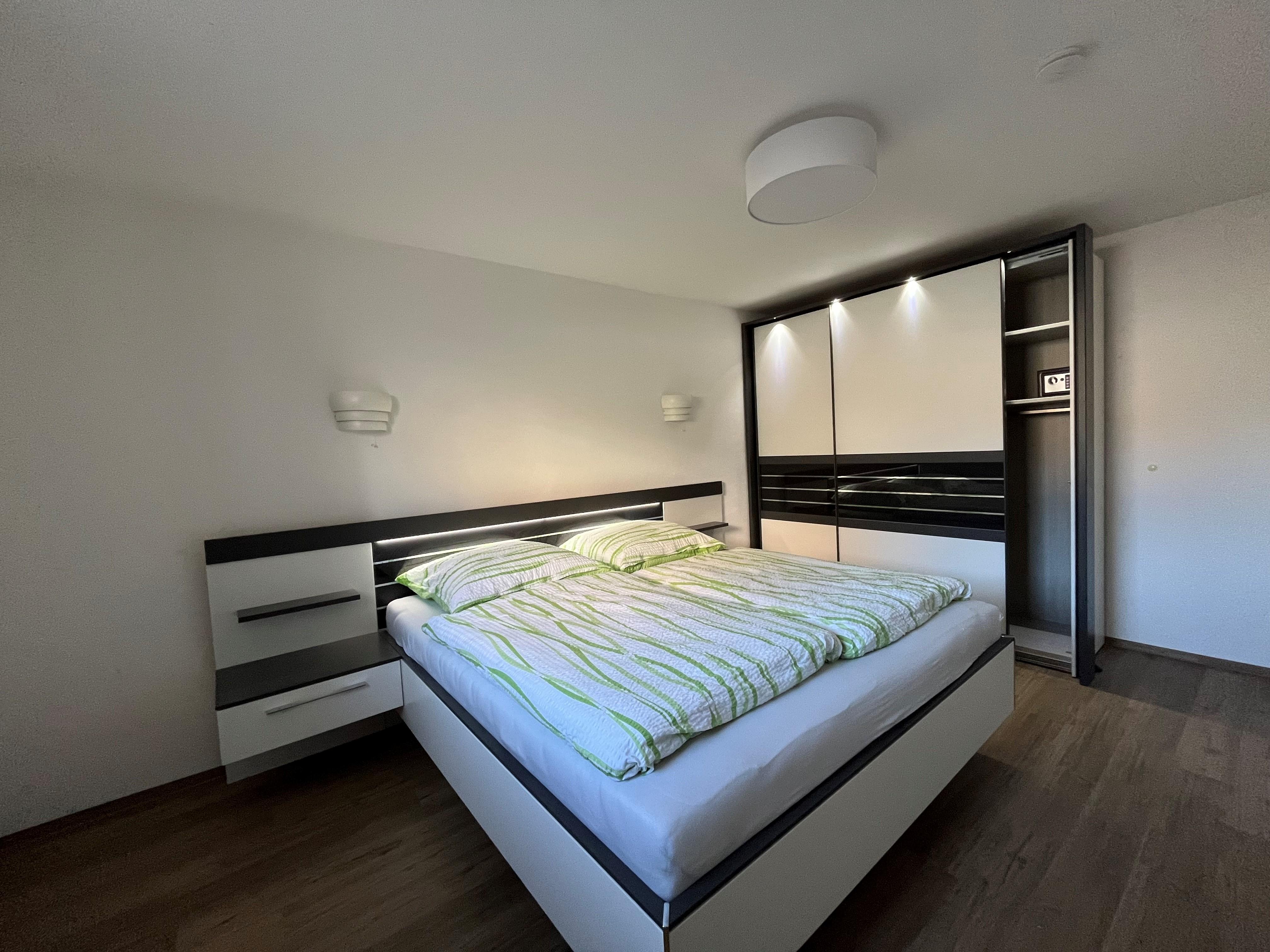 Zimmer und Ausstattung: Es steht ein Schlafzimmer mit Doppelbett und geräumigem Kleiderschrank zur Verfügung, die Wohnküche ist voll ausgestattete mit Kühlschrank inkl. Gefrierfach, Herd (Ceranfeld), Dunstabzug, Geschirrspüler, Backofen, Wasserkocher, Toaster, Kaffeemaschine, Eierkocher, Mikrowelle, Besteck, Geschirr, Gläser, Töpfe und alle gebräuchlichen Küchenutensilien. Vom freundlichen, hellen Wohnzimmer aus gelangen Sie direkt auf Ihre Terrasse. Hier stehen Gartenmöbel für Sie bereit. Ein Flachbild-Fernseher gehört ebenfalls zur Ausstattung dieser Wohnung. Der direkt angrenzende Essbereich bietet Platz für Ihre Mahlzeiten und gemütliche Abende. Im Badezimmer finden Sie eine ebenerdige Dusche und ein WC.