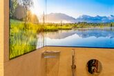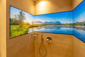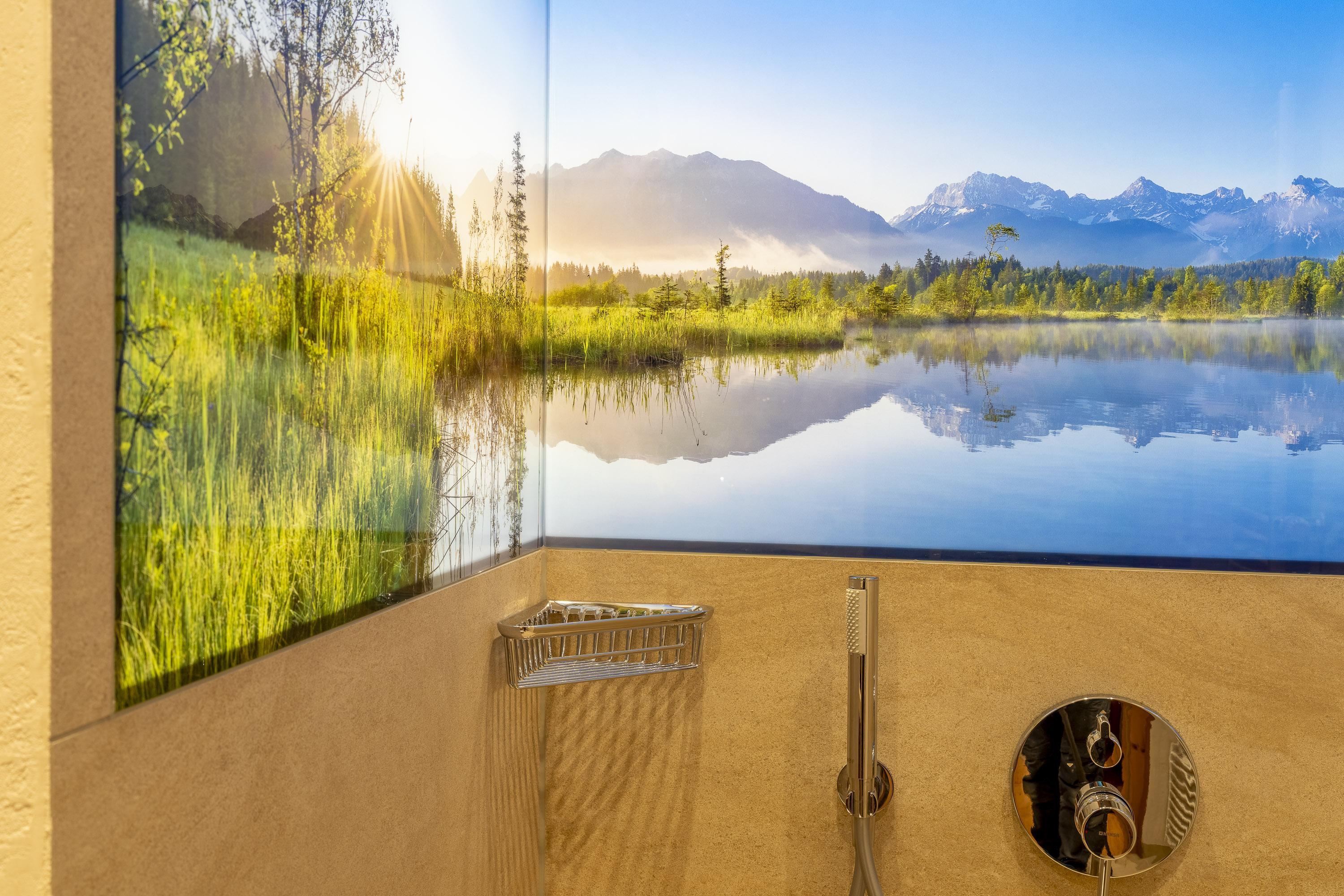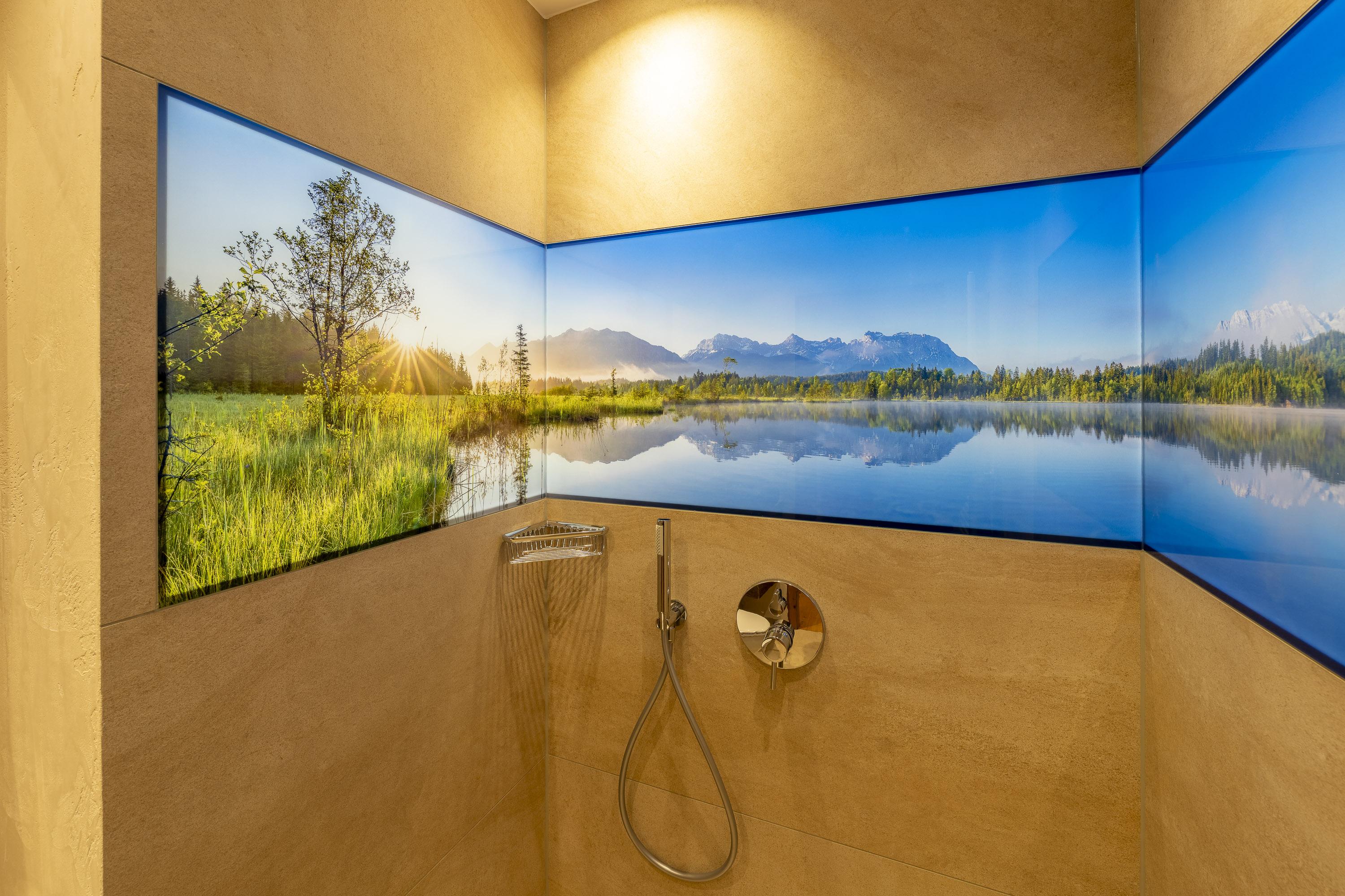 Ein Highlight ist das stilvolle Badezimmer: Naturstein, Altholz und ein hinterleuchtetes LED-Glasbild sorgen für echte Wohlfühlmomente – hier wird selbst die Dusche zur Auszeit vom Alltag.