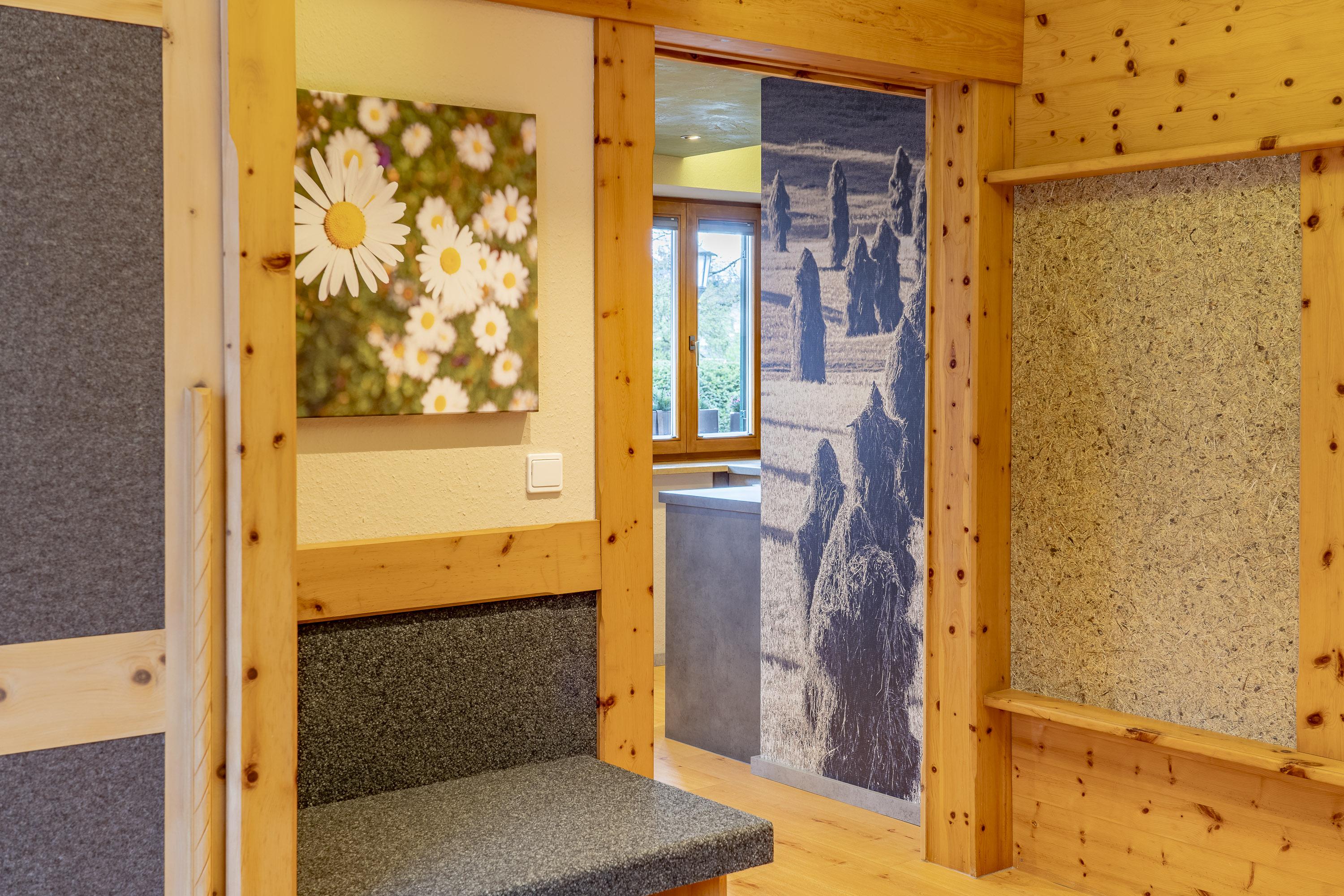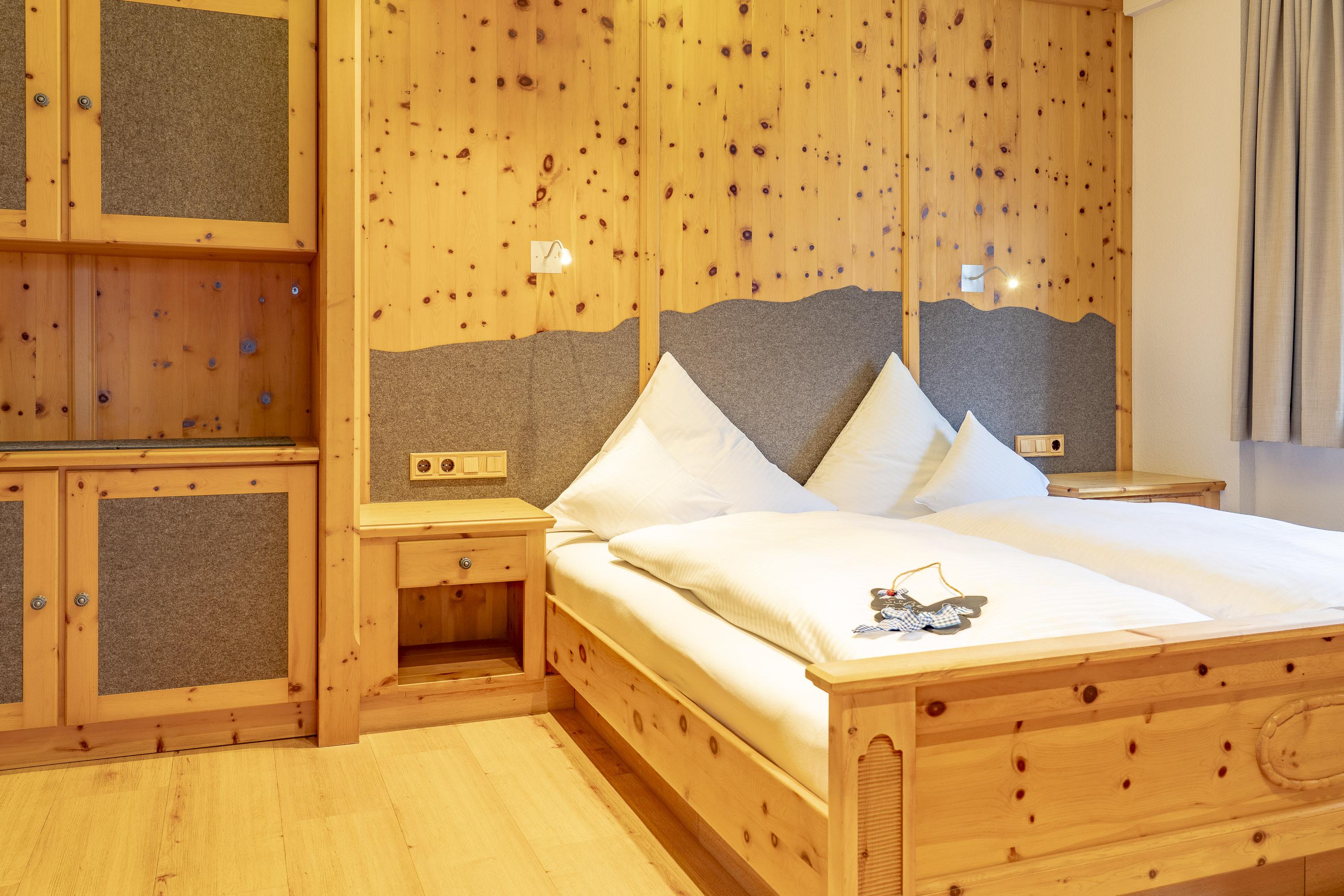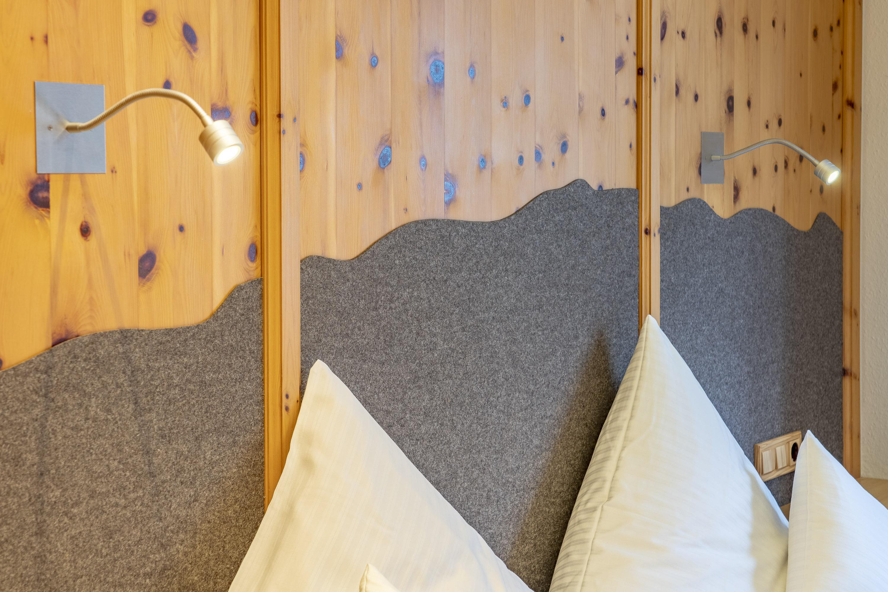 Zirbenholz-Möbel, hochwertiger Lodenfilz und harmonische Naturmaterialien schaffen eine Atmosphäre zum Wohlfühlen – ruhig, warm und kraftspendend.