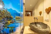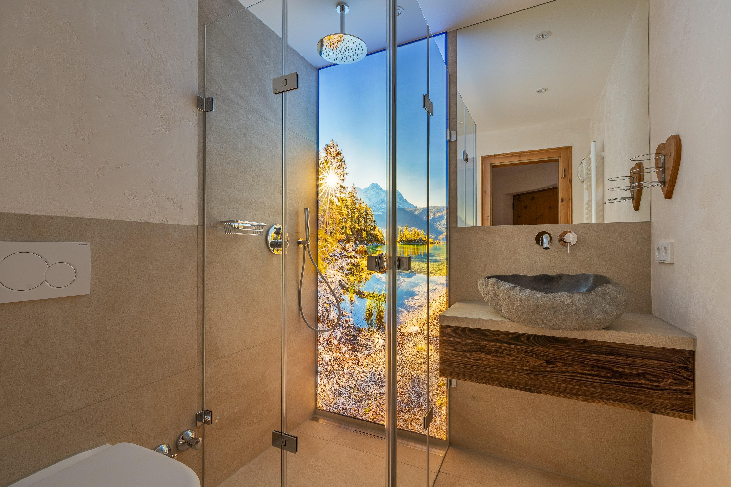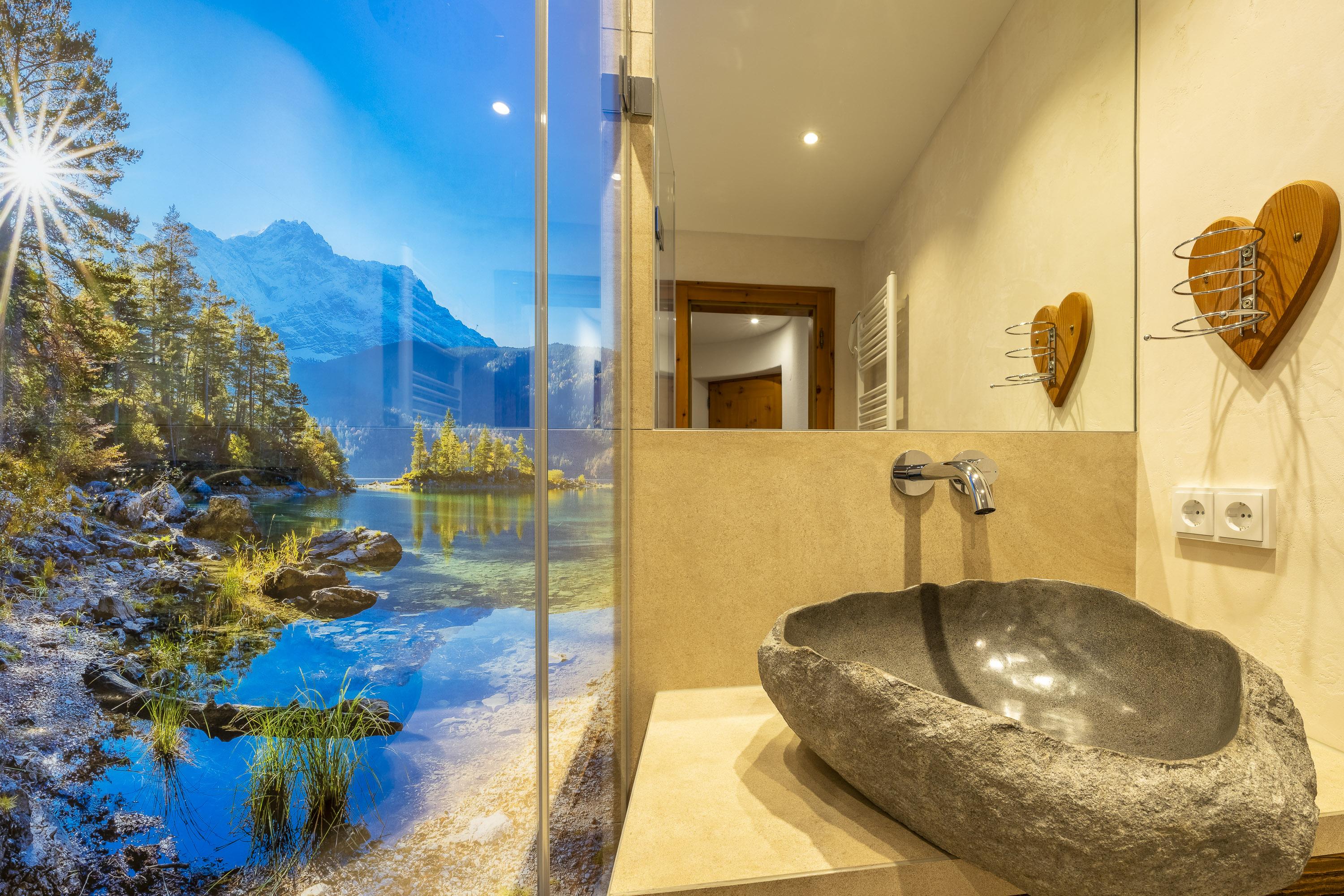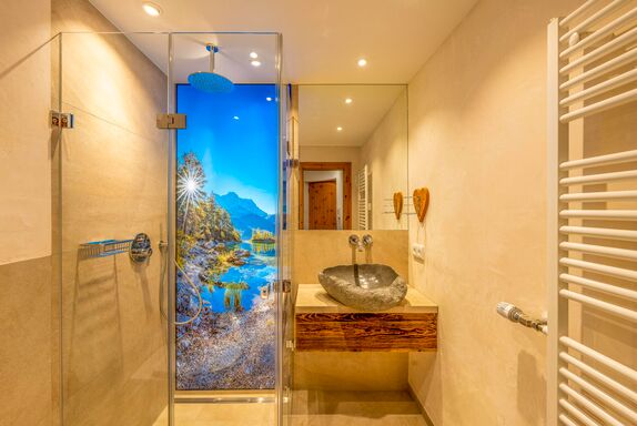 Im stilvollen Badezimmer erwartet Sie pure Erholung: Naturstein, Altholz und ein stimmungsvolles LED-Leuchtbild in der Dusche schaffen eine alpine Wohlfühlatmosphäre – perfekt zum Abschalten und Genießen.