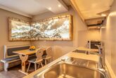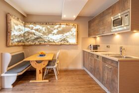 Unsere gemütliche Ferienwohnung Bergfex begrüßt Sie mit einem beeindruckenden, hinterleuchteten Panoramabild der umliegenden Bergwelt – ein Blickfang, der sofort Wanderlust und Natursehnsucht weckt.