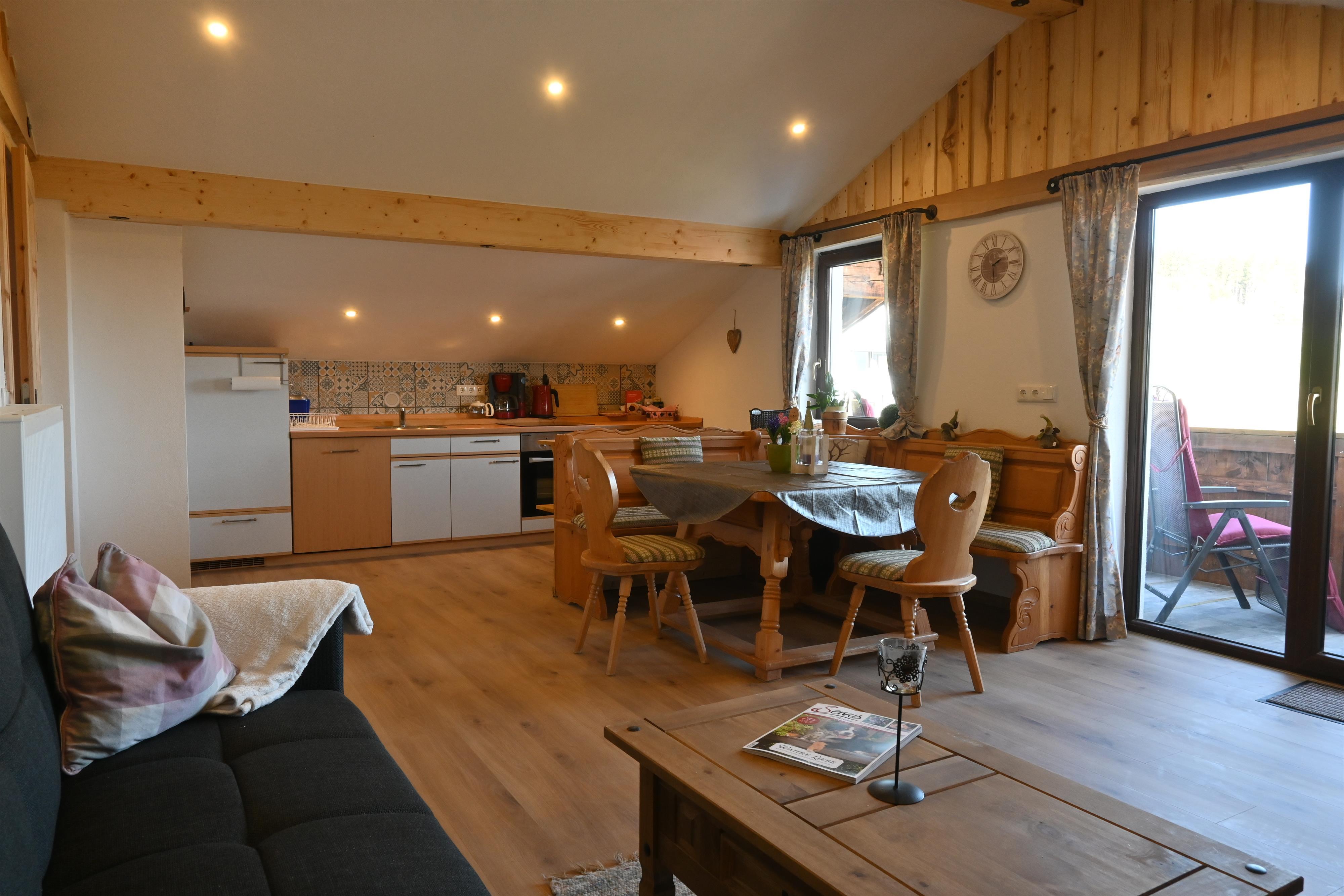 Unsere großzügige Ferienwohnung im Dachgeschoss unseres Landhauses mit über 70 m² Wohnfläche bietet Platz für bis zu 5 Personen. Das gemütliche Wohnzimmer mit Sat-TV, Radio/CD-Player und einer ausziehbaren Doppelbettcouch lädt zum Verweilen ein. Die komplett ausgestattete Küche lässt keine Wünsche offen. Die Ferienwohnung verfügt über zwei separate Schlafzimmer. Das geräumige Badezimmer mit Dusche und WC rundet das Gesamtbild ab. Vor allem im Sommer können Sie entspannte Abende auf unserem Balkon mit Blick auf die Allgäuer Bergkette und das Schloss Neuschwanstein verbringen. Das WLAN und den Parkplatz vor dem Haus können Sie gerne kostenfrei nutzen. Wir freuen uns darauf, Sie in unserer Wohnung begrüßen zu dürfen!