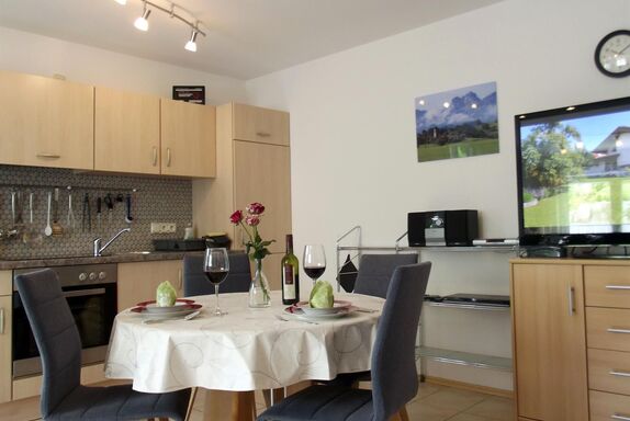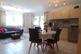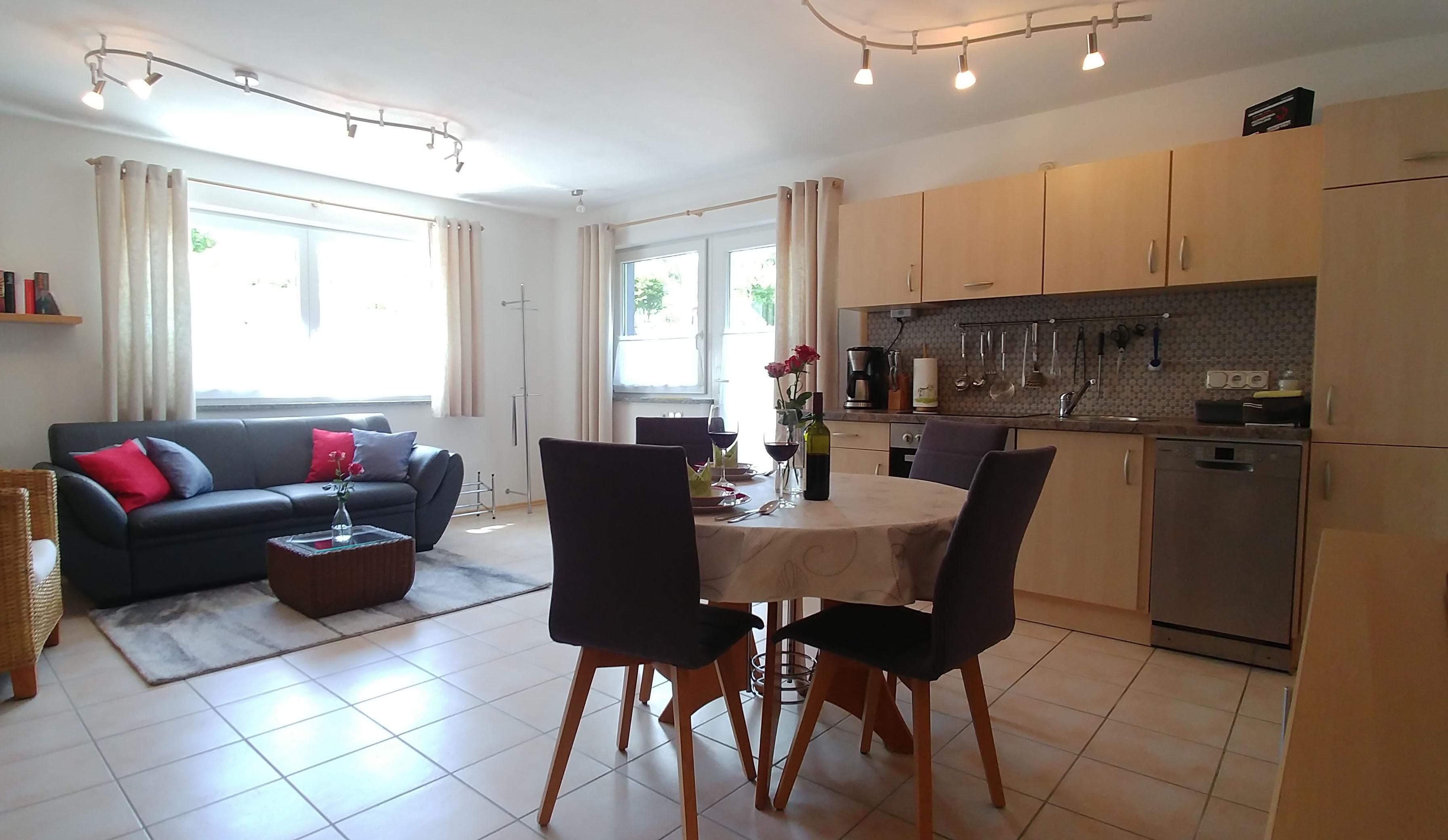 Gemütliche 4-Sterne-Ferienwohnung mit Wohnküche (Spülmaschine, Kaffeemaschine, Toaster, Wasserkocher, Eierkocher, Flachbildfernseher), Schlafzimmer (Safe, 1 m breite Betten, Fußende der Betten offen), Bad mit ebenerdiger Dusche und WC, sep. Eingang mit kleiner Terrasse. Komplette Kleinkindausstattung vorhanden. Gartenmöbel, Telefon, Internetzugang.