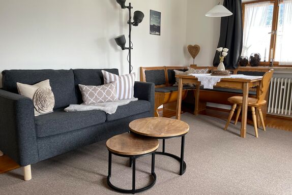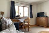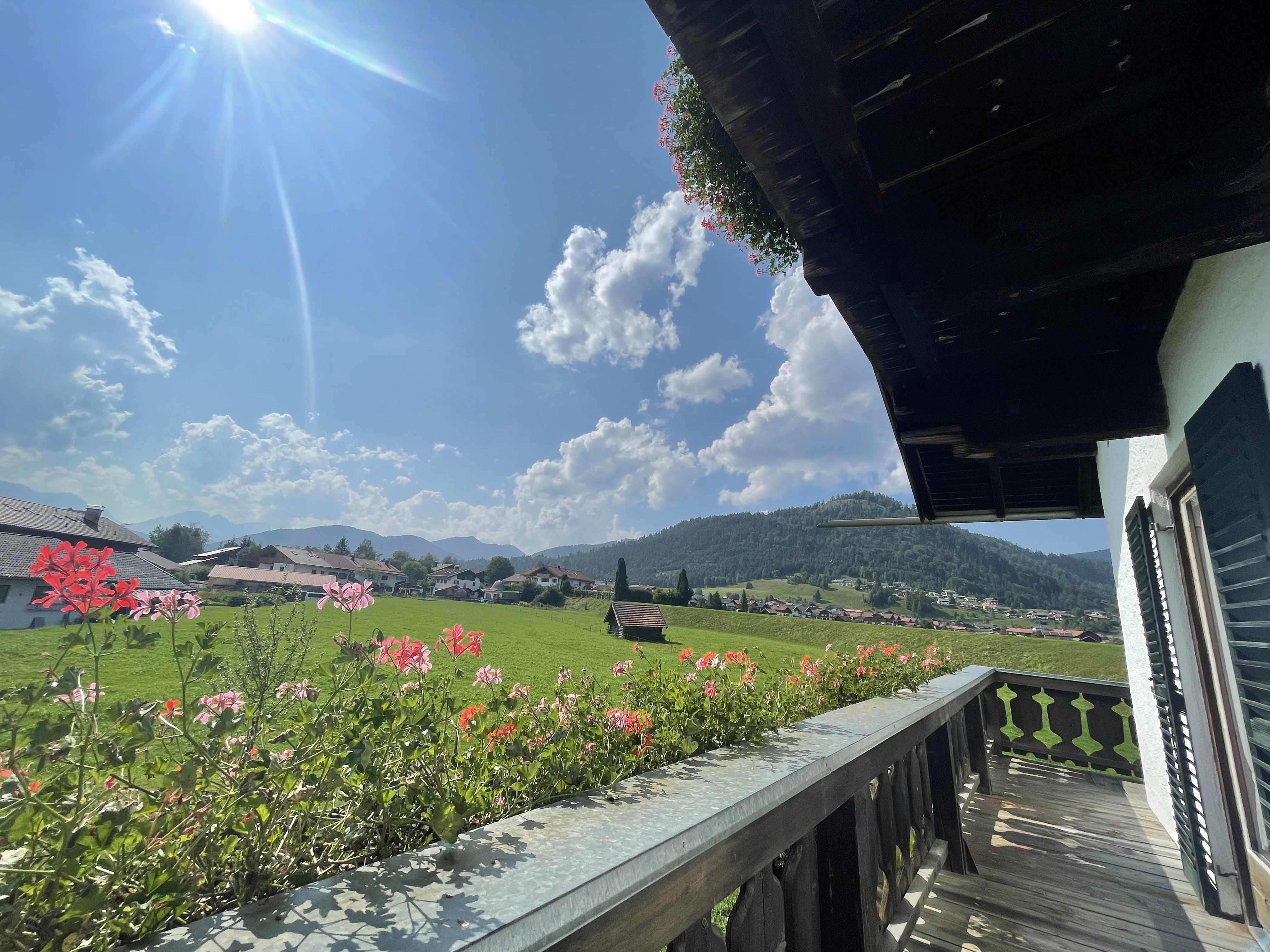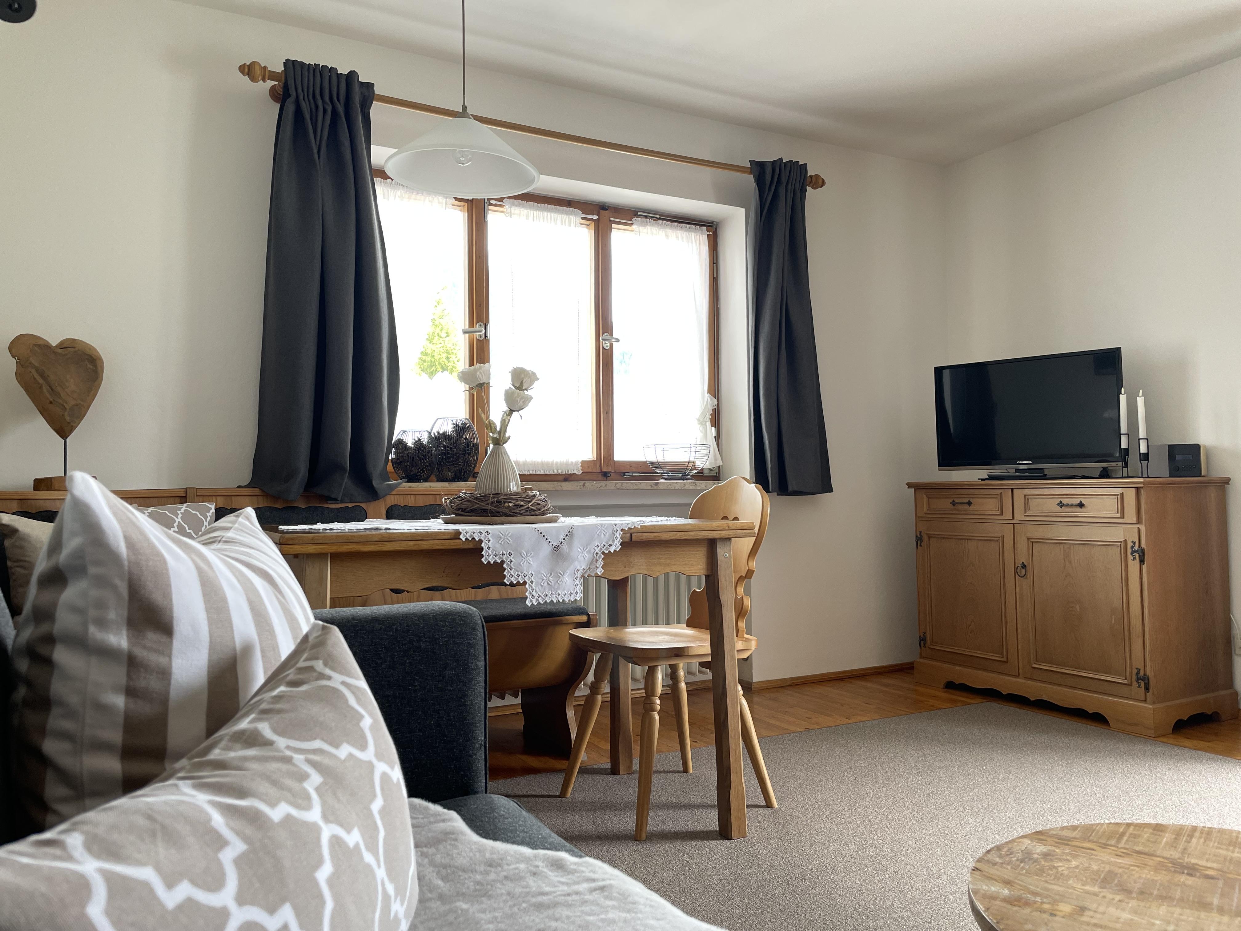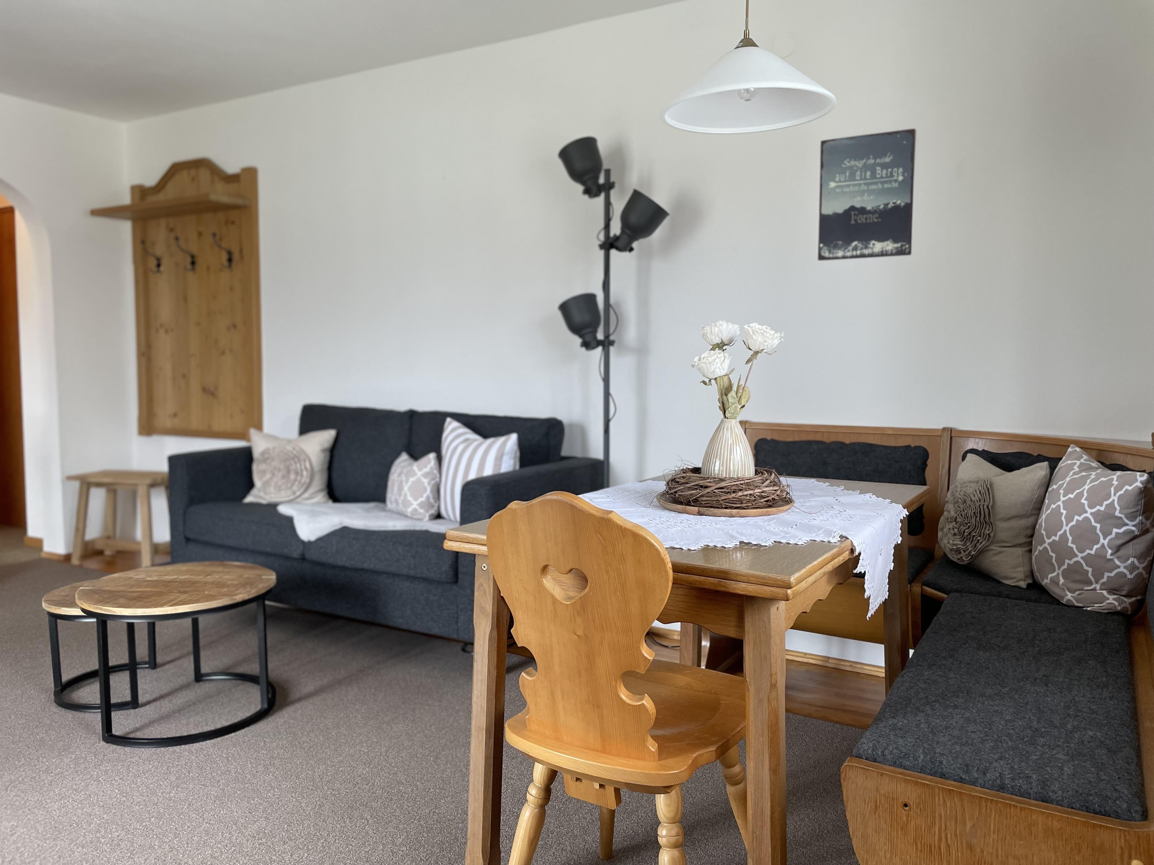 Ferienwohnung Landlust : Gemütlich eingerichtete Ferienwohnung im 1. Stock für 2 Personen mit großen Ost-, Süd- und Westbalkon, Balkonmöbeln und herrlichem Gebirgsblick, seperatem Schlafzimmer, Dusche/WC, Wohnküche mit Eckbank, Couch, DAB-Radio mit Bluetooth, Digitalem TV, W-Lan und komplett eingerichteter Küchenzeile.