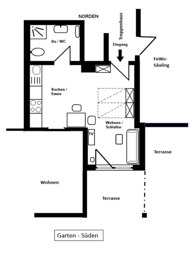 Appartement Thaneller mit Wohn/Schlafraum, Kochzeile, Dusche/WC, Südterrasse im Gartengeschoss (Hanglage)mit Blick auf die Lechtaler Alpen, Sat-TV, Stereoanlage.Leistungen der KönigsCard