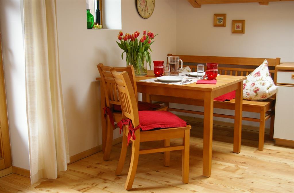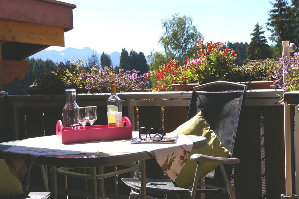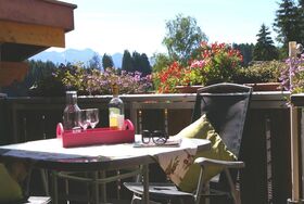 Atelierwohnung Aggenstein mit 1 Schlafzimmer, Wohn-Essraum, Kochzeile mit Geschirrspüler, Dusche/WC, Westbalkon mit Blick auf die Allgäuer Alpen und Schloss Neuschwanstein, Sat-TV, Stereoanlage, Telefon und Tresor.