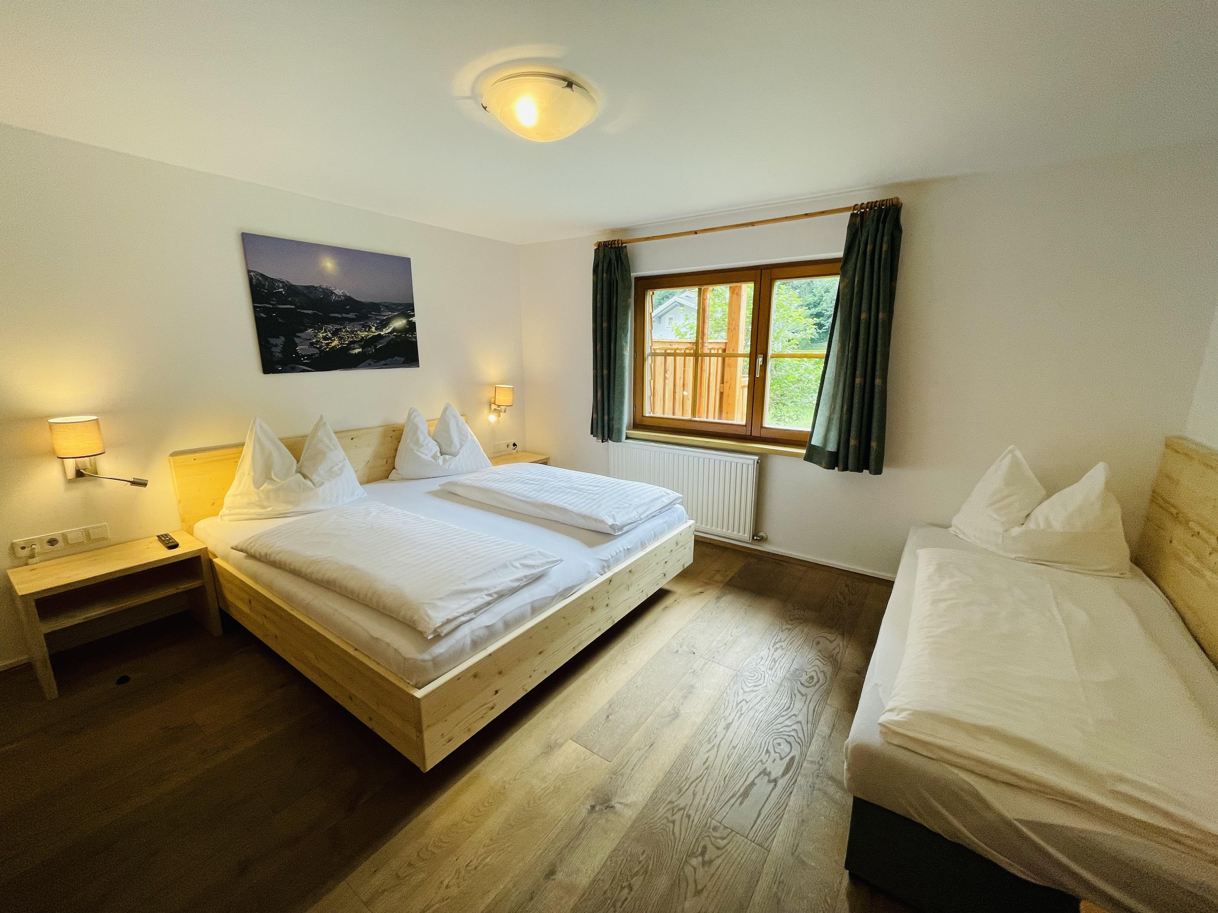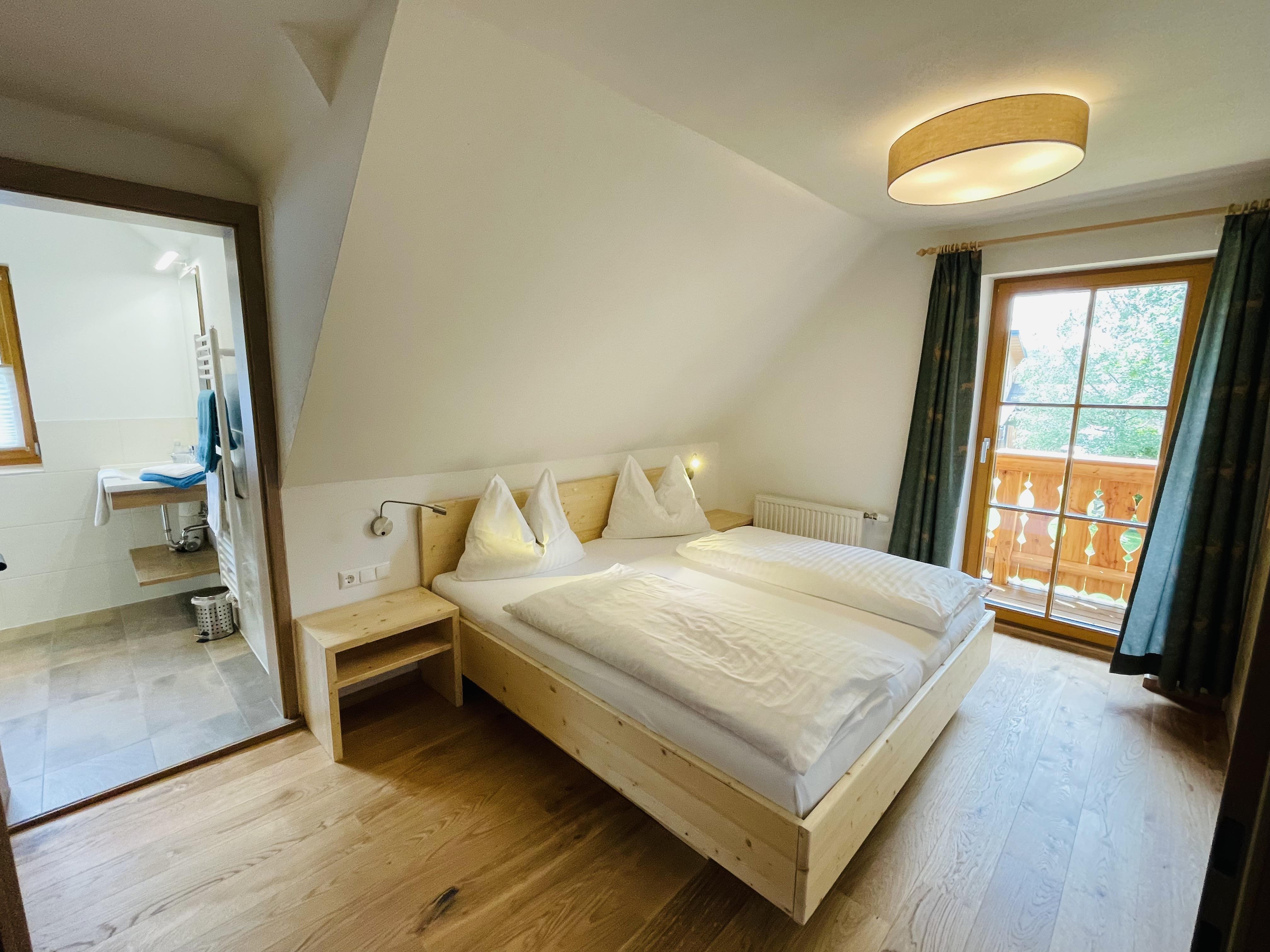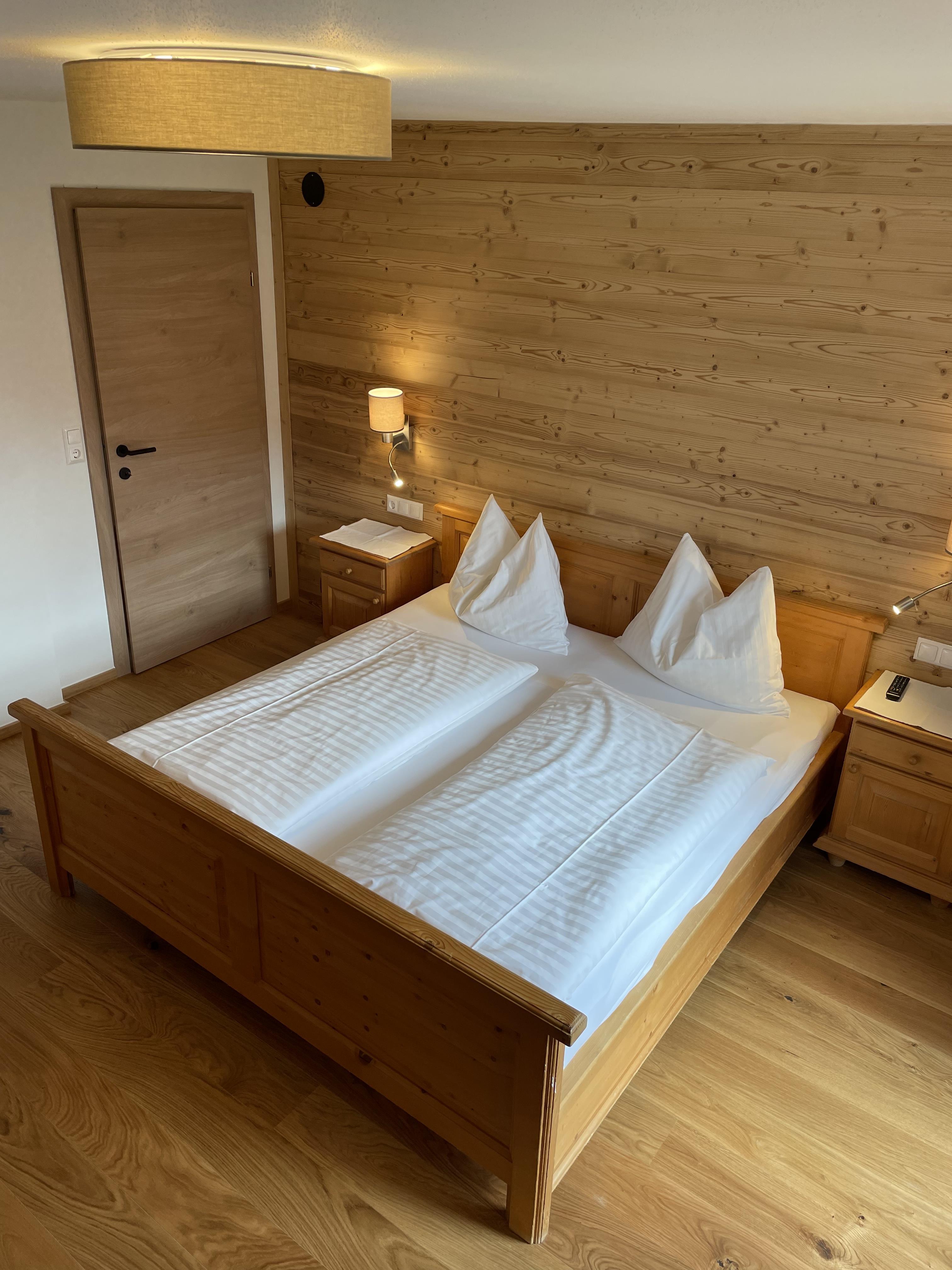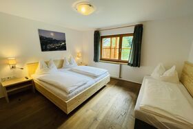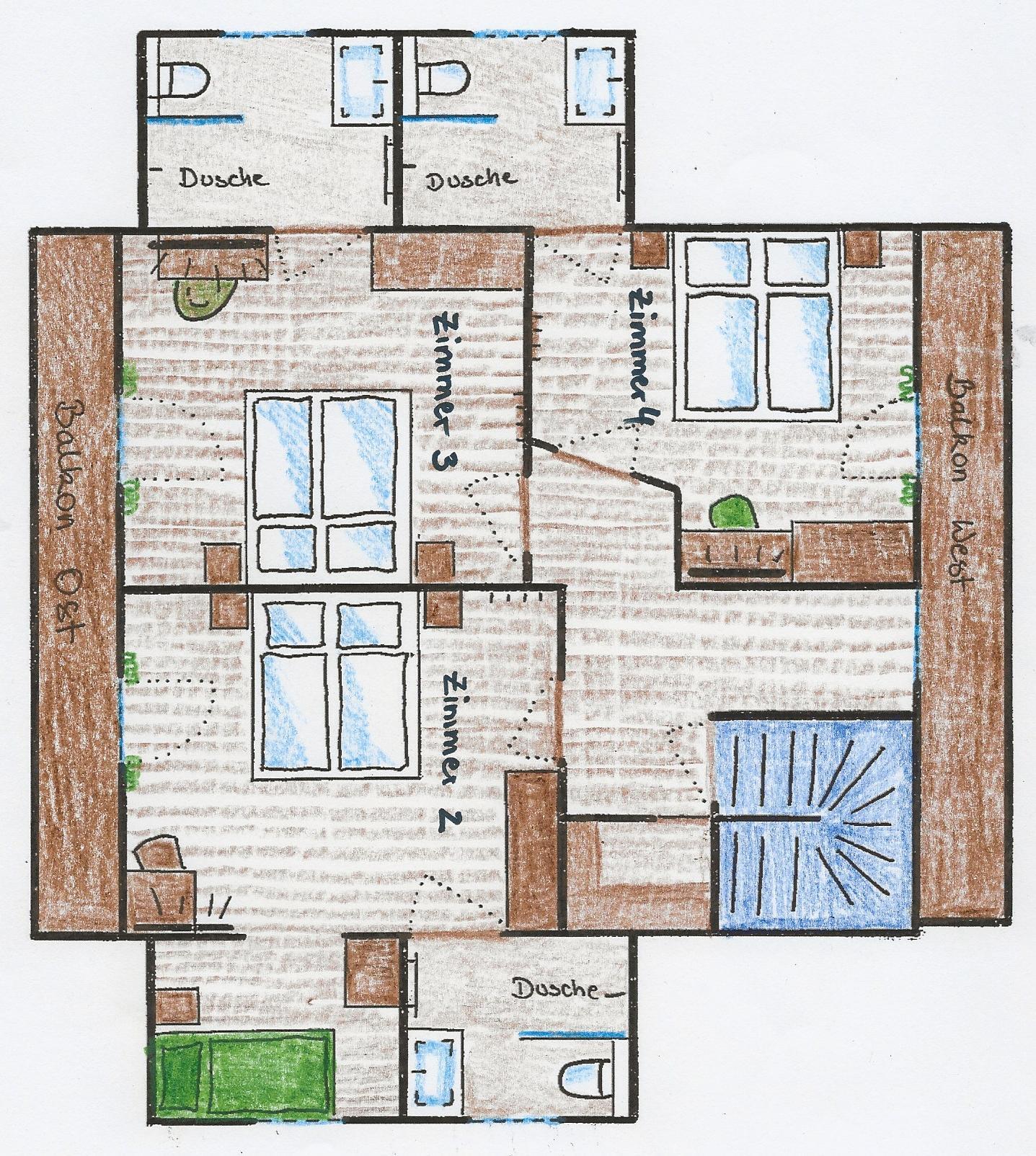 Obergeschoss: 1 Schlafzimmer mit Doppelbett, Einzelbett, TV, Balkon und Bad mit Dusche/WC (Osten), 1 Schlafzimmer mit Doppelbett, TV, Bad mit Dusche/WC und Balkon (Osten), 1 Schlafzimmer mit Doppelbett, TV, Bad mit Dusche/WC und Balkon (Westen)