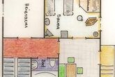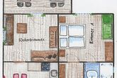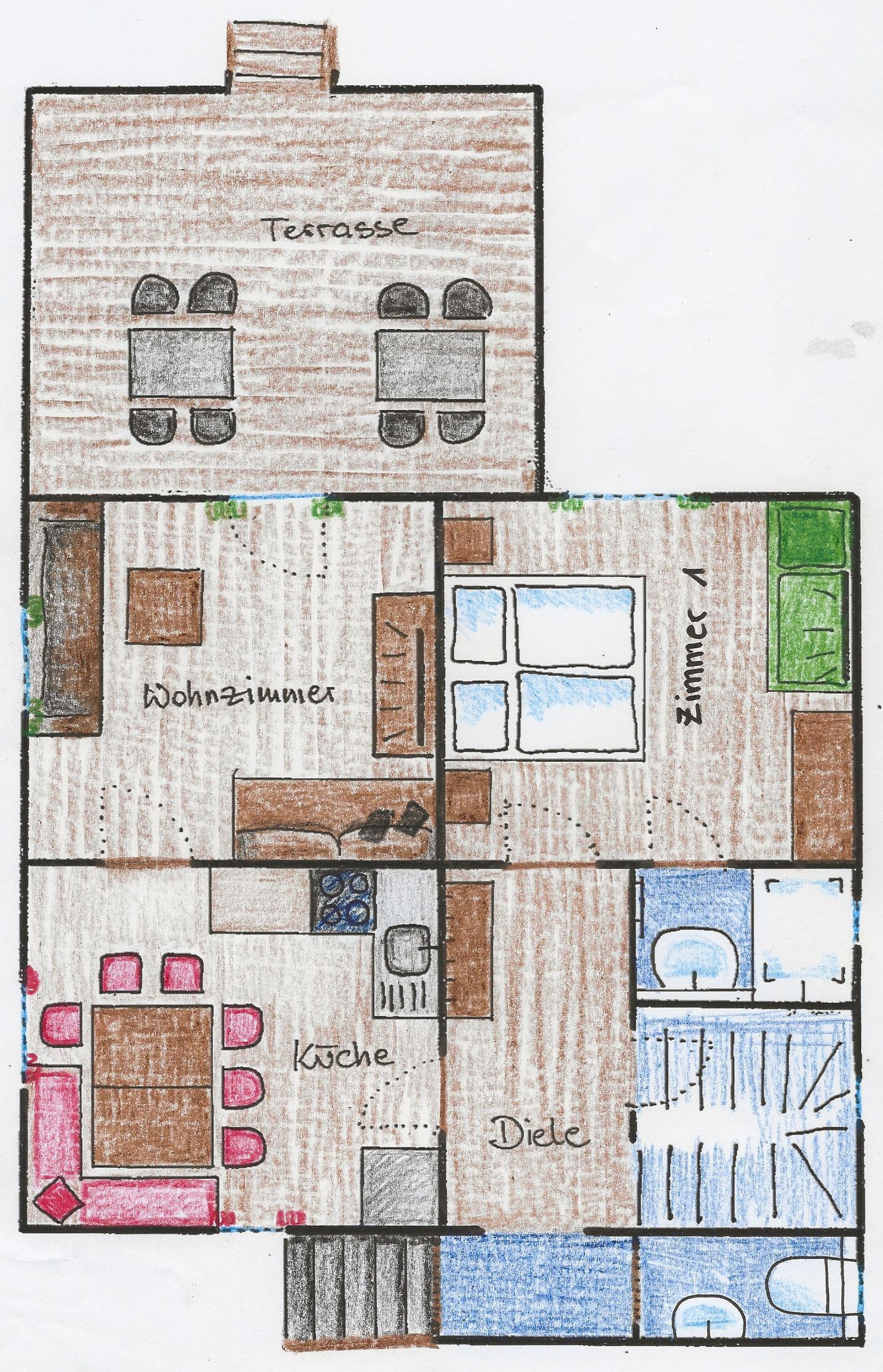 Erdgeschoss: Küche, Wohnzimmer mit TV, Diele, Schlafzimmer mit Doppelbett und Einzelbett, Dusche, WC, Terrasse (Süden) und Garten