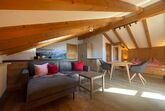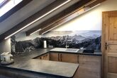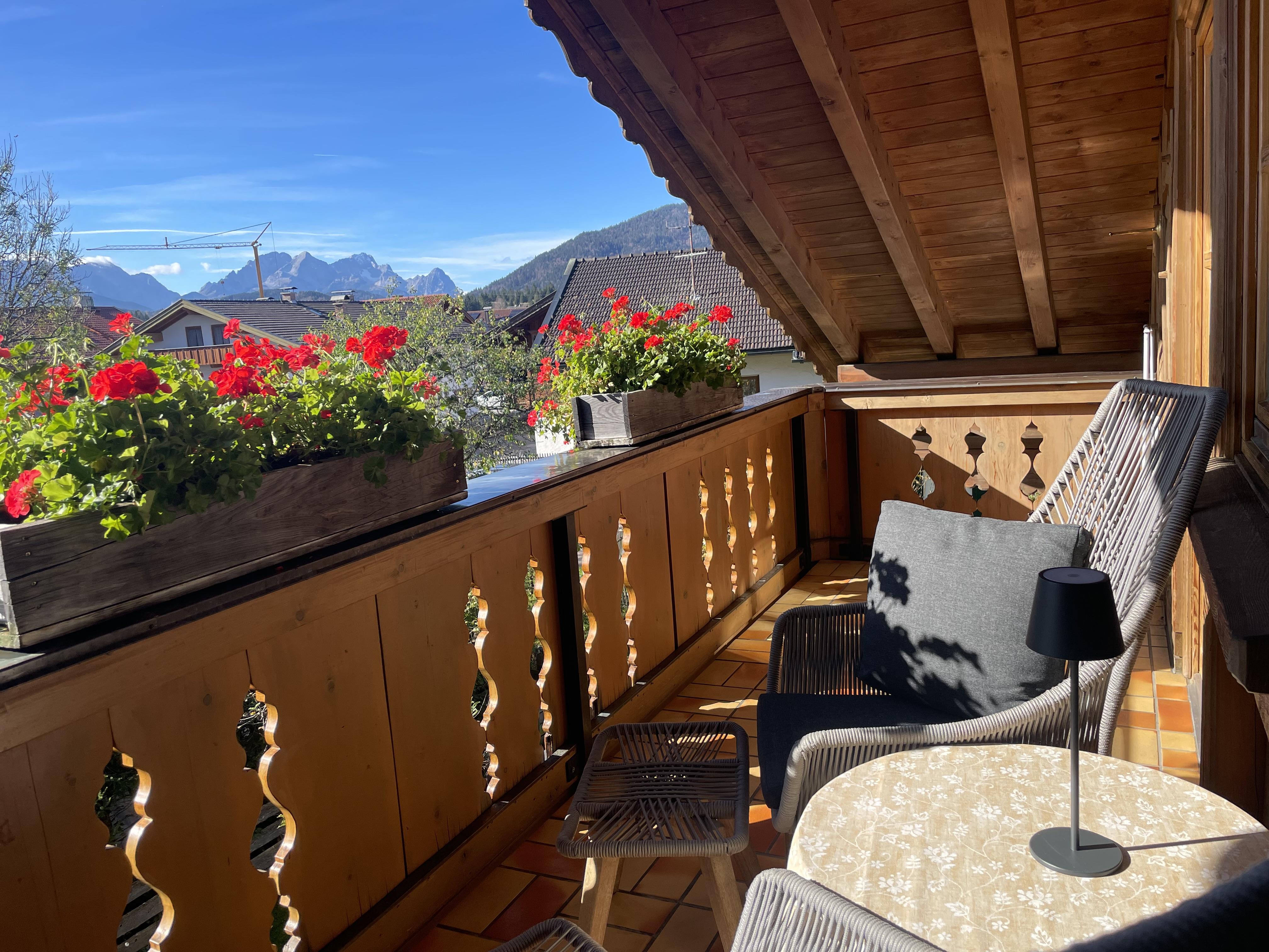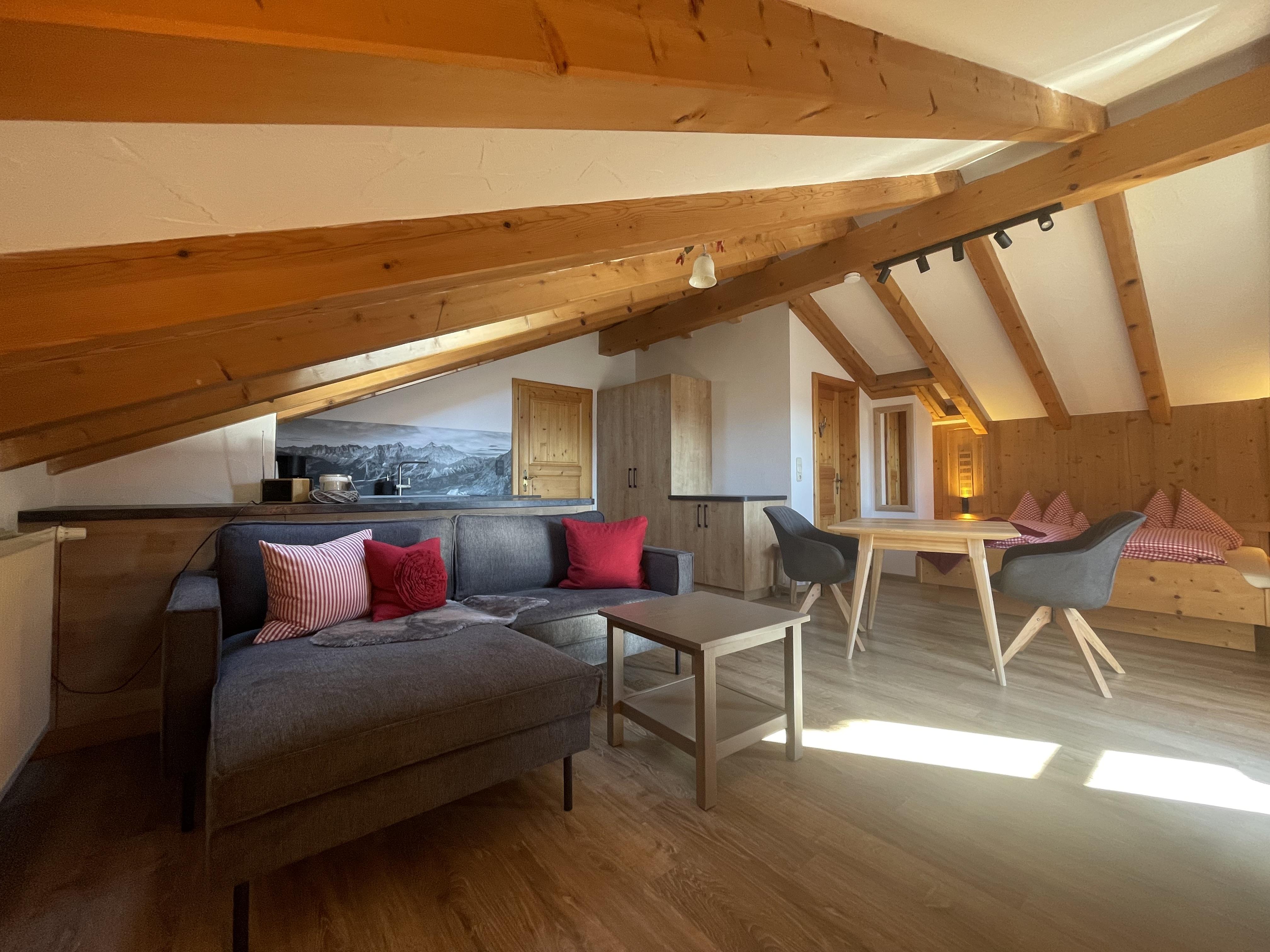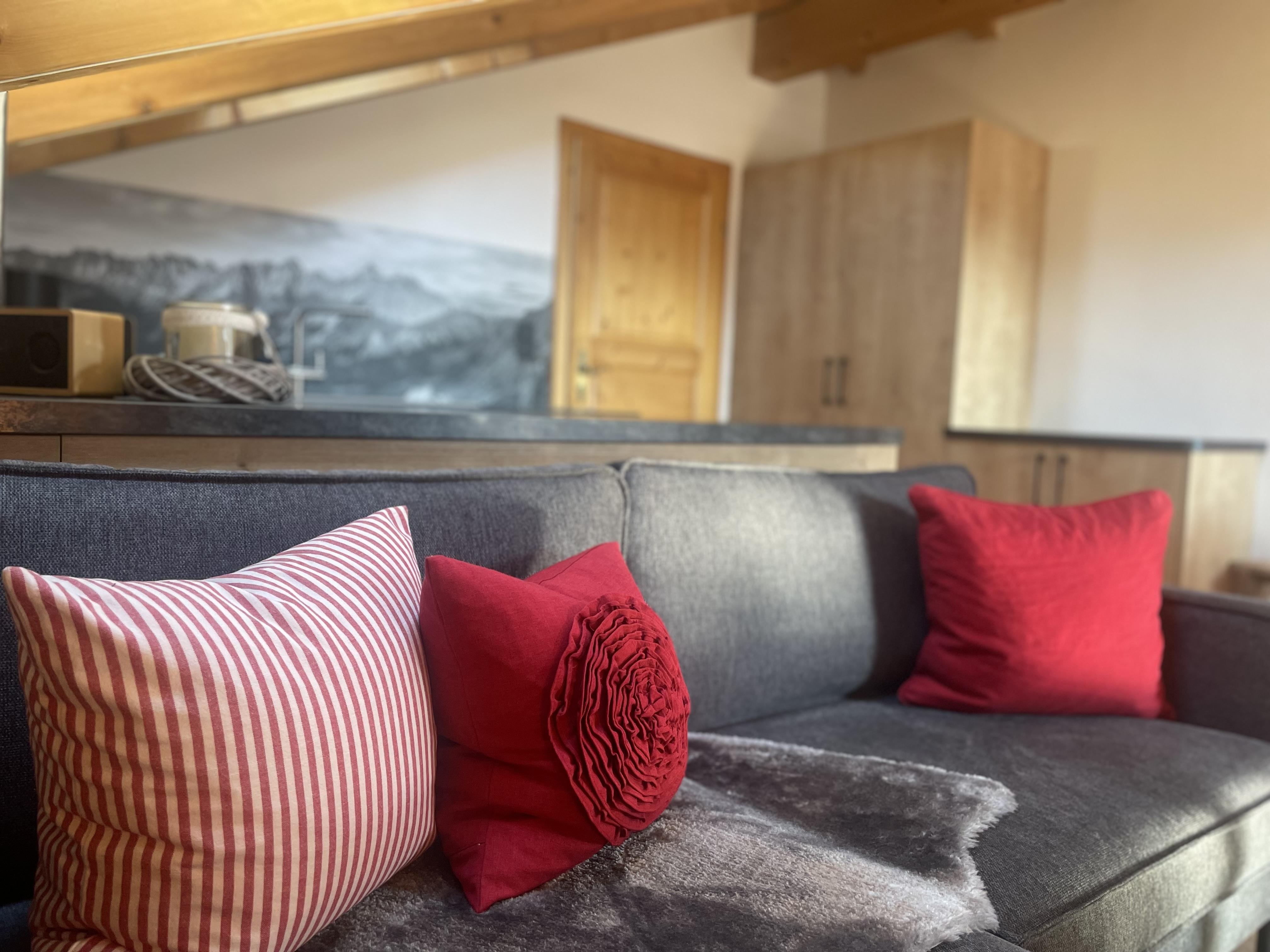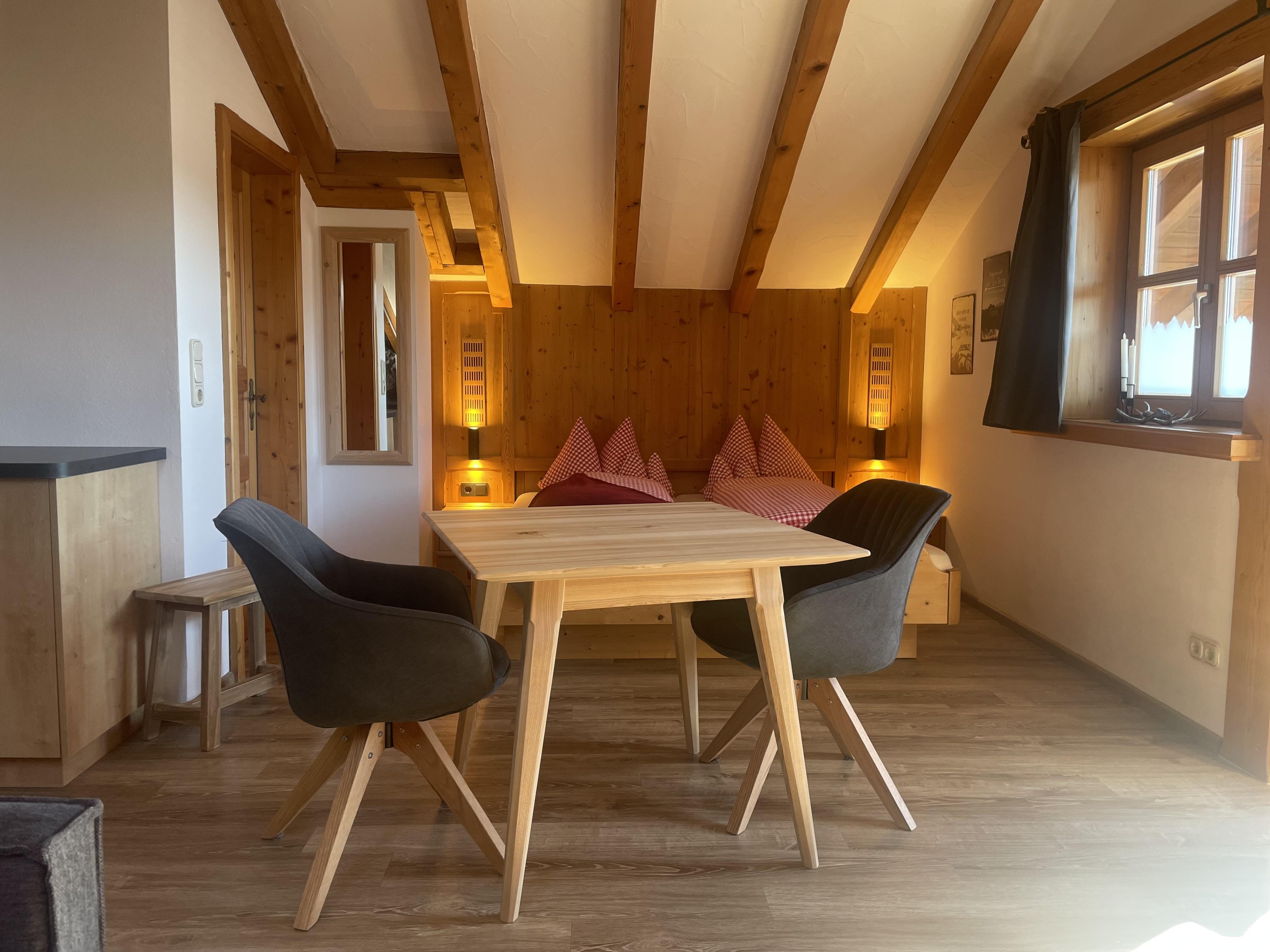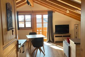 Ferienwohnung Platzhirsch: Gemütlich eingerichtete Ferienwohnung im 2. Stock für 2 Personen mit kombiniertem Wohn- Schlafraum, Südbalkon und herrlichem Gebirgsblick, Balkonmöbeln, Dusche/WC, Digitalem TV, neue Küche mit Bergblick und Spülmaschine.