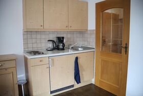 Die Küchenzeile bietet 2 Platten, Kühlschrank, Kaffeemaschine und Wasserkocher.