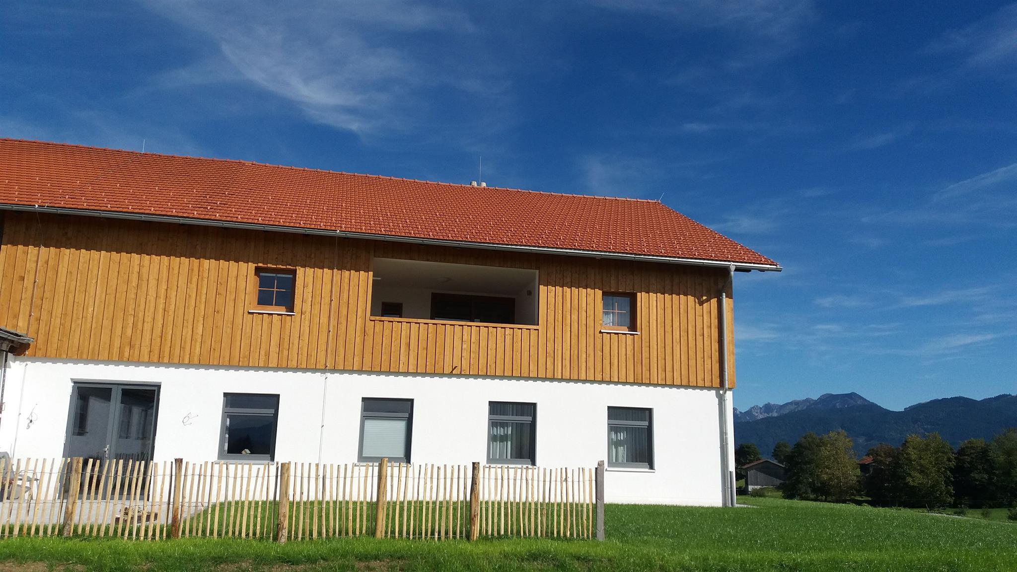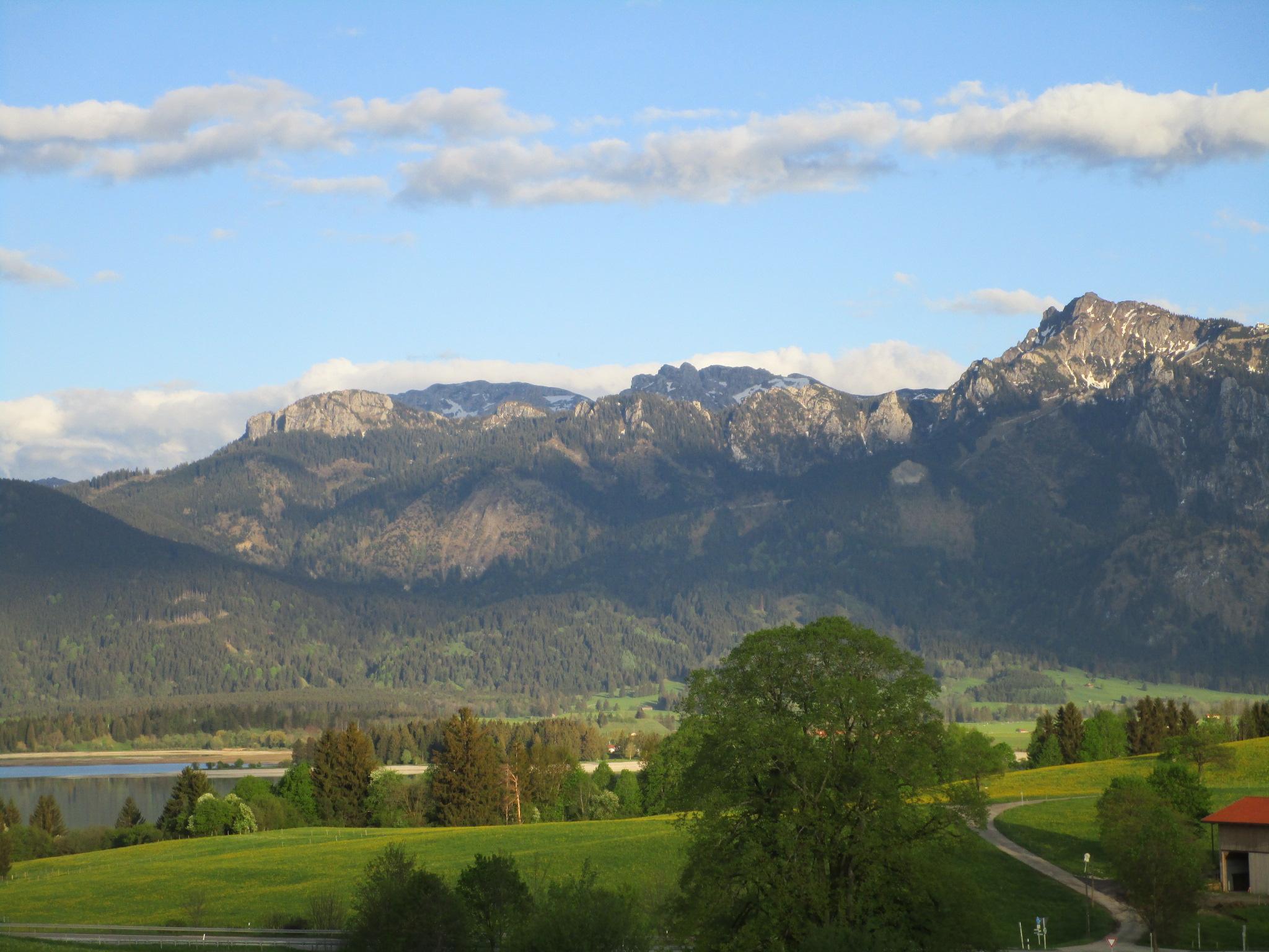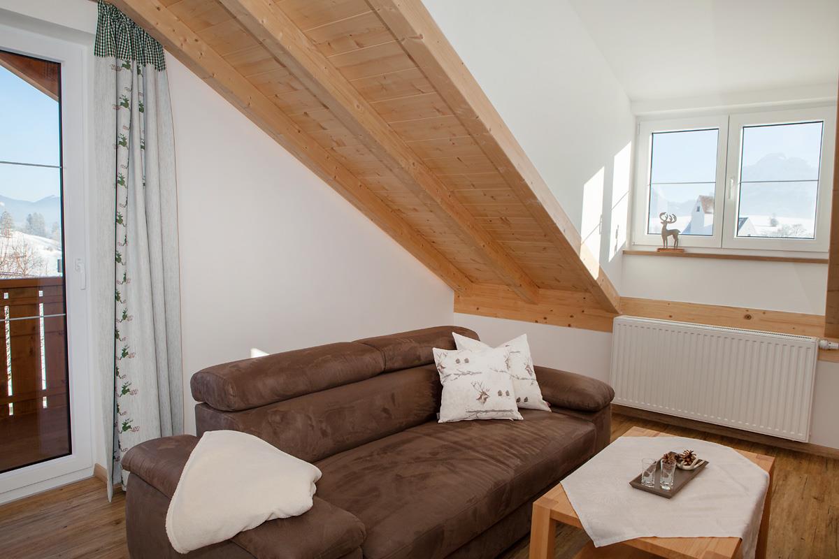 Unsere großzügige 5-Sterne-Ferienwohnung Forggensee (87 qm) ist im Bauernhaus im 2. Stock. Sie ist bestens geeignet für 2 bis 4 Personen. Es gibt zwei Schlafzimmer mit je einem Doppelbett. In der gemütlichen Wohnküche gibt es eine voll ausgestattete Küchenzeile (Spülmaschine, Backofen, Kaffeemaschine, Wasserkocher etc.), einen Esstisch, zwei Sofas und einen Flachbild-TV. Über dem Sichtdachstuhl haben Sie einen schönen Blick auf den Säuling und Tegelberg. Vom Balkon können Sie den atemberaubenden Blick auf die Ammergauer Berge und den Forggensee genießen. Das Badezimmer ist mit einer Regendusche und WC ausgestattet.