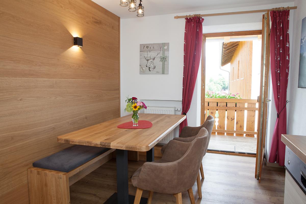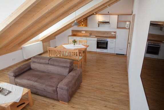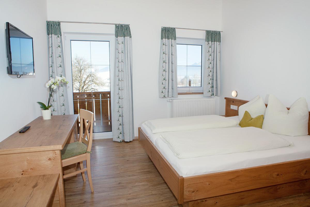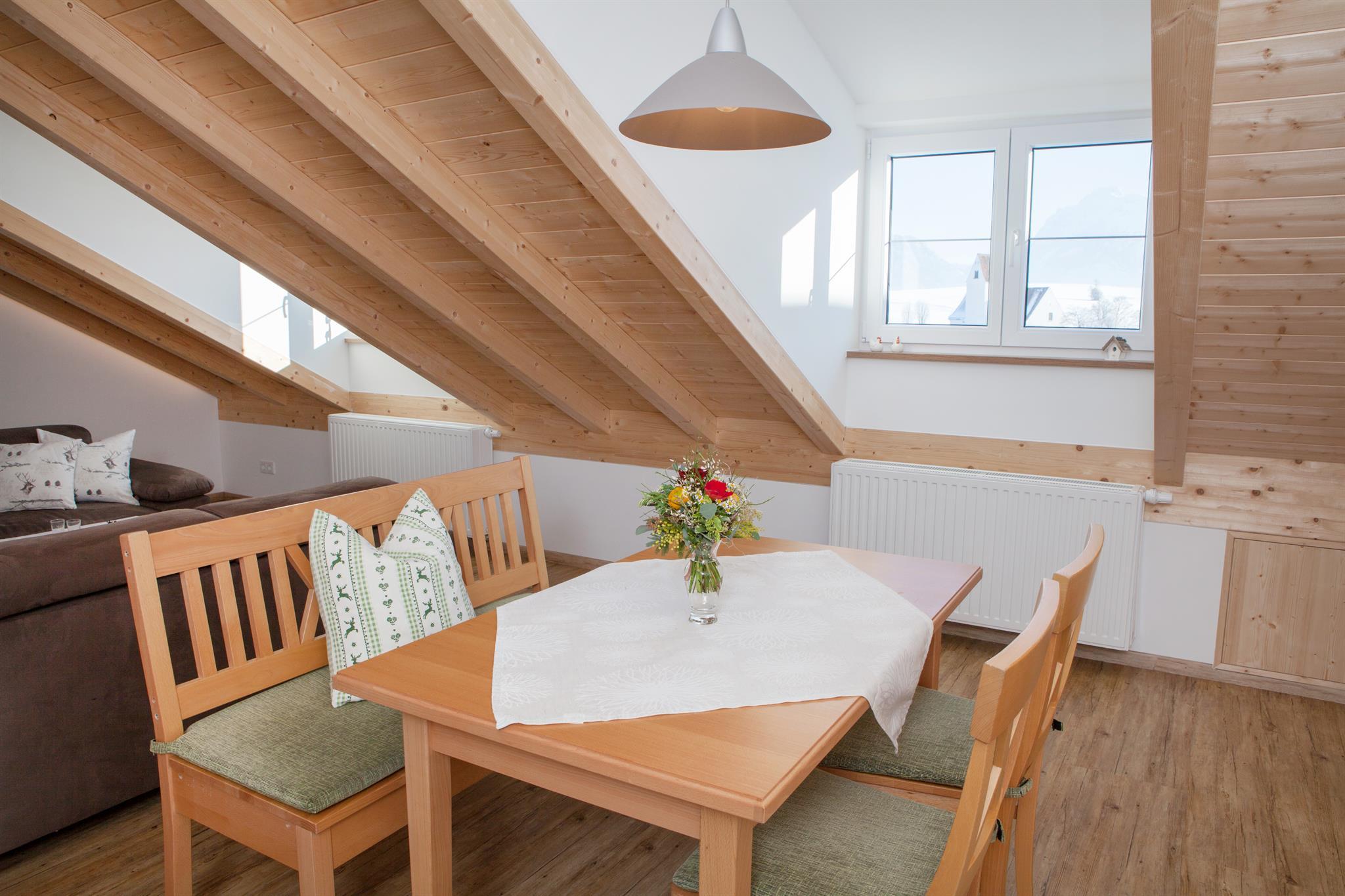 Unsere großzügige 5-Sterne-Ferienwohnung Forggensee (87 qm) ist im Bauernhaus im 2. Stock. Sie ist bestens geeignet für 2 bis 4 Personen. Es gibt zwei Schlafzimmer mit je einem Doppelbett. In der gemütlichen Wohnküche gibt es eine voll ausgestattete Küchenzeile (Spülmaschine, Backofen, Kaffeemaschine, Wasserkocher etc.), einen Esstisch, zwei Sofas und einen Flachbild-TV. Über dem Sichtdachstuhl haben Sie einen schönen Blick auf den Säuling und Tegelberg. Vom Balkon können Sie den atemberaubenden Blick auf die Ammergauer Berge und den Forggensee genießen. Das Badezimmer ist mit einer Regendusche und WC ausgestattet.