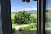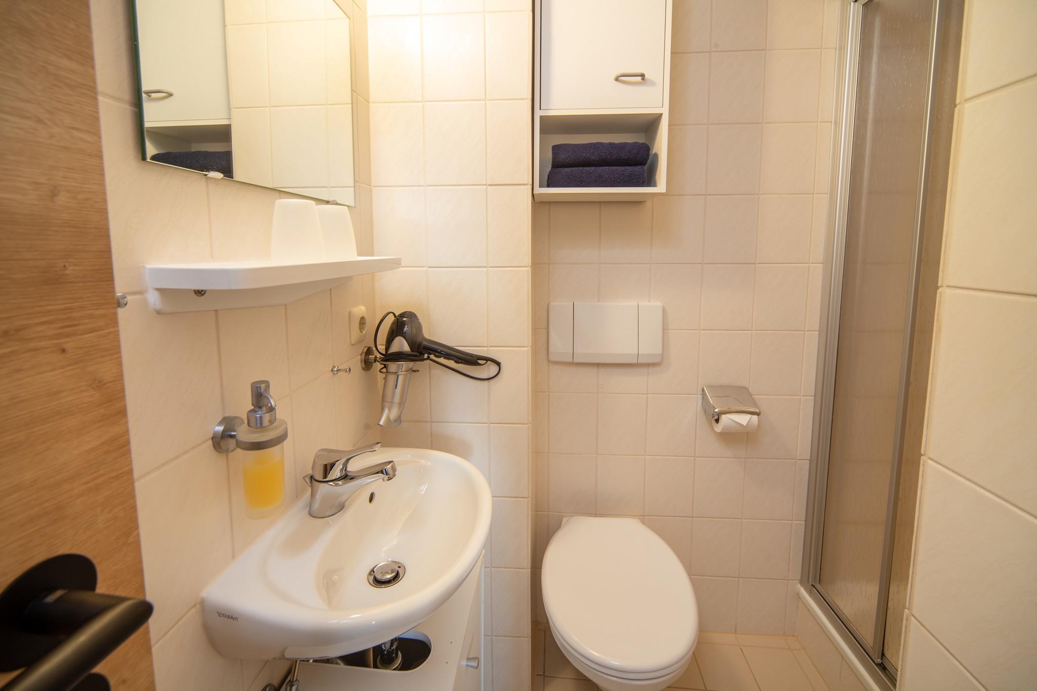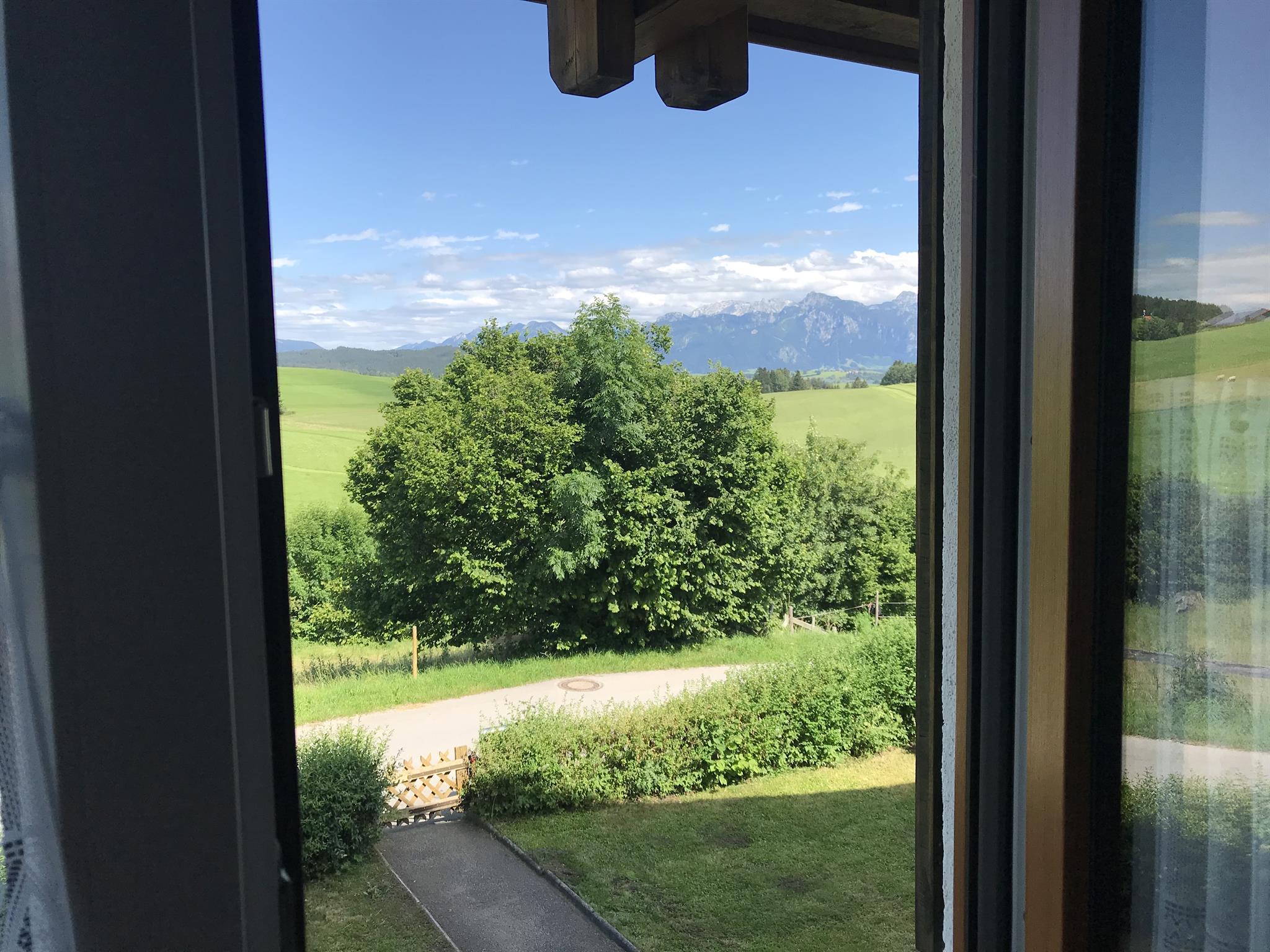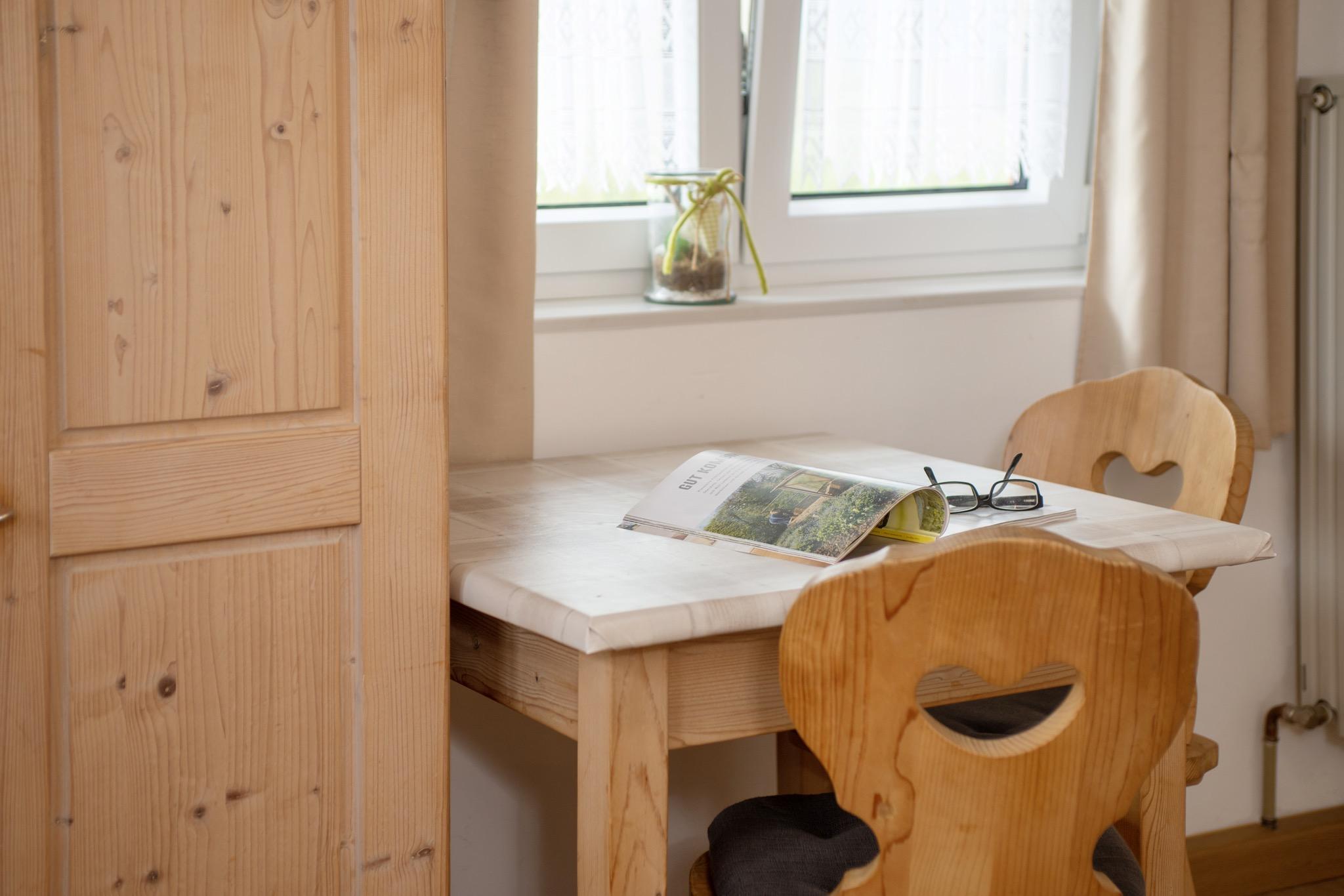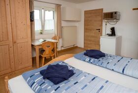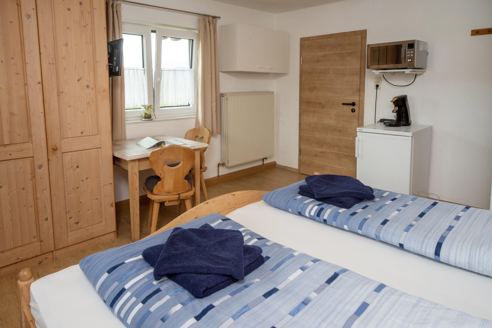 Das Doppelzimmer ist ausgestattet mit einem Parkettboden und 1 Doppelbett von dem aus man auf dem Flachbildfernsehr seine Lieblingssendung schauen kann. Falls Sie selber Ihr Frühstück zubereiten wollen, ist das Zimmer ausgestattet mit einem Kühlschrank, einer Senseo Kaffeemaschine und einem kleinen Schrank mit Geschirr und Besteck. Das schmutzig Geschirr einfach auf den Servierwagen vor der Türe stellen - dieses wird von uns in der Spülmaschine gespült. Im Sommer haben wir einen Bäcker, der Sie mit frischen Backwaren beliefert. Frühstücken können Sie am Tisch direkt am Fenster. Vom Fenster hat man eine Aussicht auf das schöne Alpenpanorama. Das Bad ist ausgestattet mit einer Dusche, einem WC und einem kleinen Waschbecken. Handtücher und Seife sind vorhanden