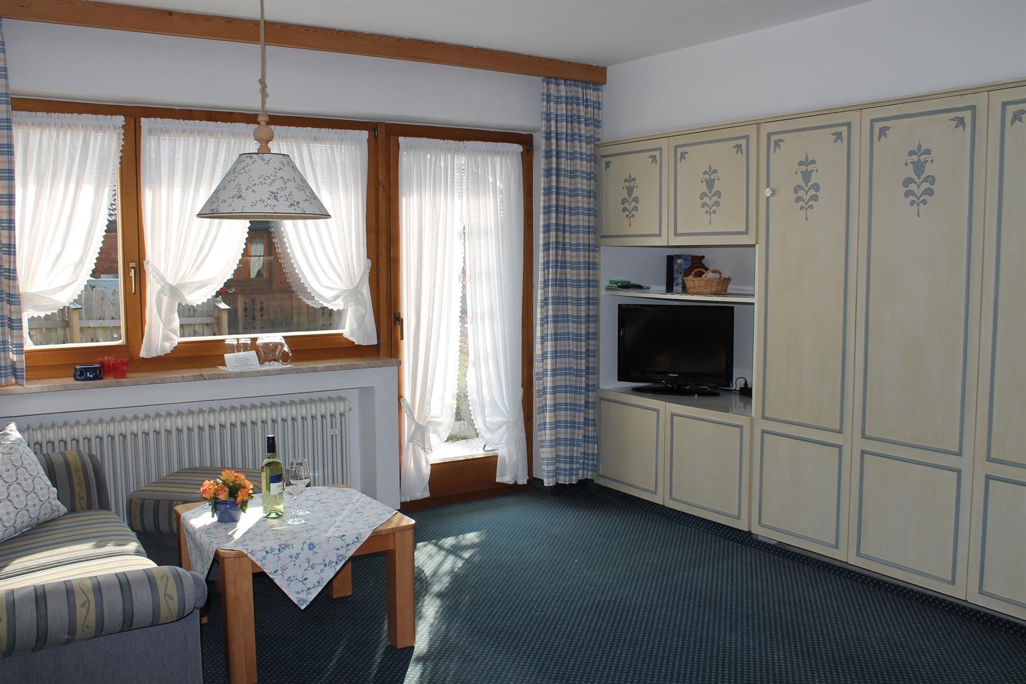 Genießen Sie den herrlichen Bergblick auf unser wunderschönes Karwendel- und Wettersteingebirge von der Südterrasse Ihrer gemütlichen Ferienwohnung mit 30m². Wohn-Schlafzimmer mit Schrankbetten (normale Betten, tagsüber im Schrank, brauchen abends nur ausgeklappt werden), bequeme Sitzgruppe und Essecke, SAT-TV, Radio, Telefon; sep. Küche mit Kochplatten, Mikrowelle auf Wunsch, Kühlschrank mit Gefrierfach, Kaffeemaschine, Wasserkocher und kompl. Geschirr; Dusche/ WC, Fön; Terrasse mit Sonnenschirm und Gartenmöbeln; Bettwäsche, Handtücher, Tischdecken und Geschirrtücher vorhanden