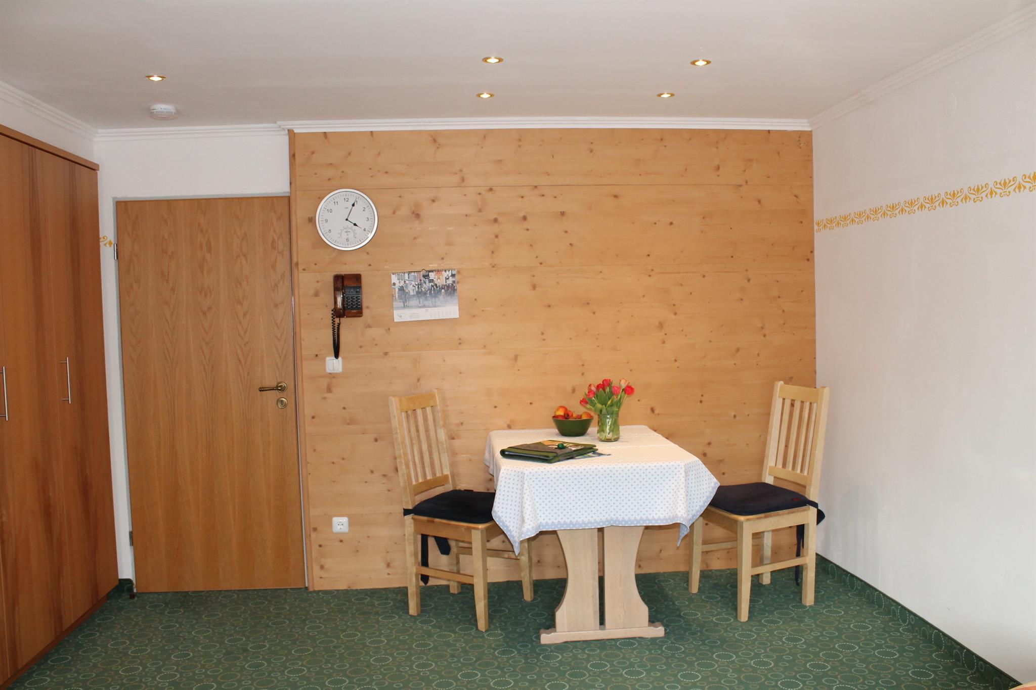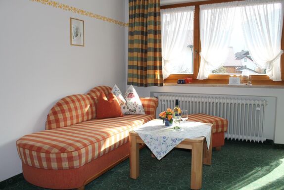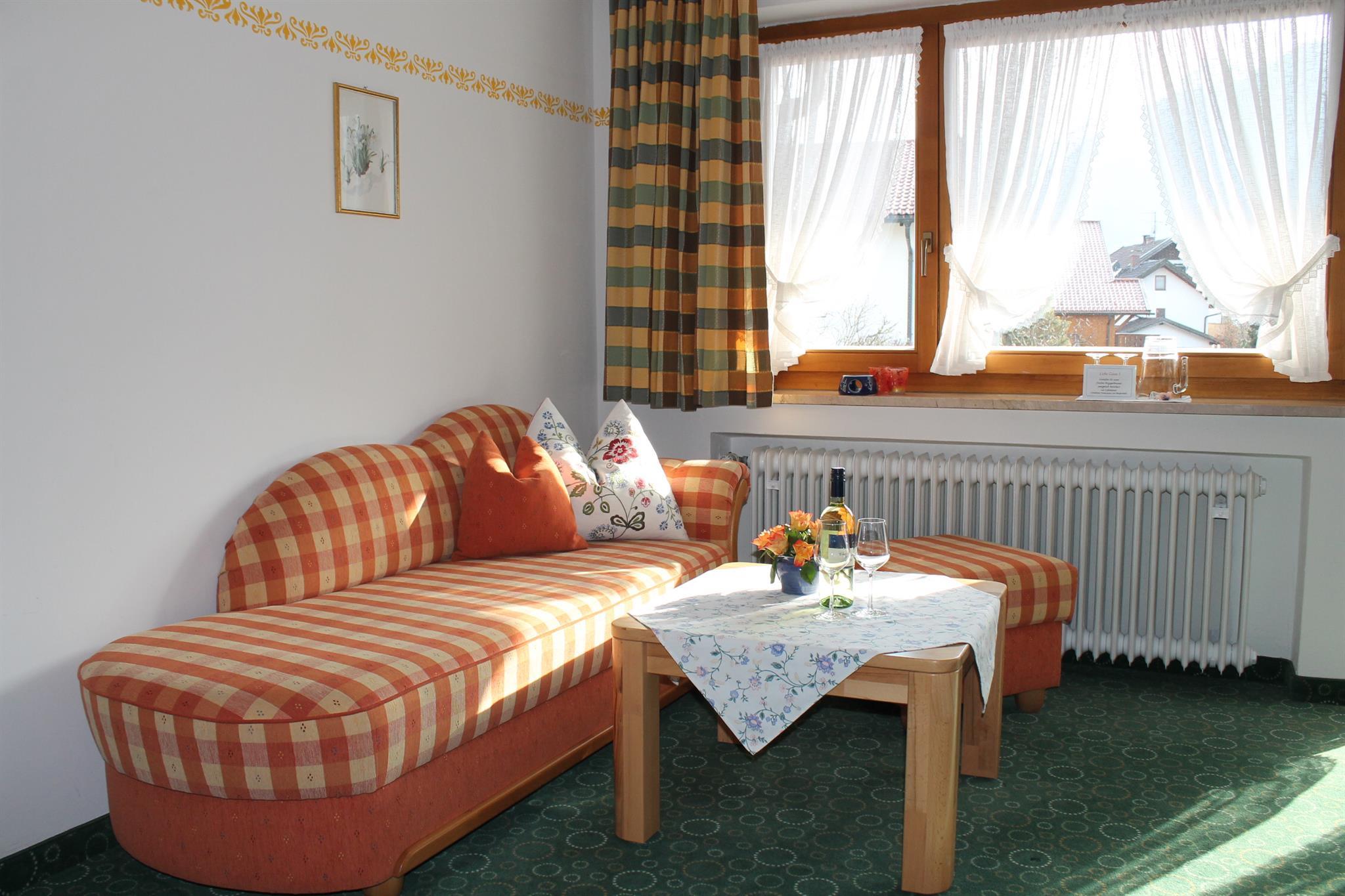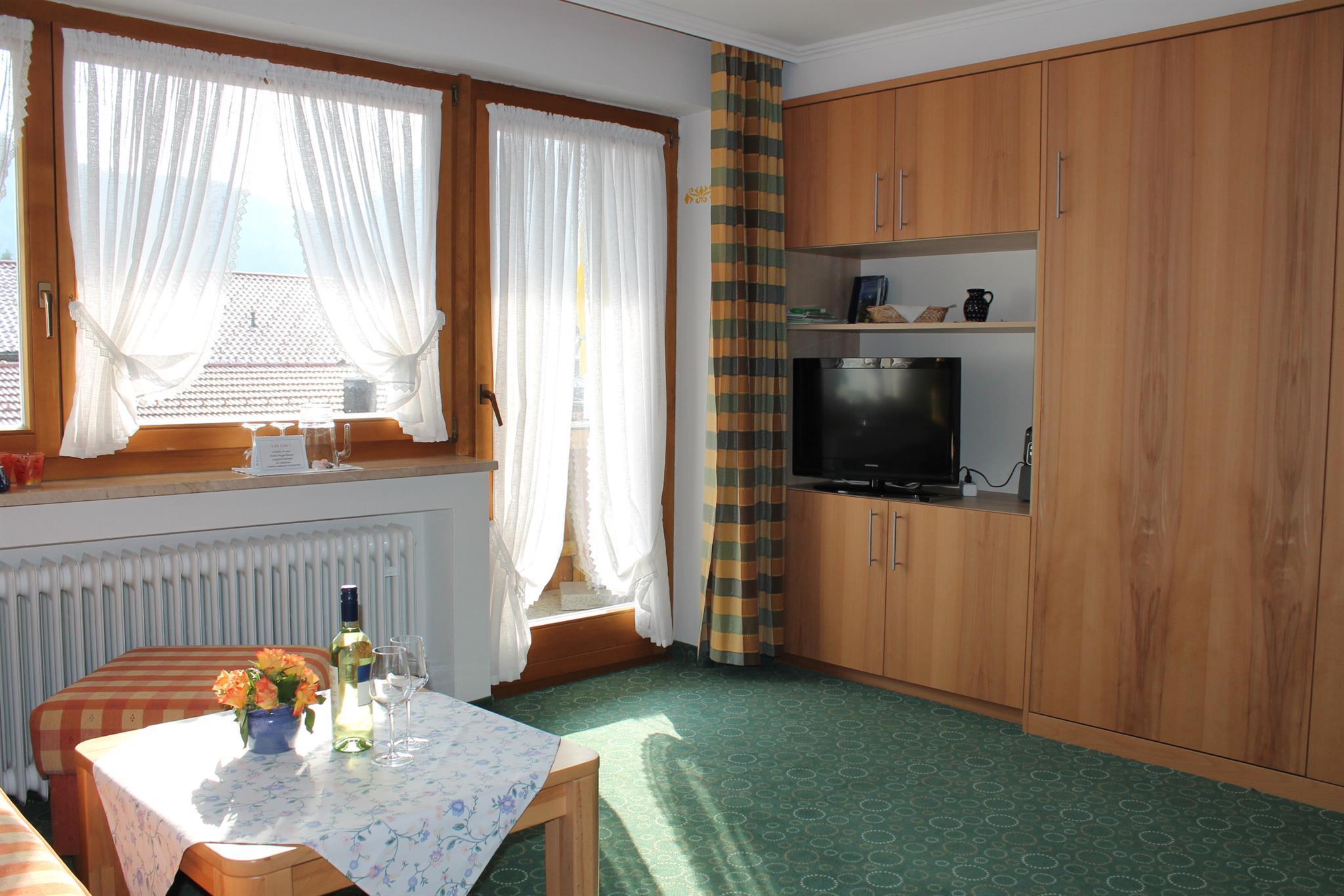 Genießen Sie den herrlichen Bergblick auf unser wunderschönes Karwendel- und Wettersteingebirge von dem Südbalkon Ihrer gemütlichen Ferienwohnung mit 30m². Wohn-Schlafzimmer mit Schrankbetten (normale Betten, tagsüber im Schrank, brauchen abends nur ausgeklappt werden), bequeme Sitzgruppe und Essecke, SAT-TV, Radio, Telefon; sep. Küche mit Kochplatten, Mikrowelle auf Wunsch, Kühlschrank mit Gefrierfach, Kaffeemaschine, Wasserkocher und kompl. Geschirr; Dusche/ WC, Fön; Balkon mit Sonnenschirm und Gartenmöbeln; Bettwäsche, Handtücher, Tischdecken und Geschirrtücher vorhanden