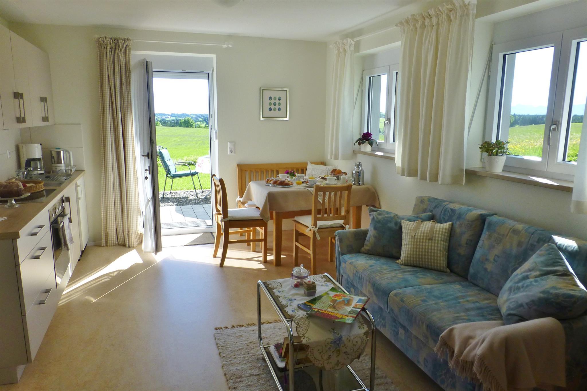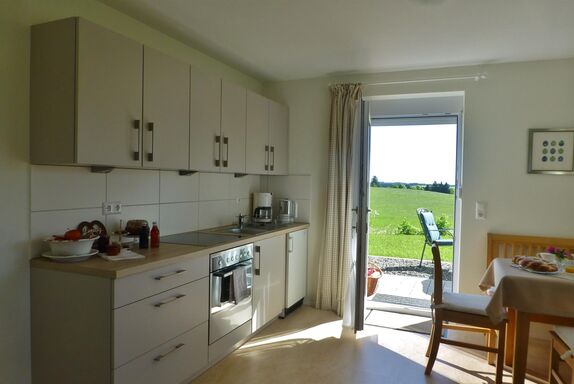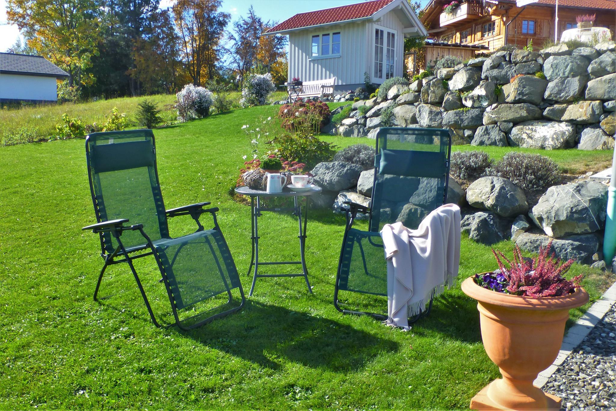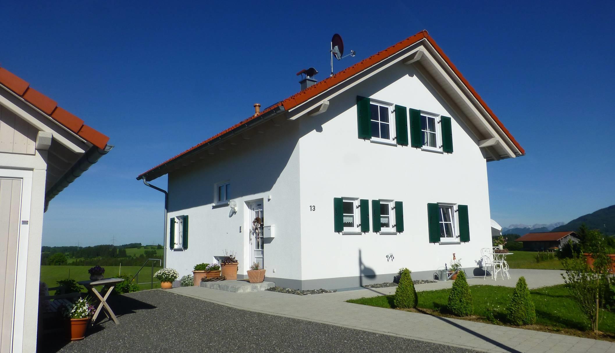 Die gemütliche Ferienwohnung mit eigenem Eingang (29 qm) befindet sich im Souterrain eines neuwertigen Einfamilienhauses. Ein sehr schöner duftender Garten umgibt das Haus. Die Küche verfügt über sämtliche Kleingeräte (Kaffeemaschine, Wasserkocher, Eierkocher, Saftpresse, Handrührgerät Toaster) sowie Herd, Backofen, Kühlschrank mit Gefrierfach und ist mit hochwertigem Geschirr bestens ausgestattet. Von der angrenzenden sonnigen Terrasse haben Sie einen freien einzigartigen Blick ins Grüne und in die Allgäuer Berge. Gartenmöbel, Liegen, Sonnenschirm laden ein in Ruhe zu frühstücken und zu entspannen. Ein Flachbild-TV und CD-Player können sowohl vom Essplatz als auch vom Sofa oder Doppelbett genutzt werden. Das separate Bad (Dusche, WC, Föhn, Wäscheständer, Handtücher, Fenster) gleich neben dem Bett macht das Wohlfühlen komplett. Die ganze Ferienunterkunft ist mit Fußbodenheizung und Linoleum (Bad-Fliesen) ausgestattet. Die Ferienwohnung ist für Kleinkinder leider nicht geeignet. Vor dem Haus dürfen Sie einen Parkplatz kostenfrei nutzen.