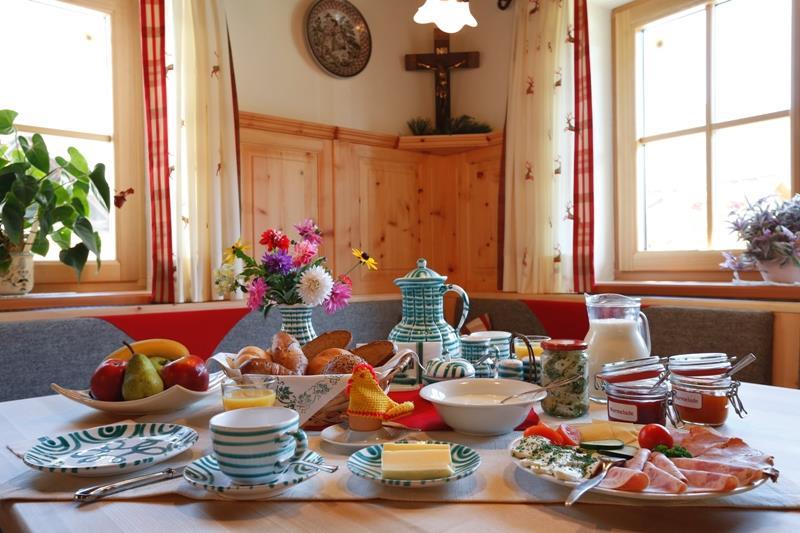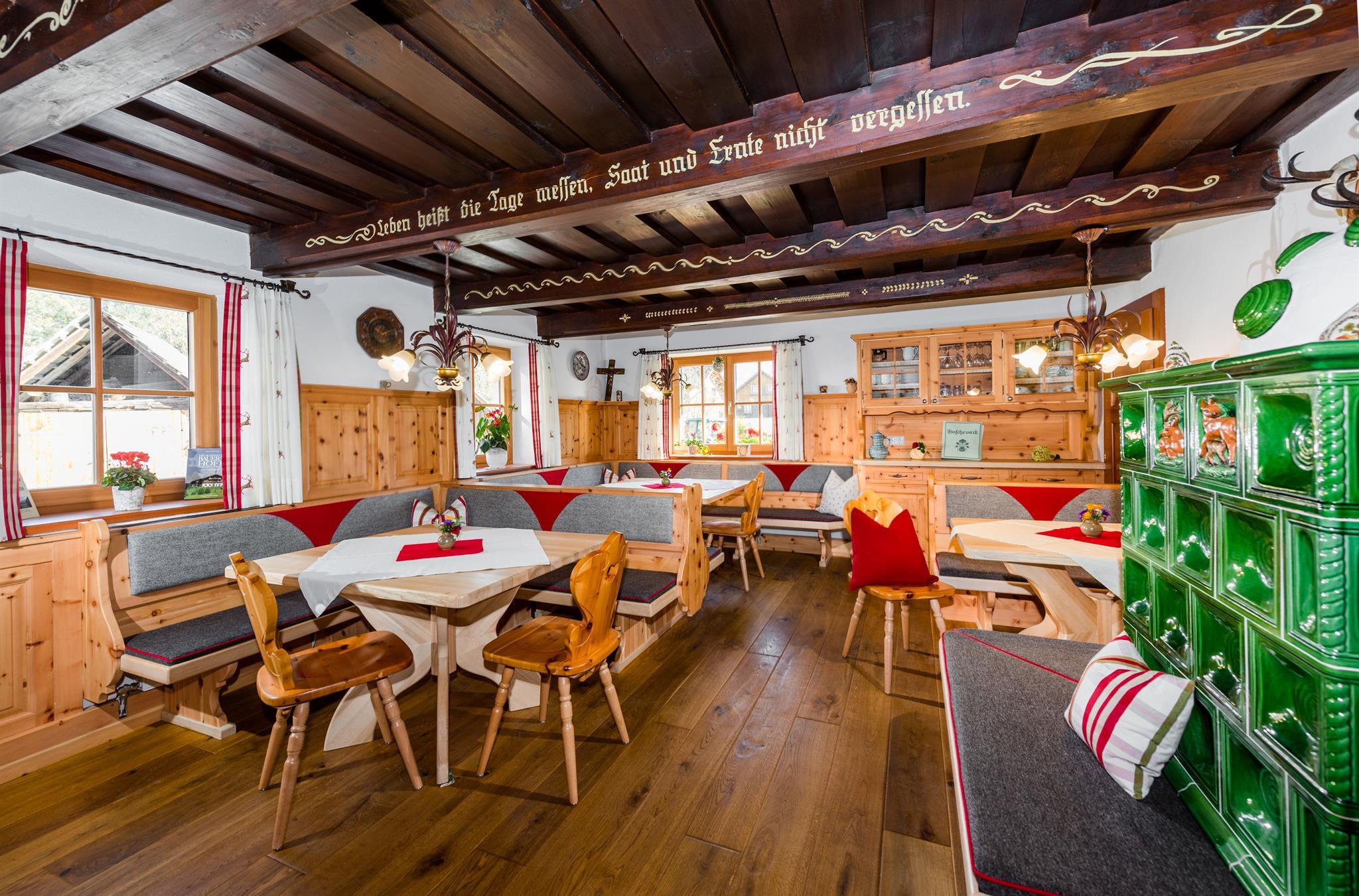 Morgens genießen Sie in der gemütlichen Bauernstube ein abwechslungsreiches Frühstück mit vielen selbstgemachten Produkten wie zB Marmelade, Käse, Aufstriche, Joghurt. Für ein gemütliches Beisammensein am Abend steht Ihnen die Bauernstube mit Gästekühlschrank natürlich auch zur Verfügung. Im Winter genießen Sie zudem die flauschige Wärme, die der Kachelofen in dieser Zirbenstube verbreitet.