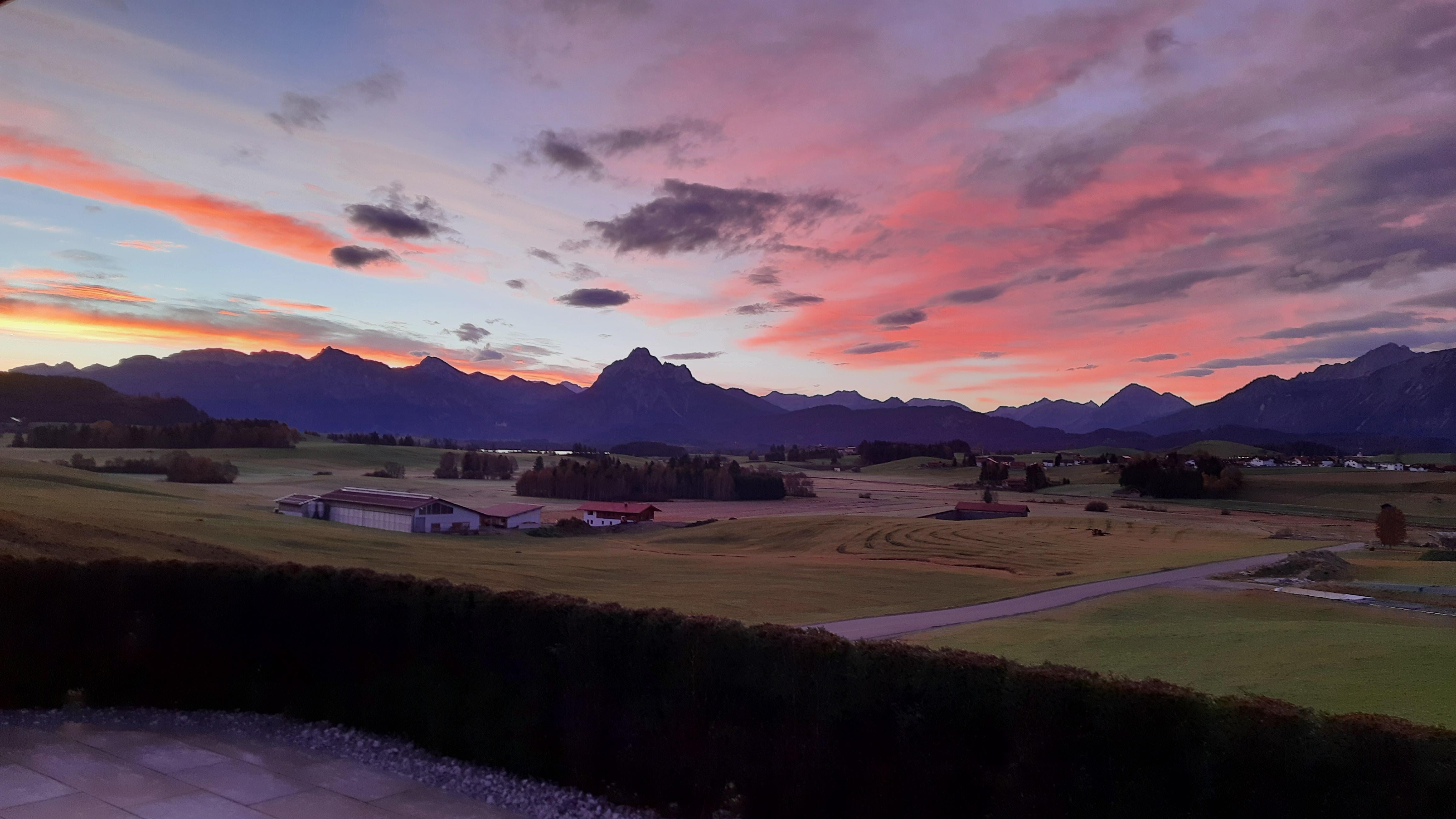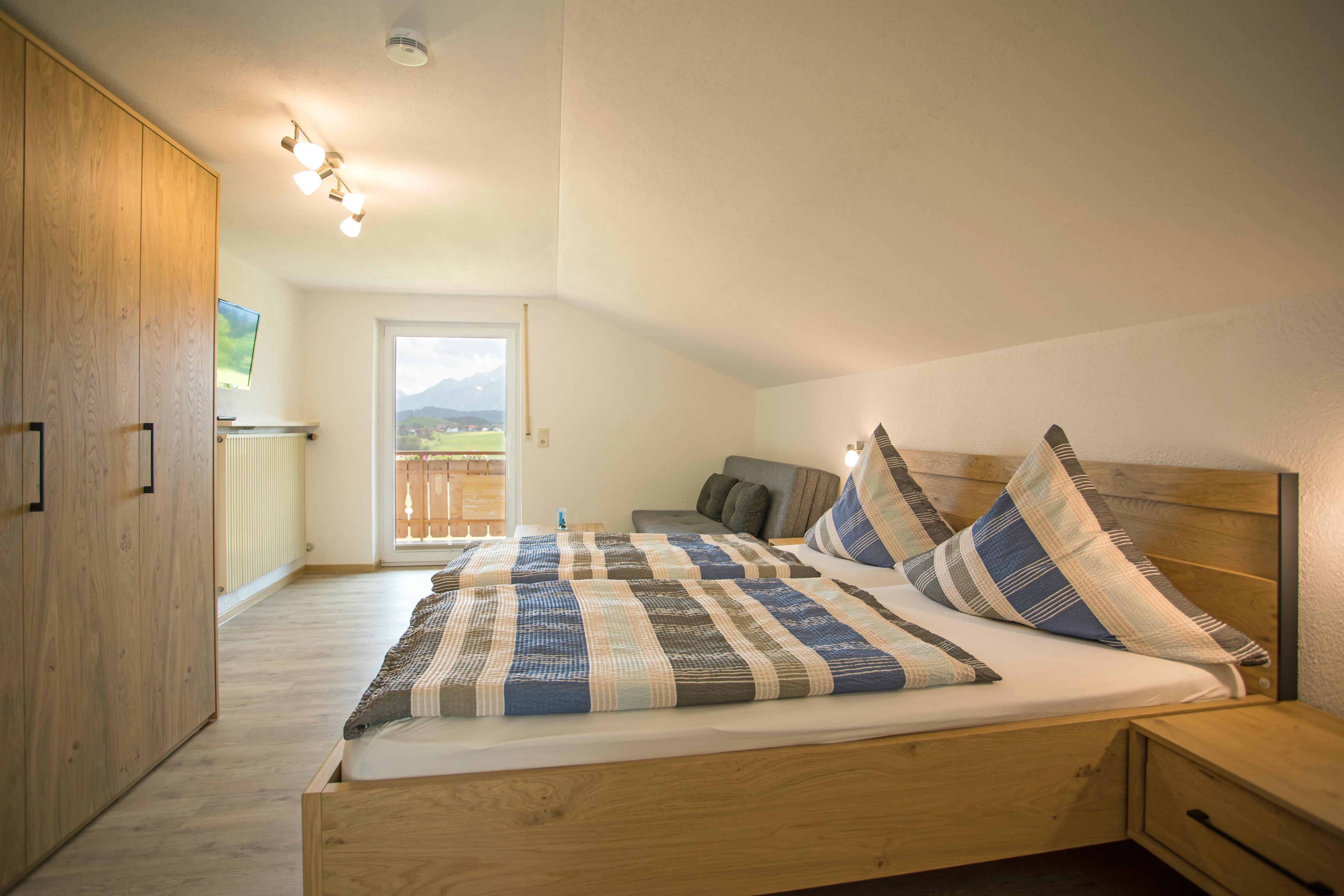 Unser Gästehaus in sonniger, ruhiger Südhanglage mit Blick auf die Allgäuer Alpen, Schloss Neuschwanstein und den Hopfensee bietet im ländlichen Stil eingerichtete Ferienwohnungen mit Südbalkon für 2 bis 4 Personen.
