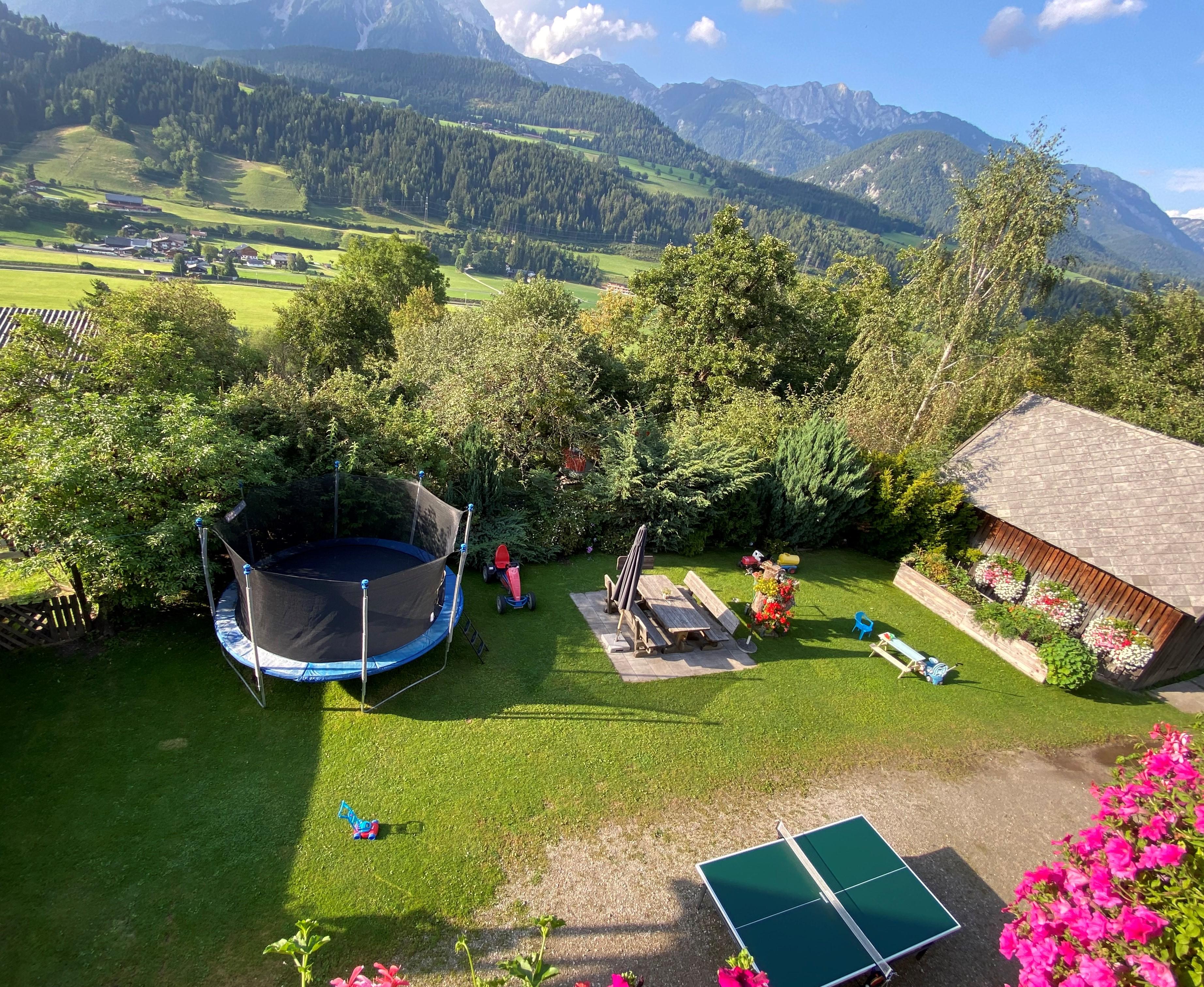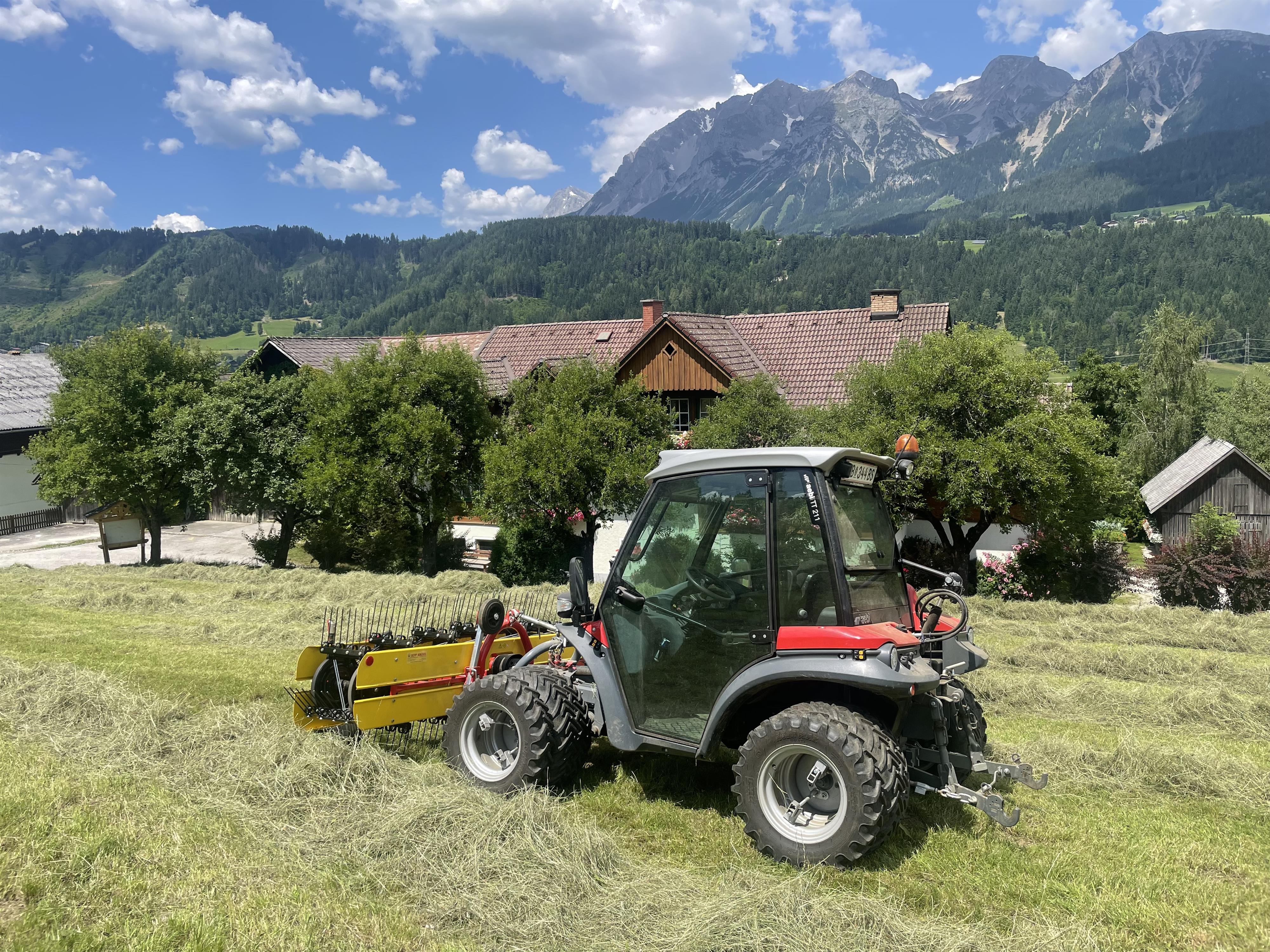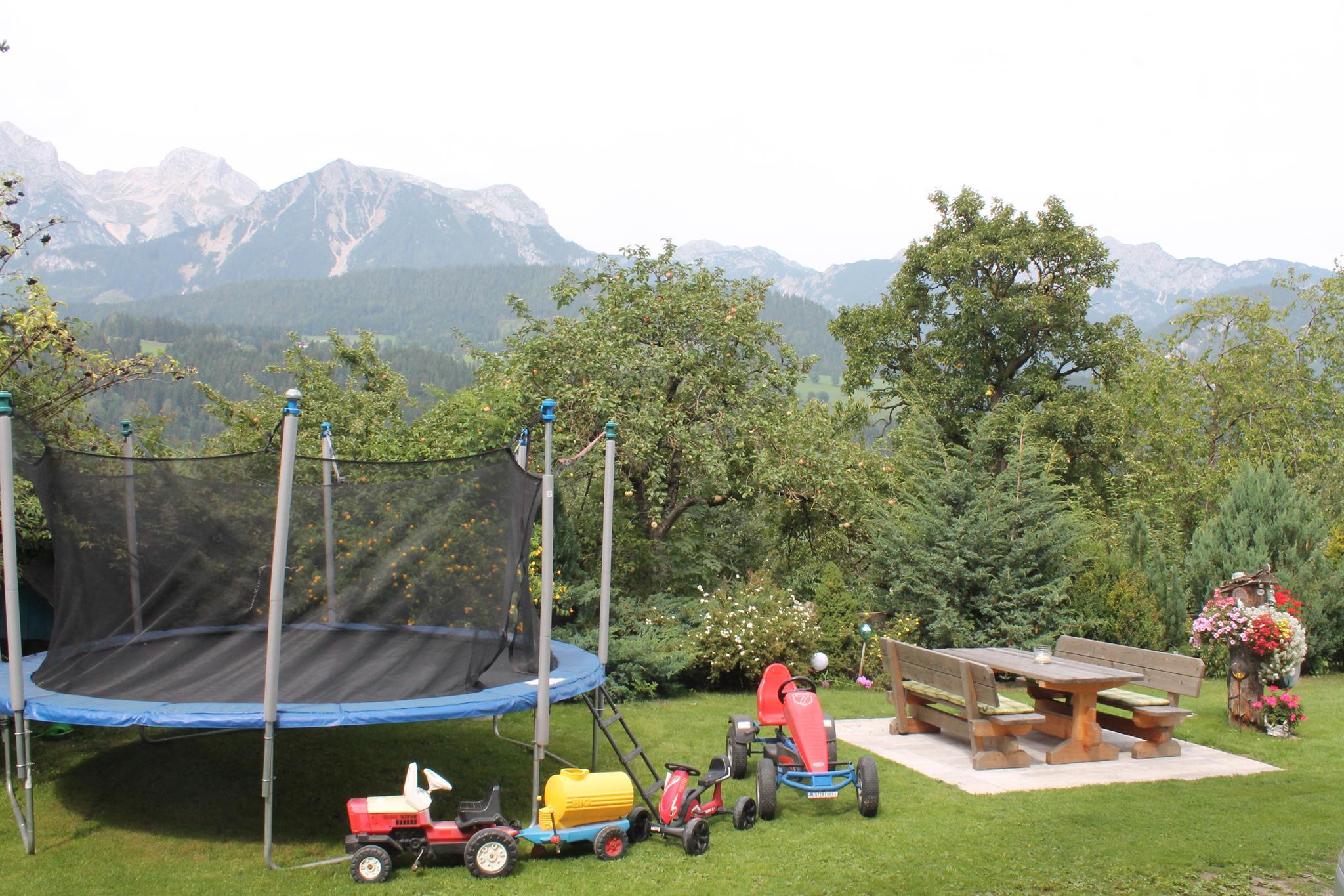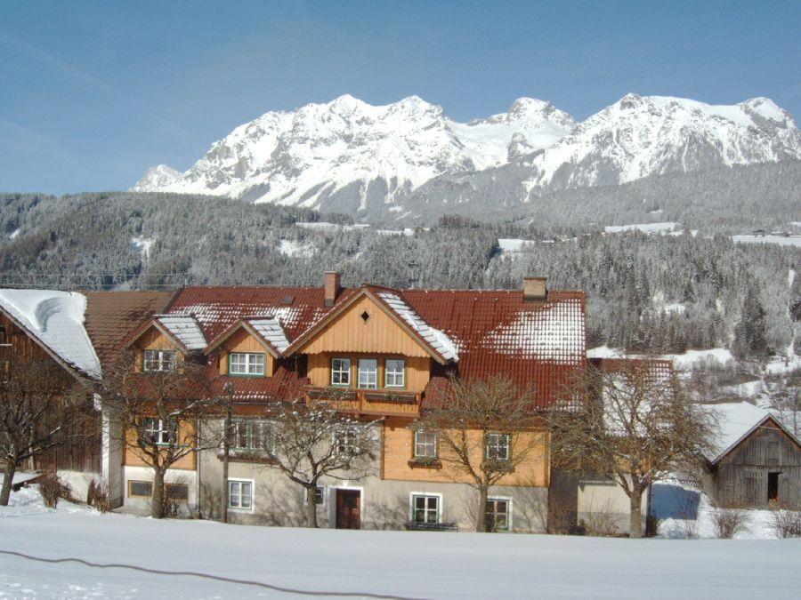 Die leicht erhöhte Lage bietet eine beeindruckende Sicht über das Ennstal auf das gegenüberliegende Dachsteinmassiv.