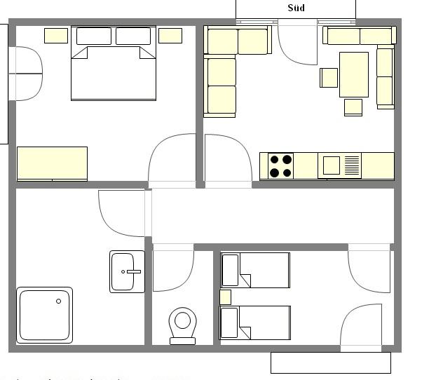 1 Doppelzimmer (entweder mit 2 Einzelbetten oder auch zusammenstellbar), 1 Dreibettzimmer (Doppelbett und Einzelbett),Wohnküche, Bad und extra WC ausgestattet zusätzlich mit Fußbodenheizung