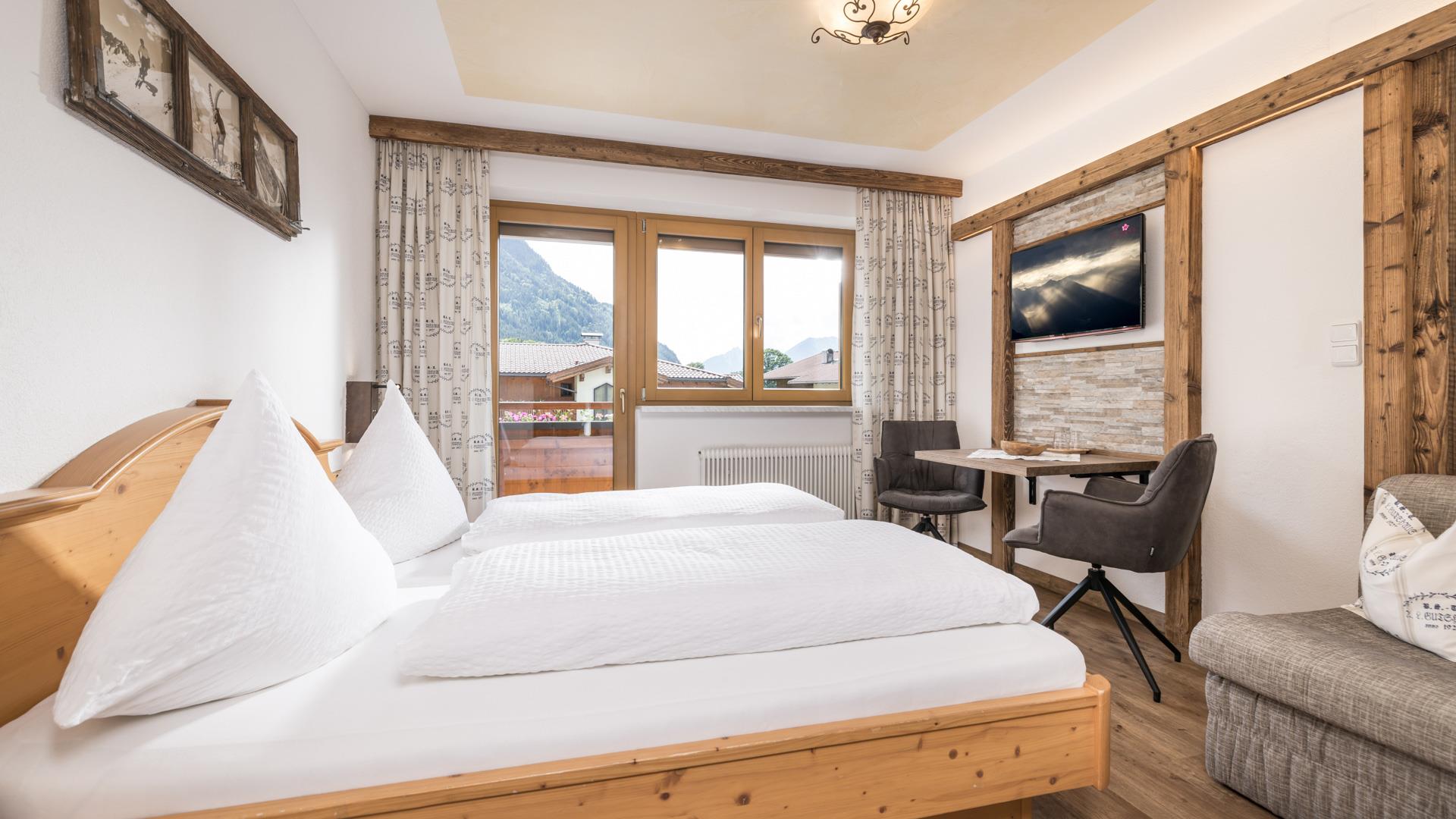 In der Pension Alpina sind Sie bestens untergebracht in unserem Doppelzimmer Romantik mit Dusche/WC, Fön, Rolläden, Handtücher, Radio, Flat-TV und Balkon mit herrlichem Blick auf die Bergwelt von Reith im Alpbachtal.