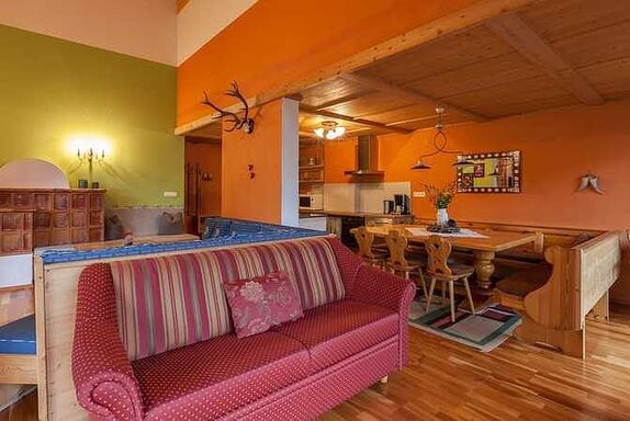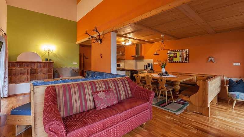 • der Kachelofen sorgt für eine Wohlfühlatmosphäre rund um die Uhr,.: die Raumhöhe von fünf Meter mit hölzernen Sichtdach erzeugt ein natürliches Gefühl der Großzügigkeit,