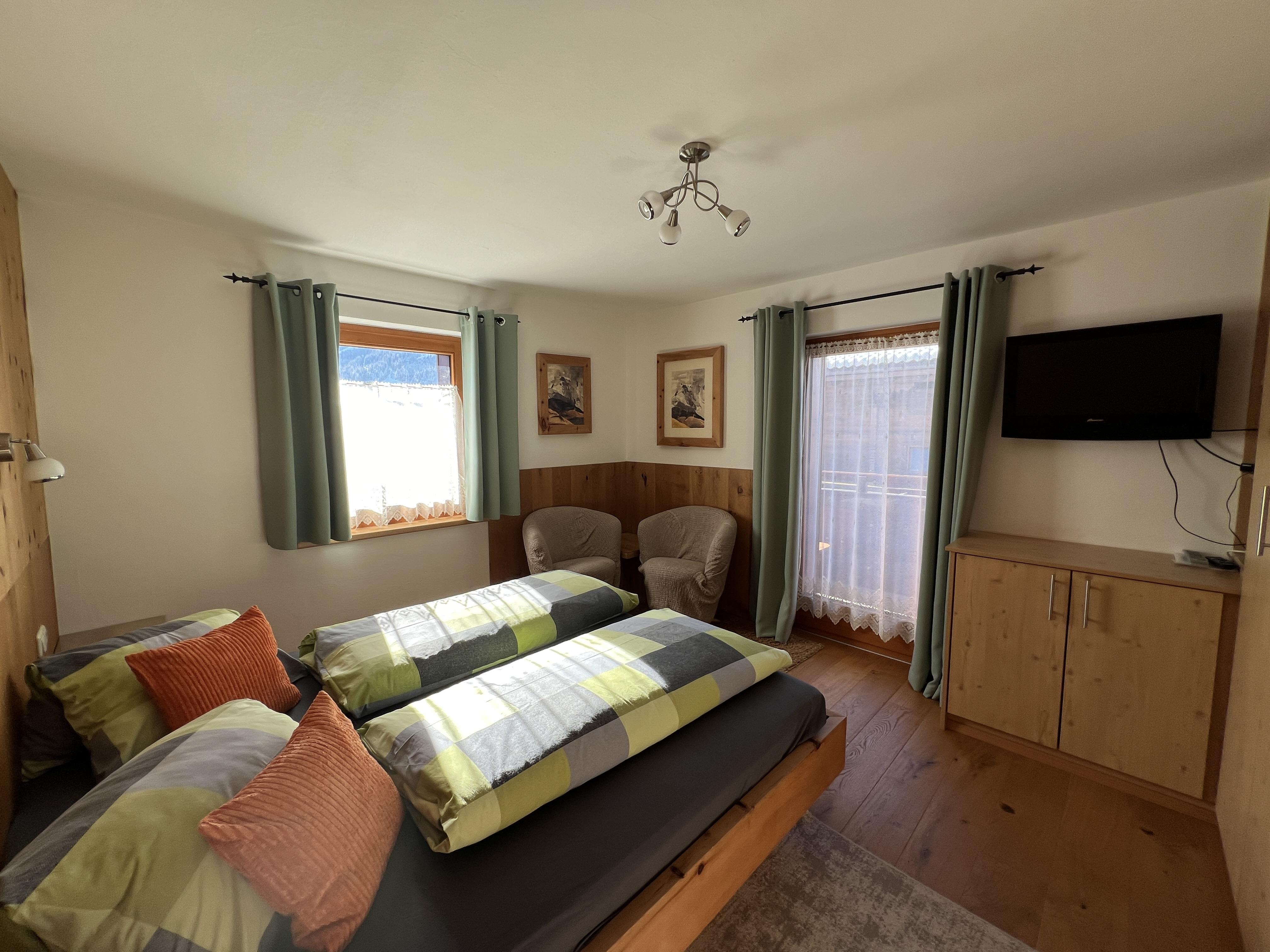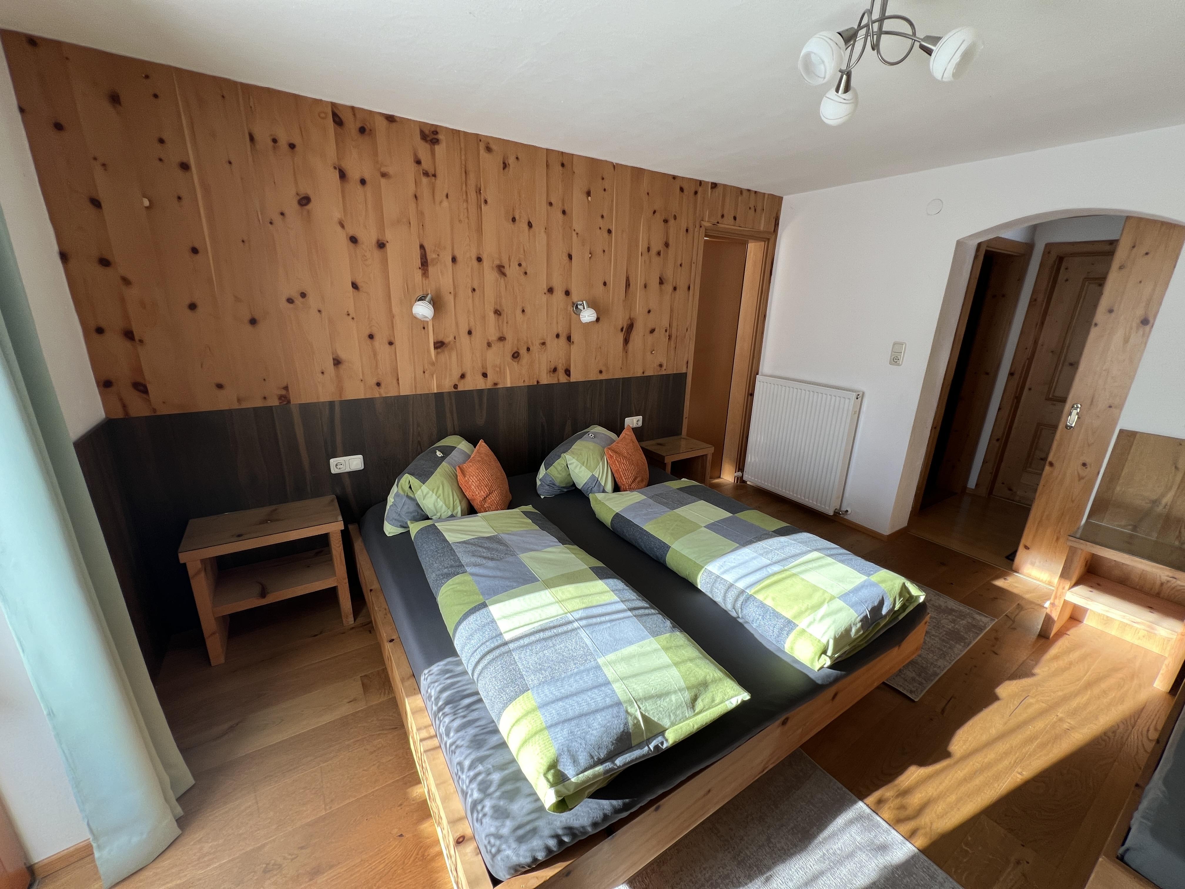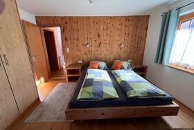 Die zwei Schlafzimmer in der Ferienwohnung, sind mit Naturholzböden und Betten und Möbel aus Zirbenholz ausgestattet.