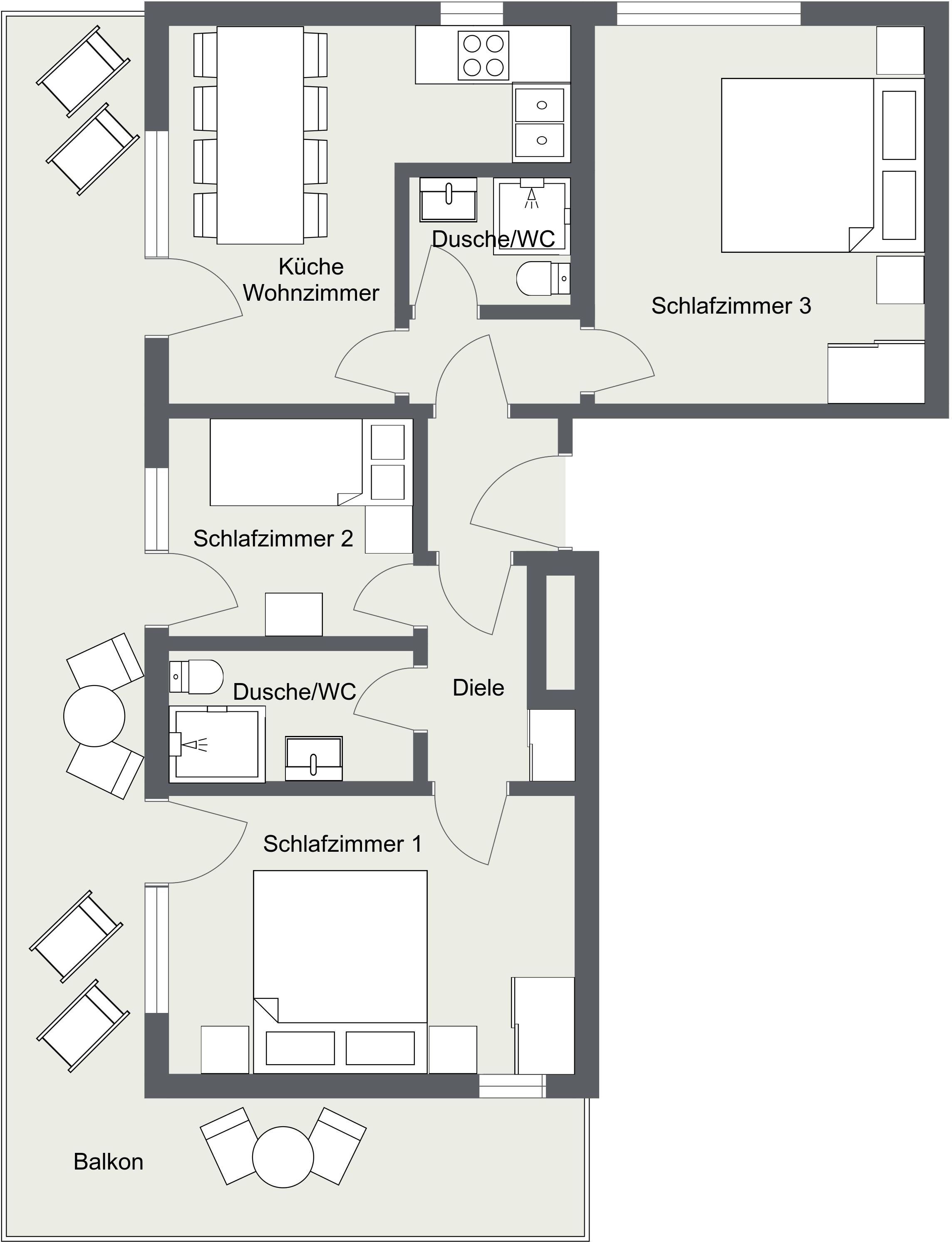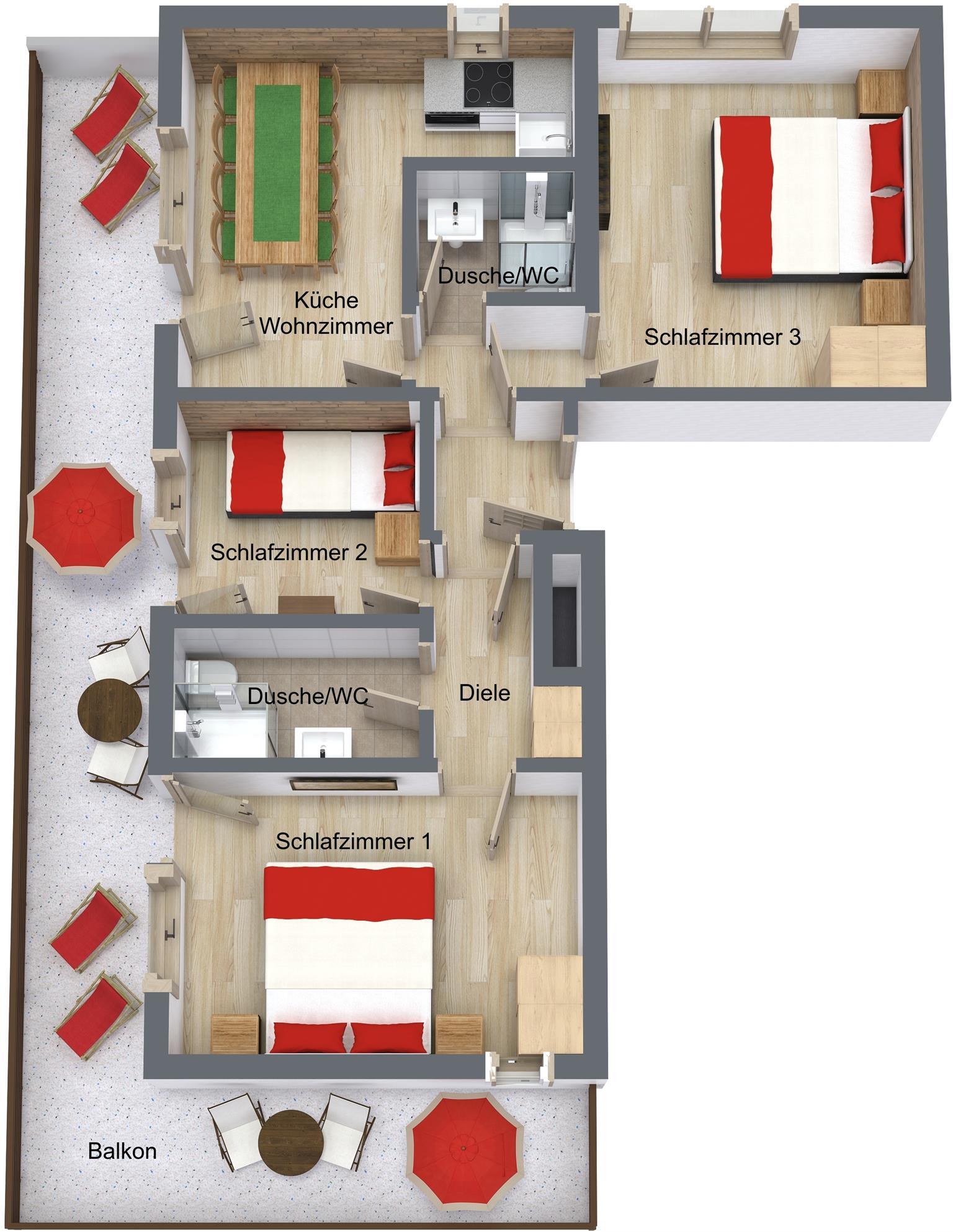Das Familienappartement Alpbachtal umfasst 52 m2 Wohnfläche und überzeugt mit einem besonders gemütlichen Ambiente sowie einer hochwertigen Ausstattung im alpinen Chalet-Stil. Das Appartement verfügt über einen Wohnbereich mit Eckbank und direkt angrenzender Kochnische, drei Schlafzimmer für bis zu 5 Personen (2 Schlafzimmer mit je einem Boxspring-Doppelbett und 1 Schlafzimmer mit einem Boxspring-Einzelbett) sowie zwei getrennte Bäder mit Dusche und WC. Bei unseren Gästen besonders beliebt ist der große Balkon mit süd- und westseitiger Ausrichtung. Im Familienappartement Alpbachtal kann nach Rückfrage maximal ein Zustellbett für eine weitere Person zum Preis von EUR 15,00 pro Übernachtung und ein Babybett (kostenfrei für Kinder bis 2 Jahre) platziert werden.