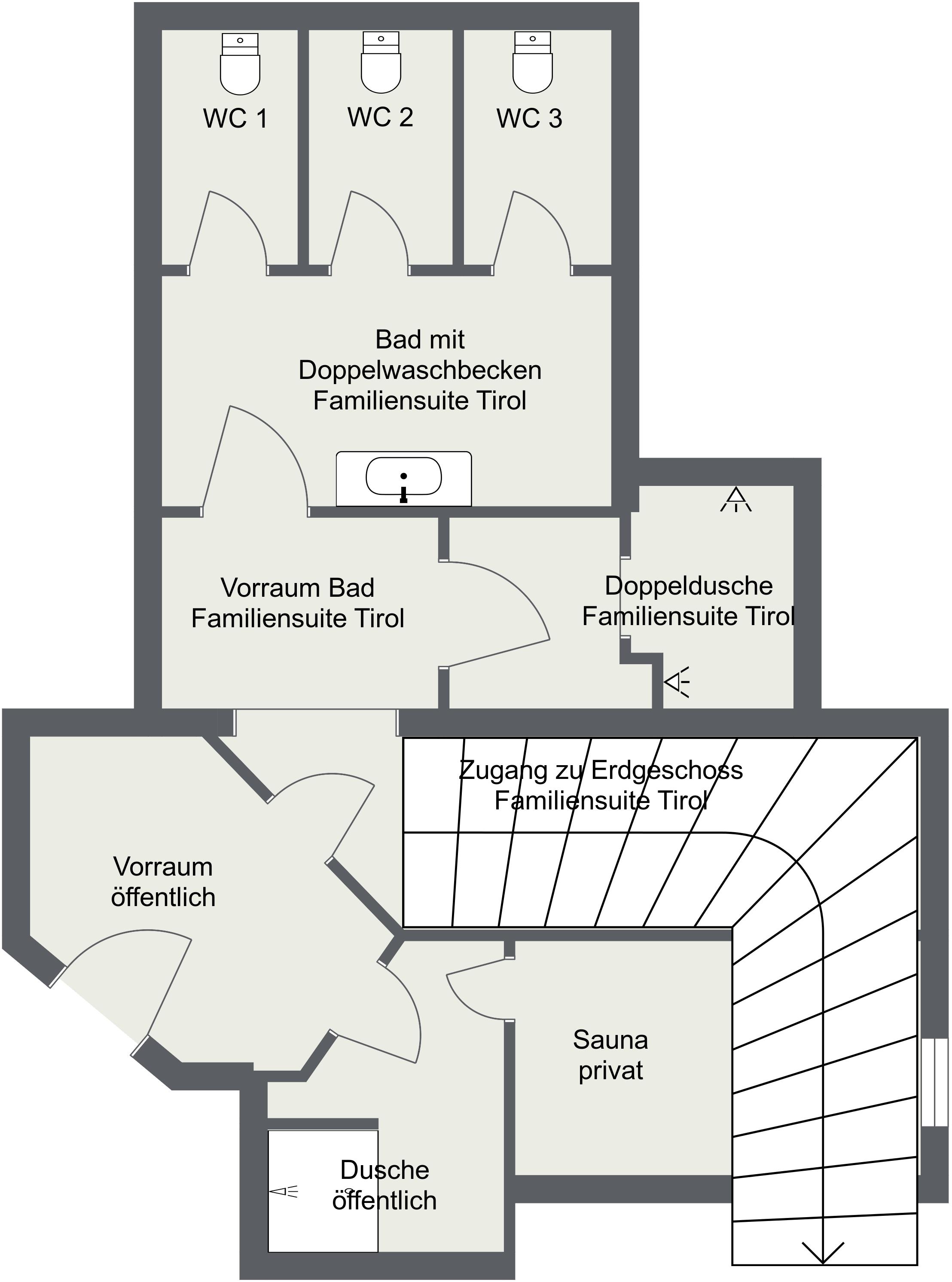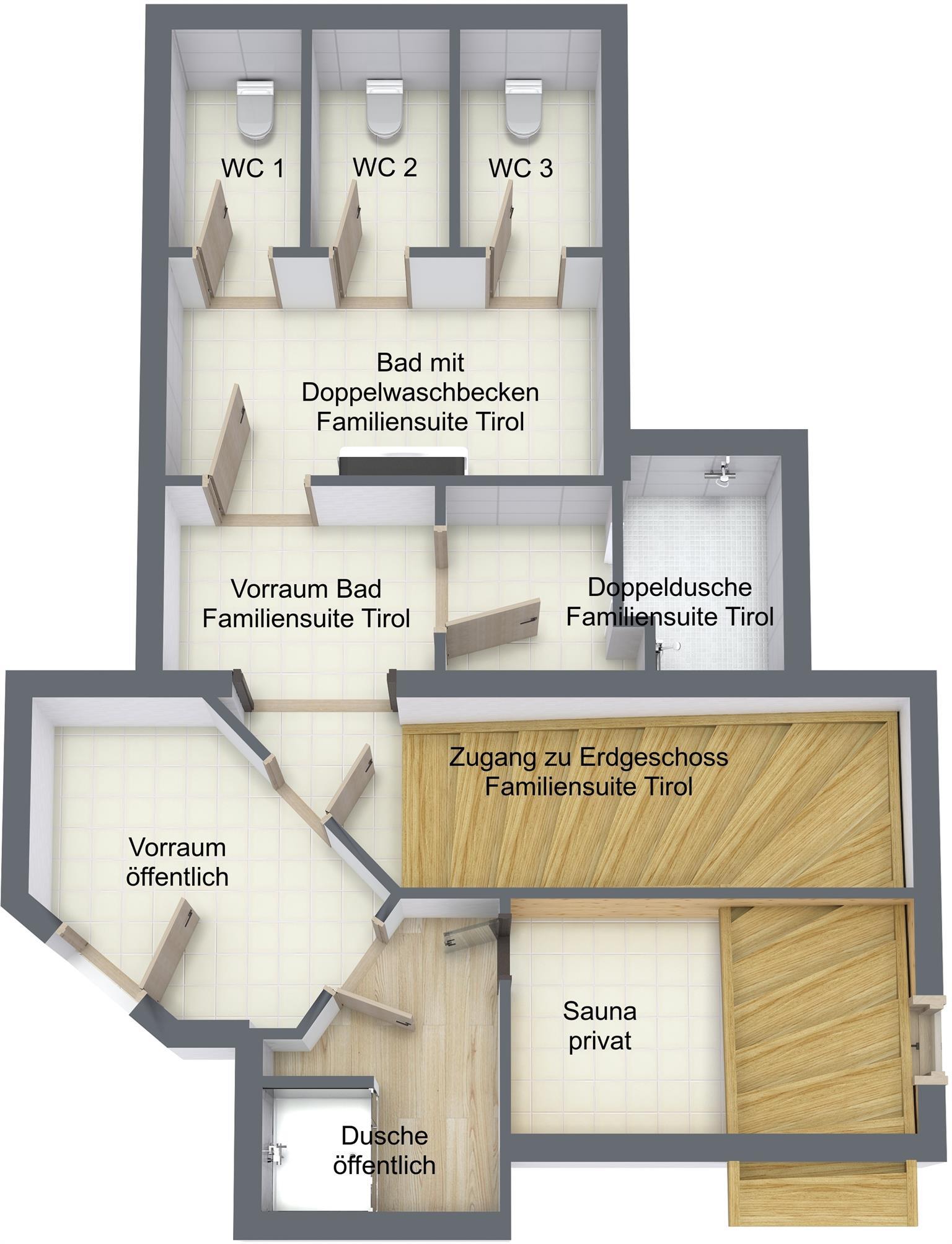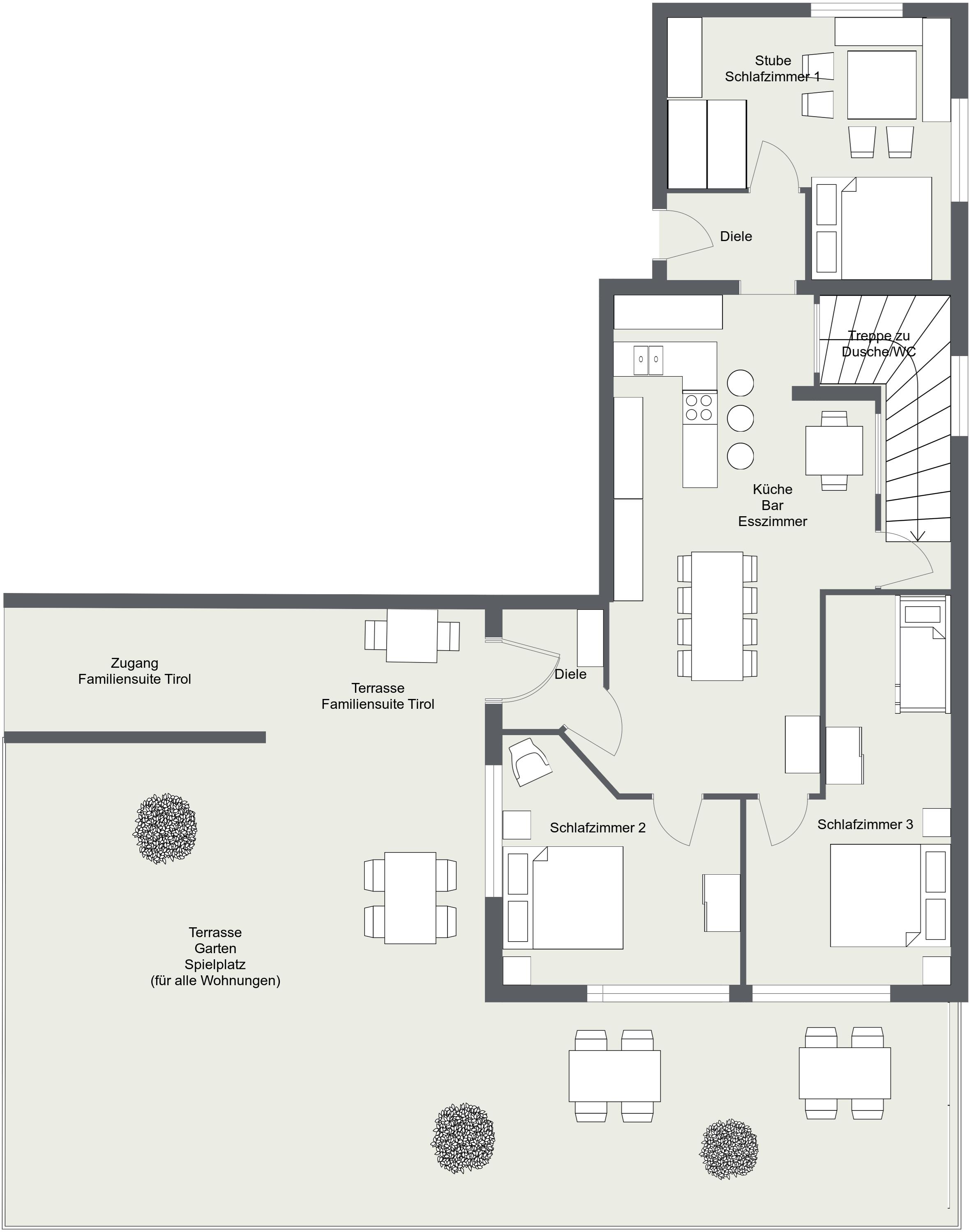 Die Familiensuite Tirol ist mit 116 m2 Wohnfläche überaus geräumig und überzeugt mit einem besonders gemütlichen Ambiente sowie einer hochwertigen Ausstattung im alpinen Chalet-Stil. Die Suite verfügt über insgesamt drei Schlafzimmer für bis zu sieben Personen (1 Doppelbett in der Bauernstube, 1 Schlafzimmer mit einem Boxspring-Doppelbett und einem zusätzlichen Einzel- oder Stockbett sowie 1 Schlafzimmer mit einem Boxspring Doppelbett). Zur hochwertigen technischen Einrichtung der Familiensuite gehören drei Flatscreen TV-Geräte mit internationalen Kanälen, kostenloses Highspeed-WIFI, eine Stereoanlage mit Internetradio und ein für Laptops geeigneter Safe. In der Familiensuite Tirol kann nach Rückfrage maximal ein Zustellbett für eine weitere Person zum Preis von EUR 15,00 pro Übernachtung und ein Babybett (kostenfrei für Kinder bis 2 Jahre) platziert werden.
