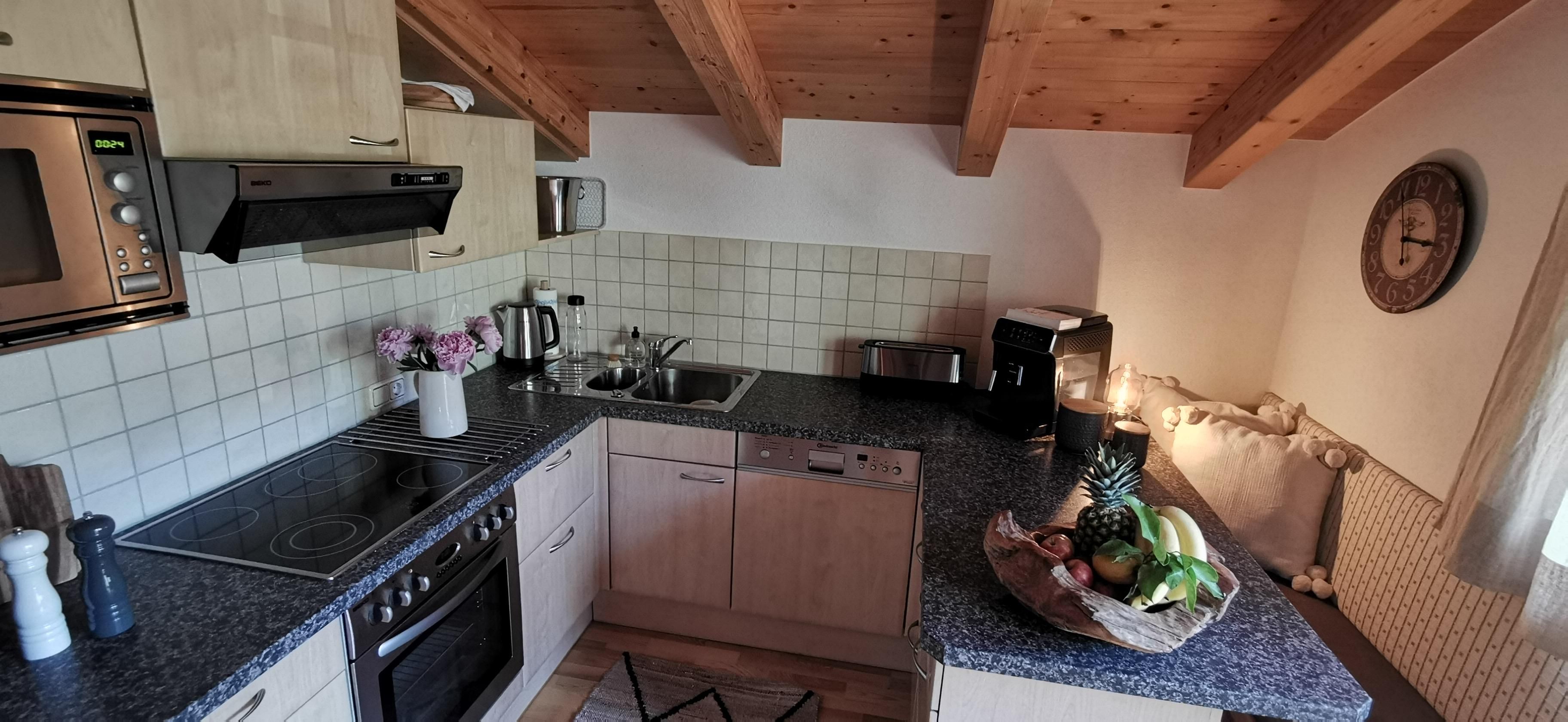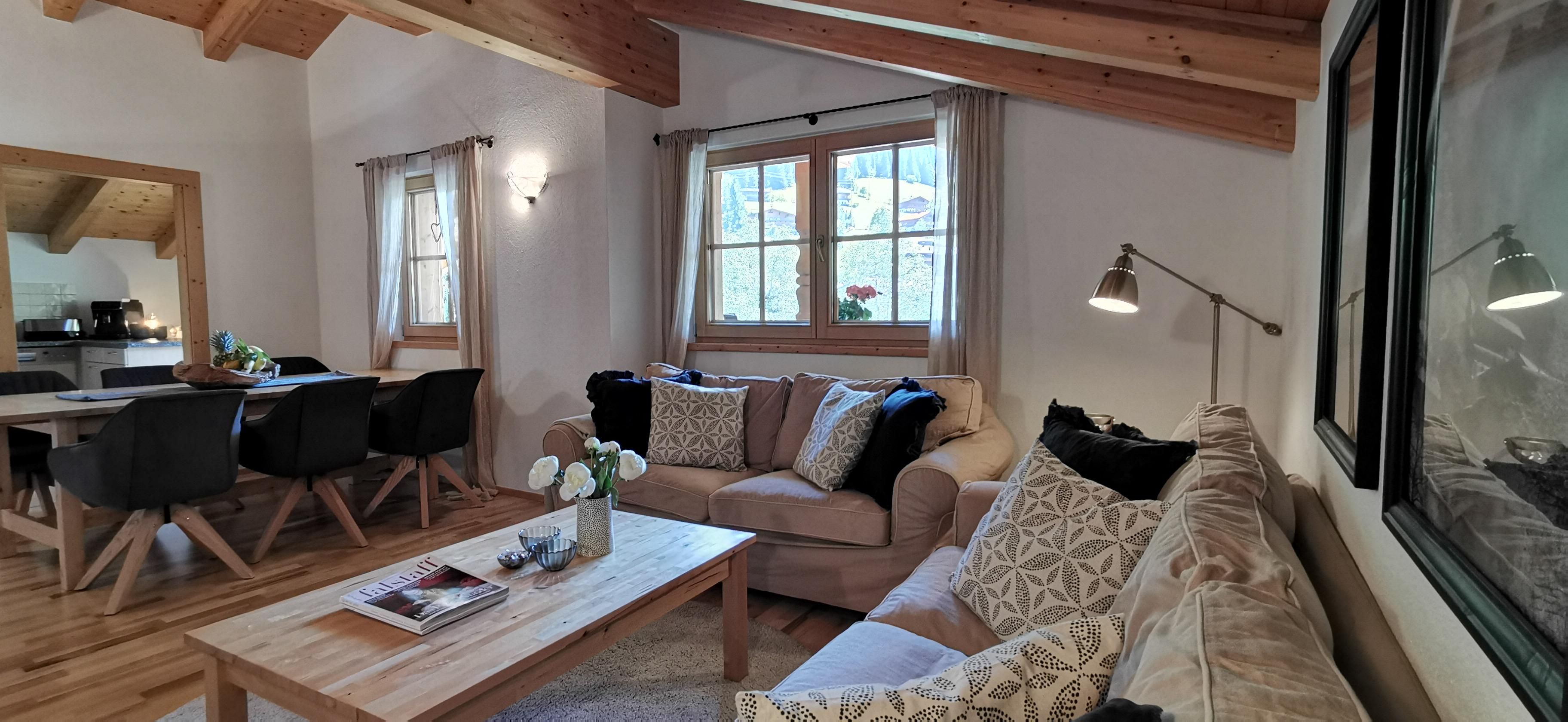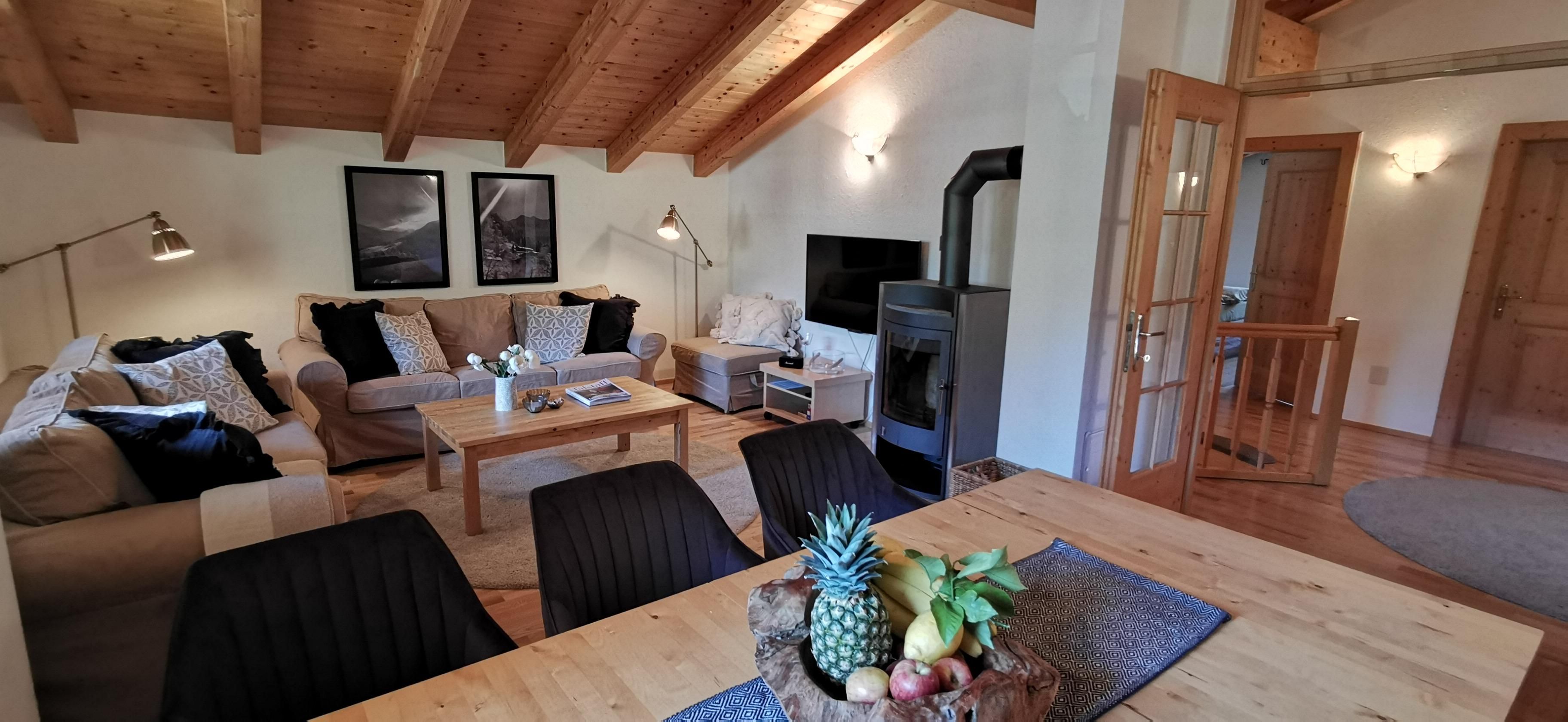 Drei Schlafzimmer mit französischen Doppelbetten, ein Badezimmer mit Doppelwaschbecken, Dusche und Badewanne, ein extra WC, eine gemütliche Chillout-Ecke zum Lesen oder Musik hören, eine voll ausgestattete Küche mit Frühstücksbar sowie ein luftiges Wohn- esszimmer mit gemütlicher Couch, Flat-TV mit internationalen Sendern inkl. Soundsystem, gemütlichem Schwedenofen sowie ein großer Esstisch laden zu gemütlichen Stunden im Kreise von Familie oder Freunden ein.Sowohl der Balkon mit Morgensonne sowie ein Südbalkon für die Nachmittagsstunden bietet herrliche Aussichten - und das zu jeder Jahreszeit.