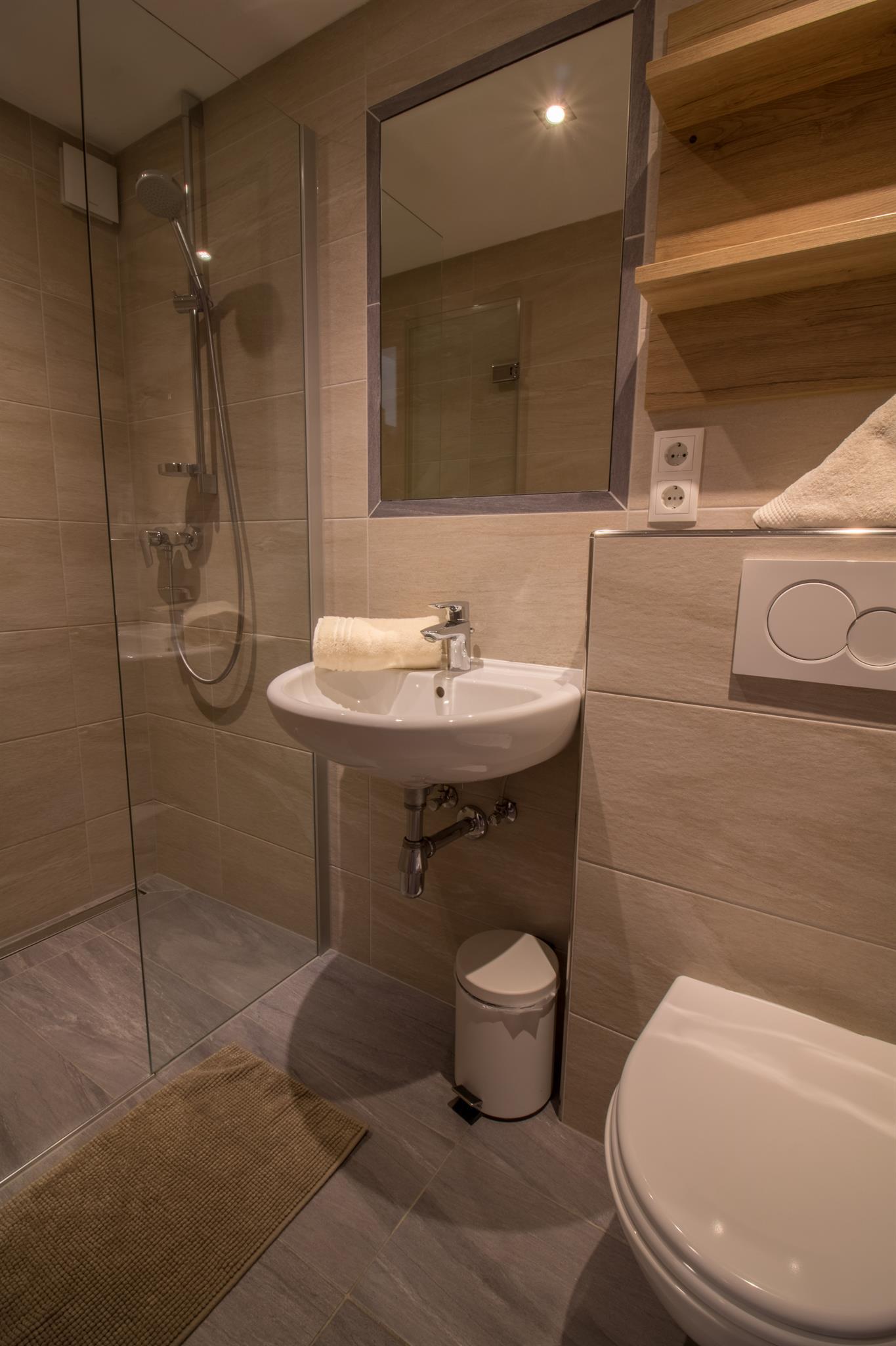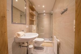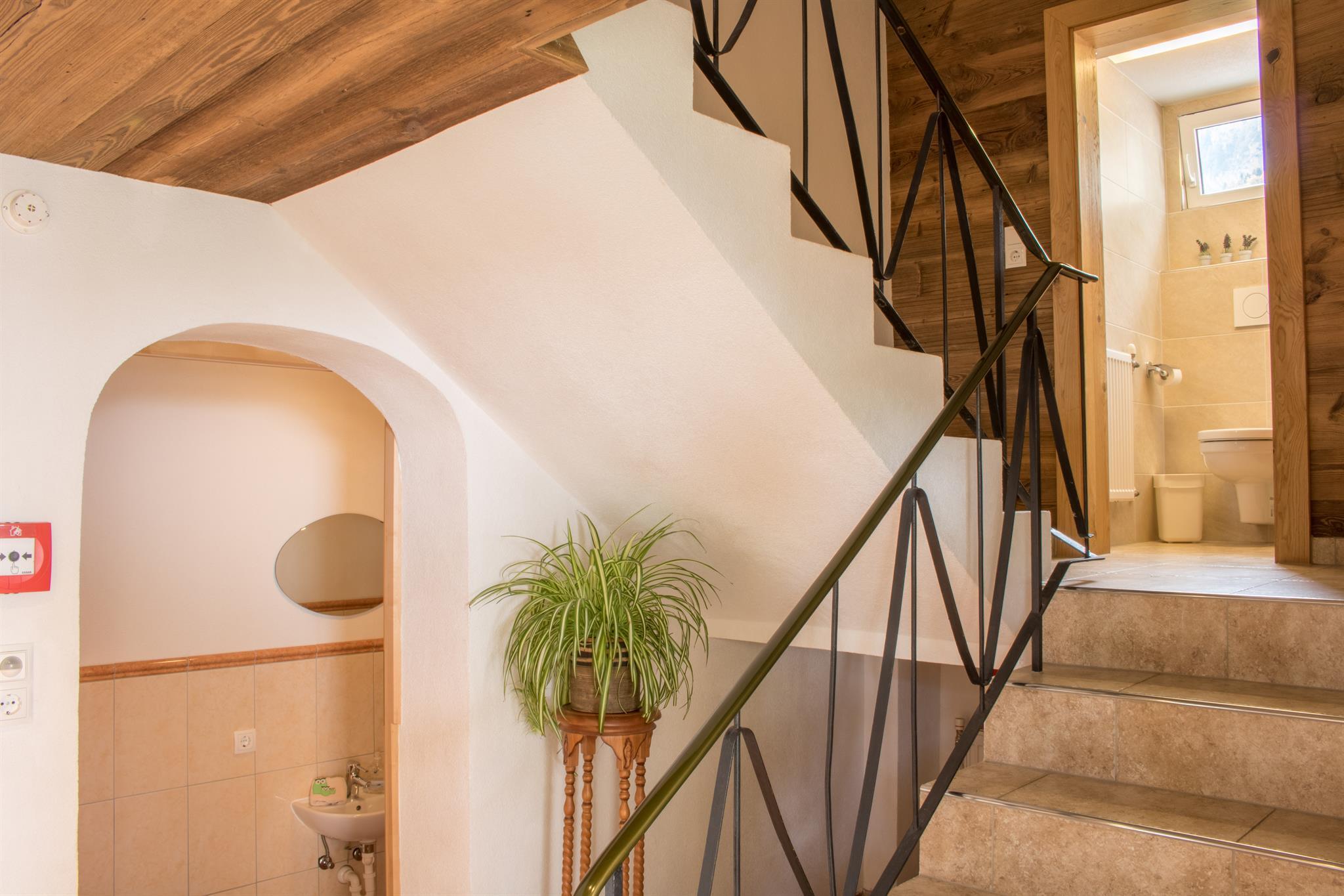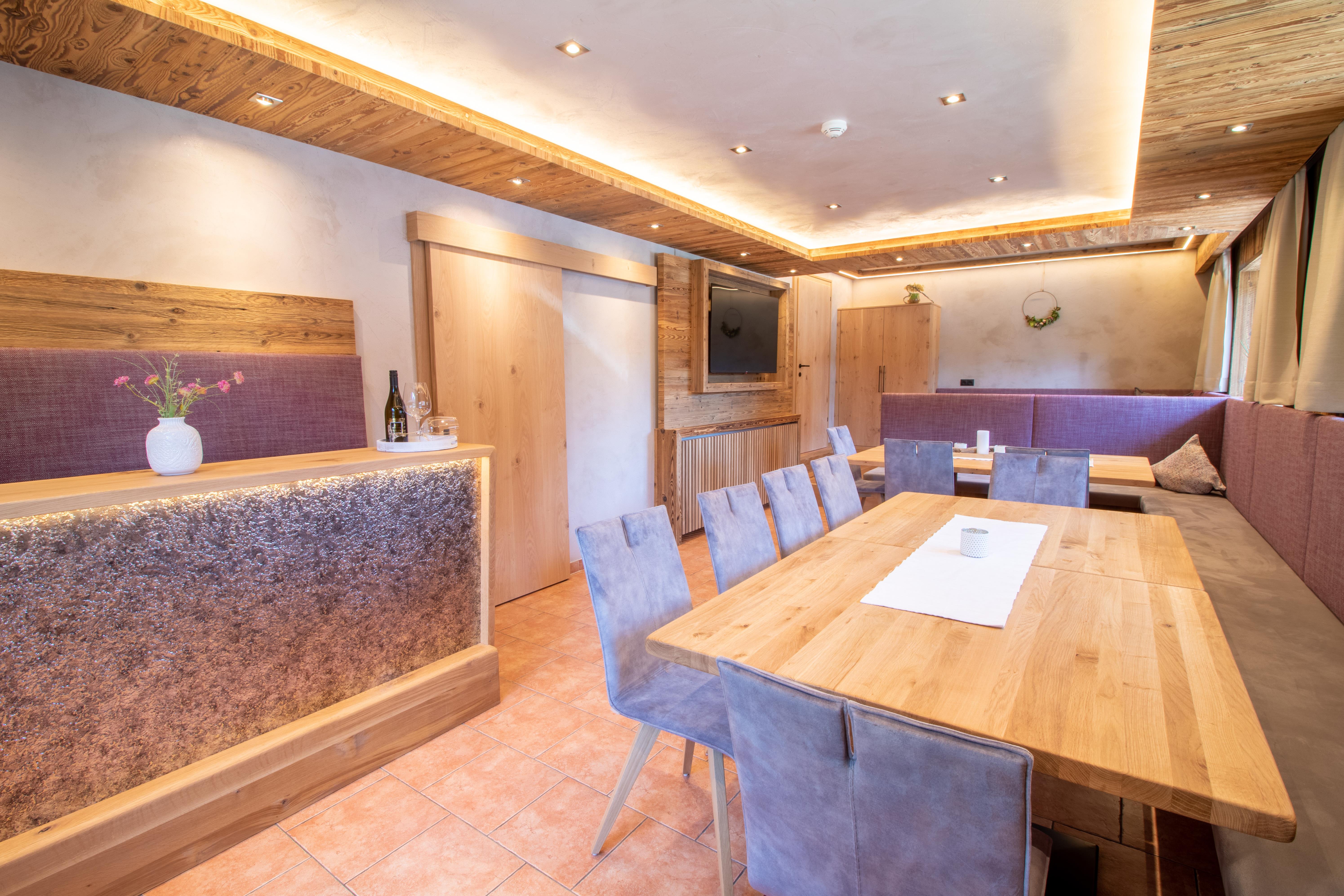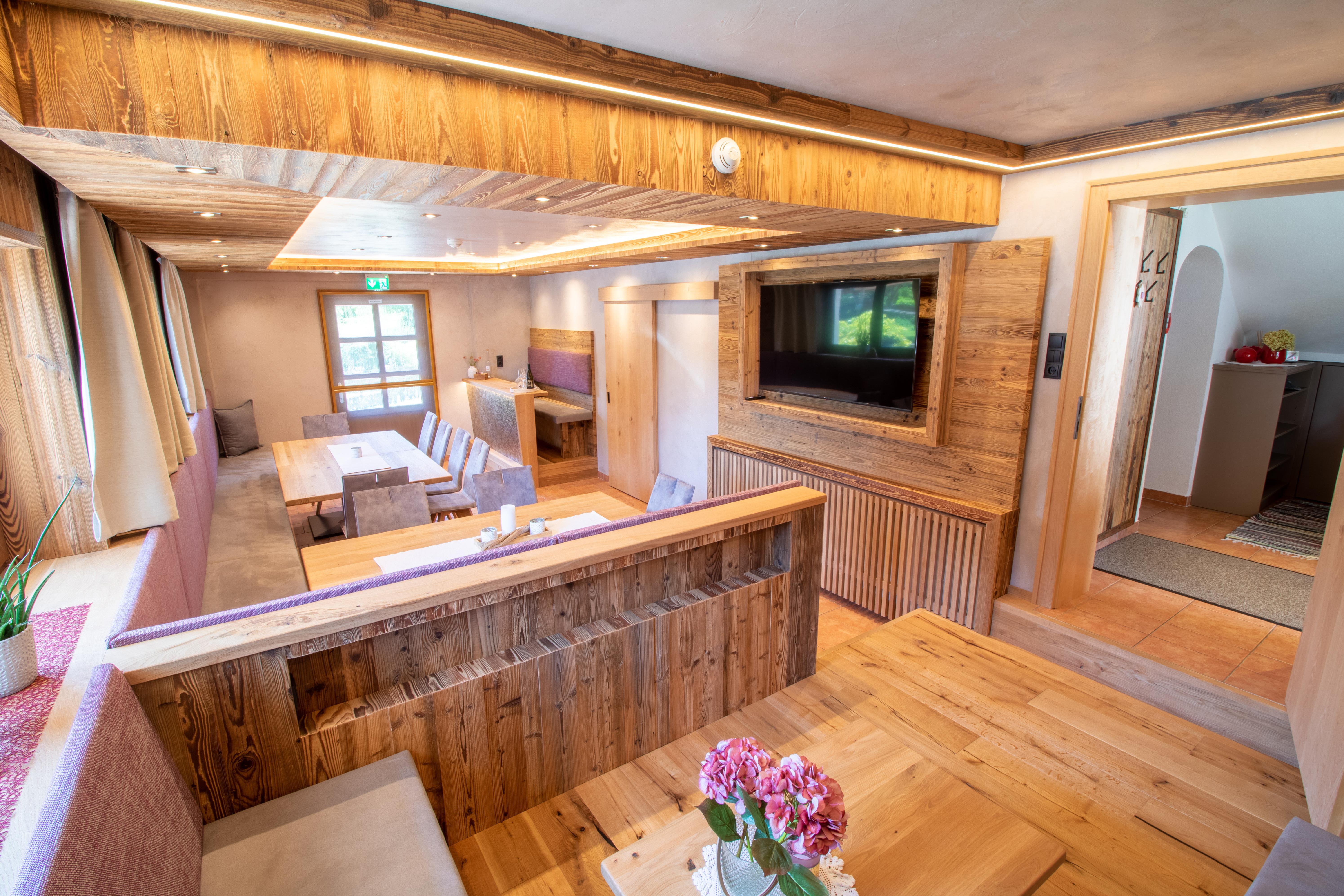 Ferienhaus für maximal 18 Personen, 6 Schlafzimmer, 3 Etagen, ca. 220m²; Vom Eingangsbereich geht es über zwei Stufen in den Wohnraum mit wunderschönen Eckbänken, Stühlen und Zugang zur Terrasse. Ebenfalls vom Wohnraum erreichbar ist die gut ausgestattete Küche (Gastroherd mit 4 Platten und Backofen, Mikrowelle, Geschirrspüler, Kühlschrank, Gefrierschrank, 2 Kaffeemaschinen, Wasserkocher, Eierkocher und Toaster) gehören zur Einrichtung dazu. Bei so einem großen Ferienhaus sind natürlich Insgesamt drei separate WC´s, auf jeder Etage eines vorhanden. Im Winter wird unser Schieraum mit Schuhtrockner von unseren Gästen sehr gut angenommen.
