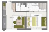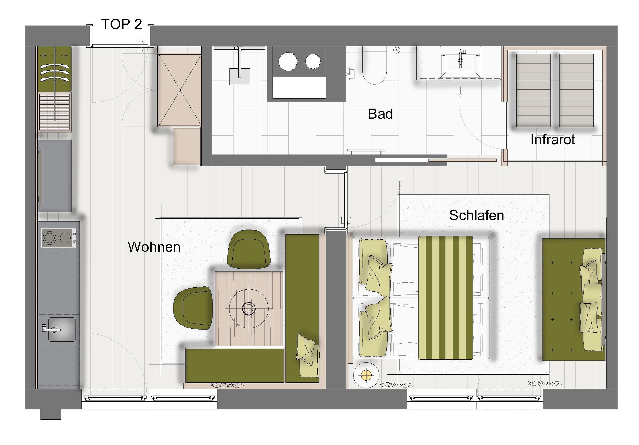 Die südseitige, komplett renovierte Ferienwohnung Schatzberg (Umbau Herbst 2021) im das Luggi bietet Platz für bis zu zwei Personen. Die Wohnung befindet sich im zweiten Stock (mit Aufzug) und ist ausgestattet mit einer Wohnküche, einem Doppelzimmer, Badezimmer mit Dusche/WC. Besonderheit dieser Ferienwohnung ist eine Infrarotkabine. Weiters hat die Wohnung Kabel-TV und einen Balkon.