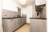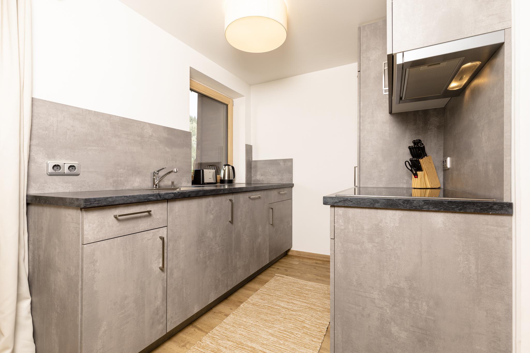 offene Küche ausgestattet mit Ceran Kochfeld und Dunstabzug, kleiner Backofen, Kühlschrank, Geschirrspüler, Kaffeemaschine, Toaster , Wasserkocher, Geschirr für 4 Personen,