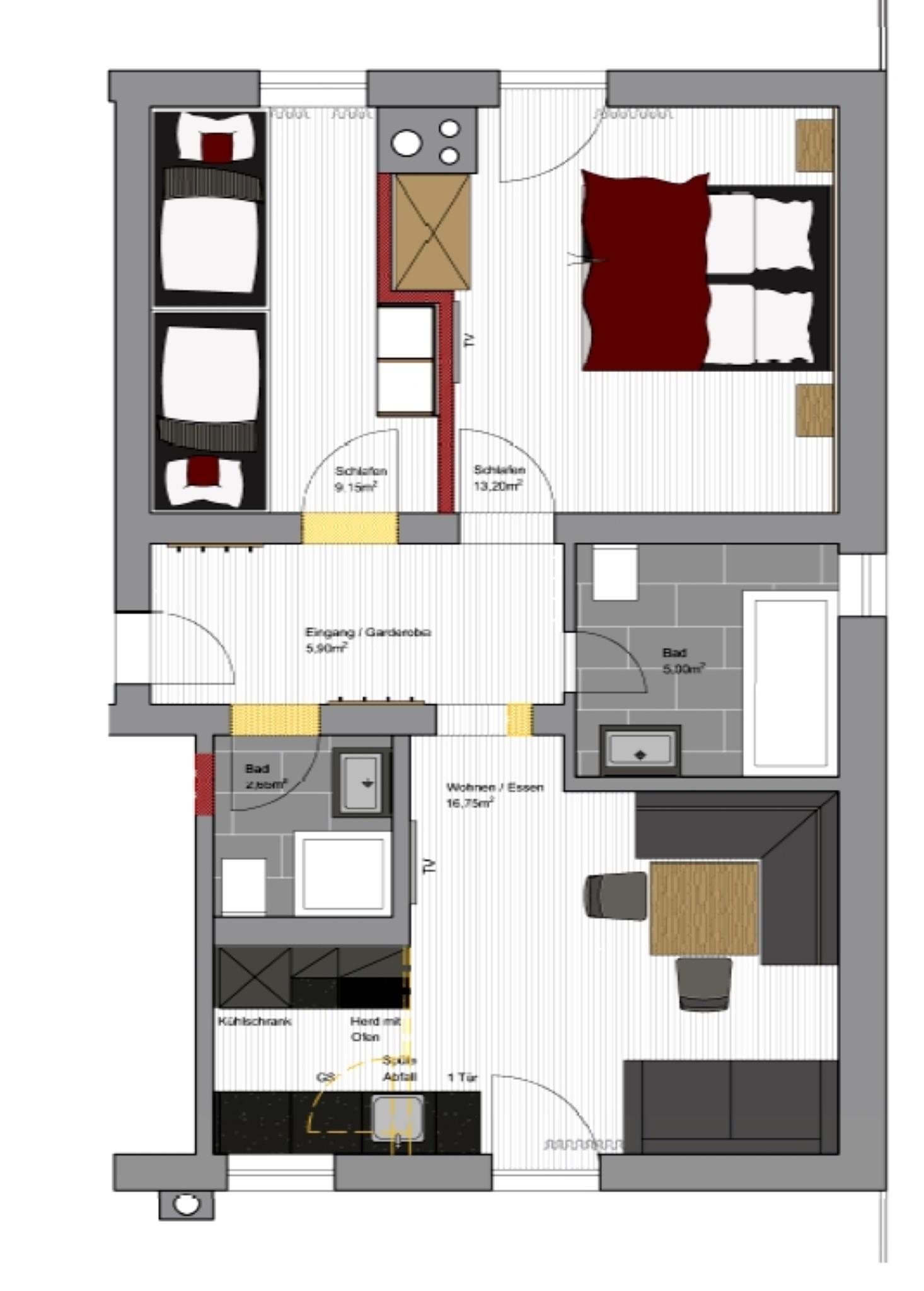2 getrennte Schlafzimmer (1x Kinderzimmer mit 2 längs gestellten Betten) Elternzimmer mit Doppelbett,