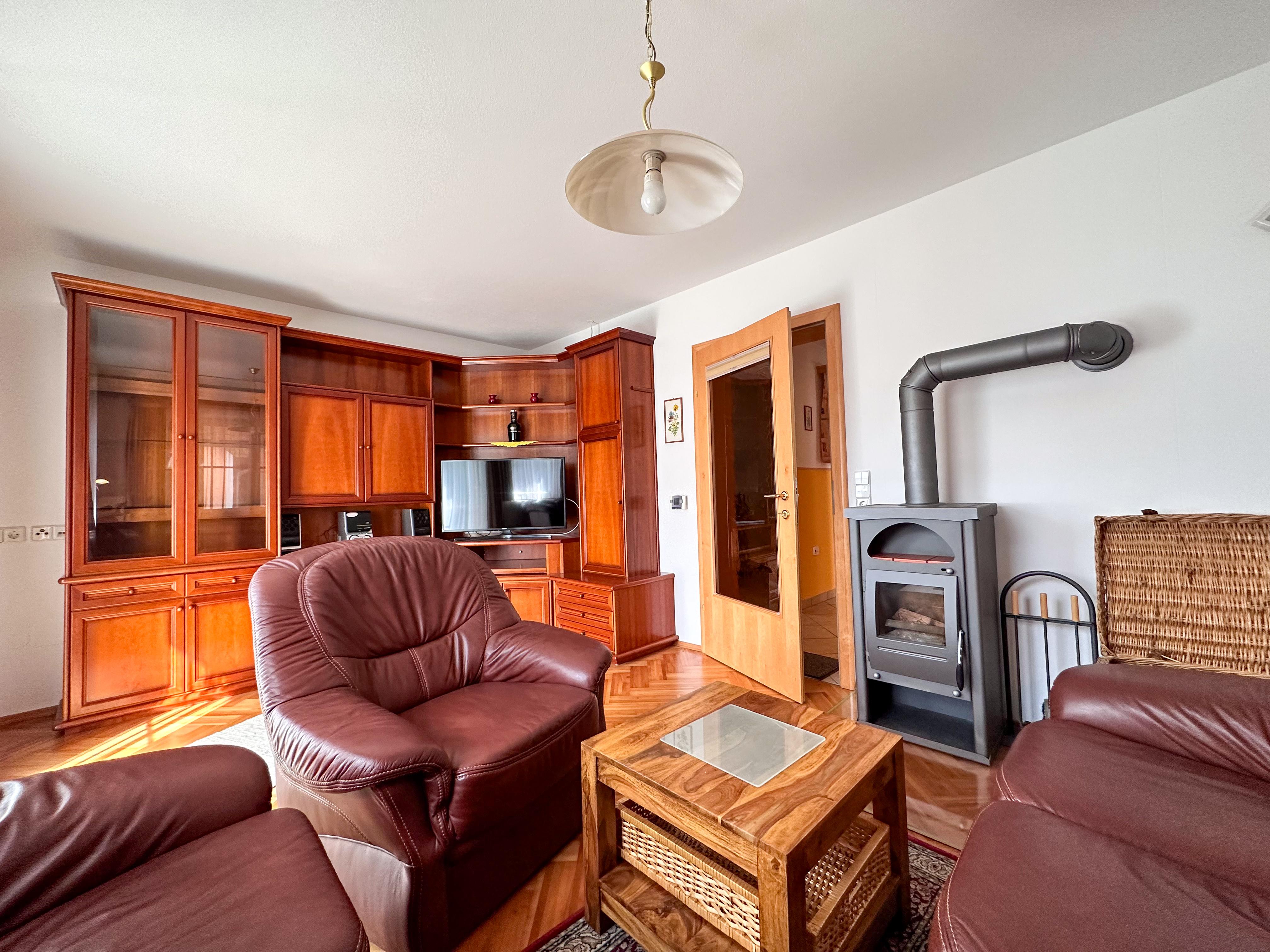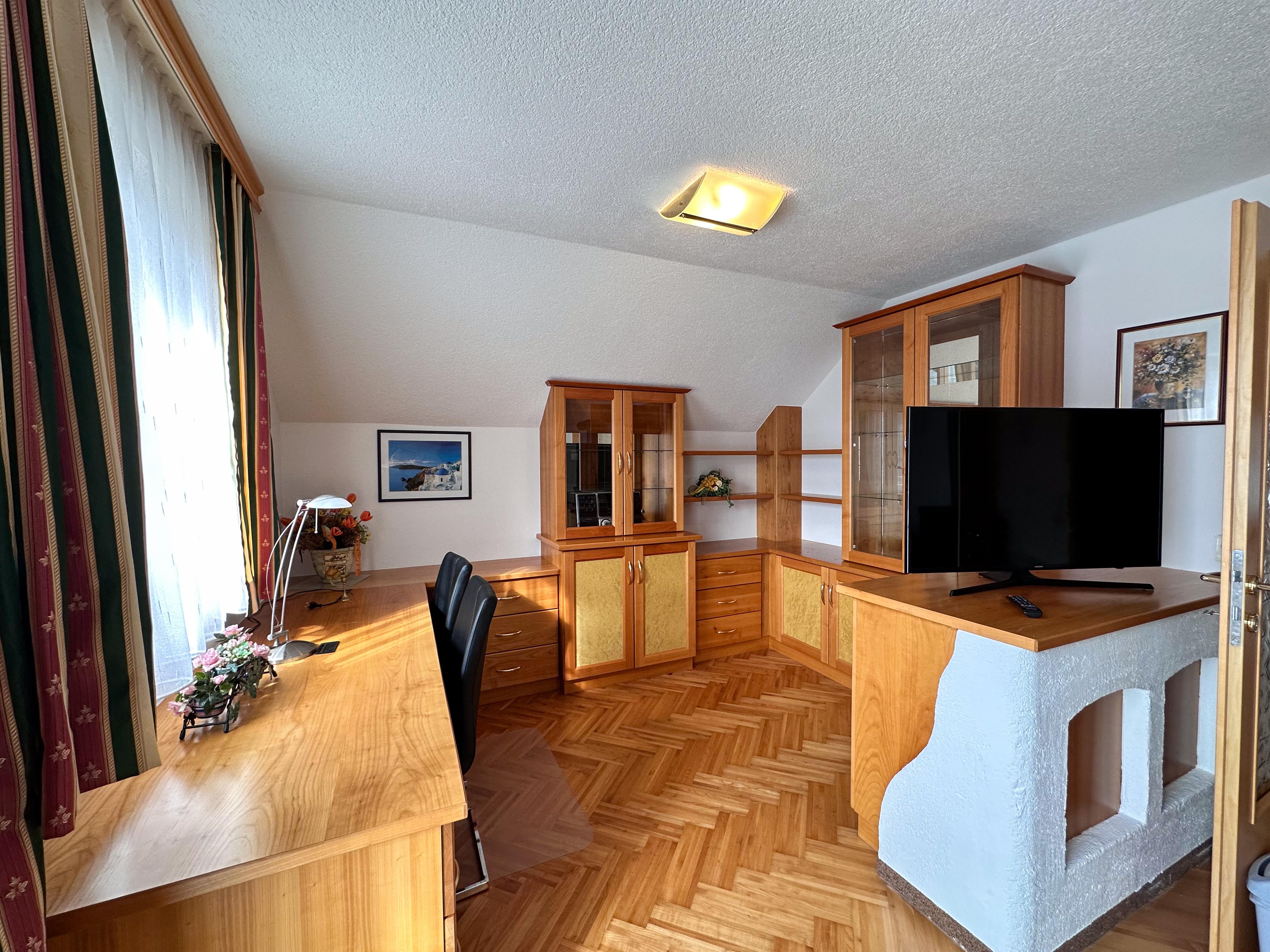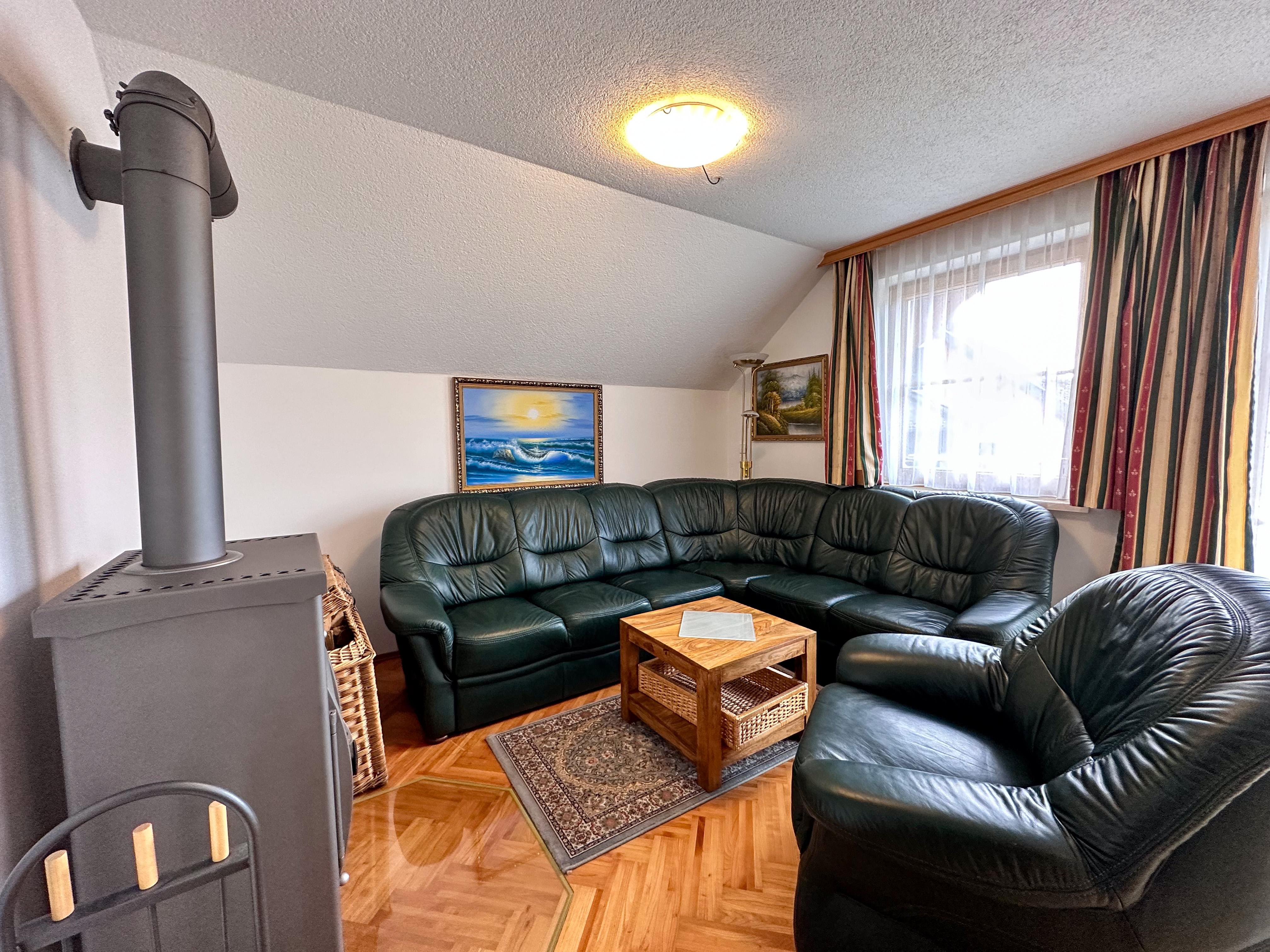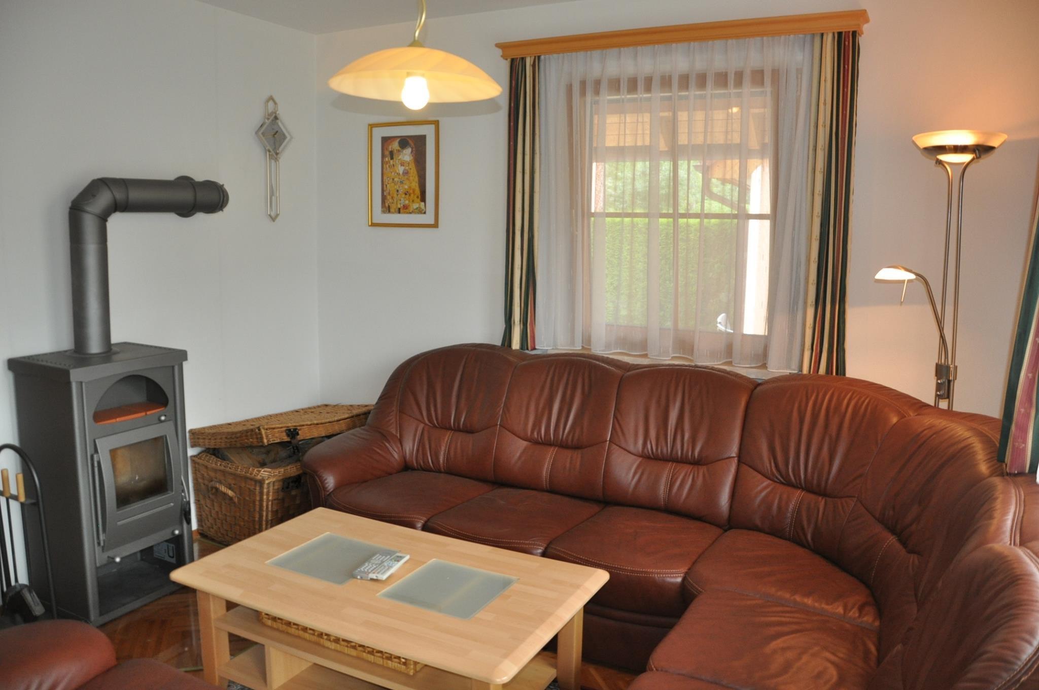 Jede der 2 neuen Ferienwohnungen hat 3 getrennte Doppelzimmer mit Sat-TV, eine Doppel-Schlafcouch im Wohnzimmer mit Schwedenofen, (4 Schlafräume), 2 WC, Damen und Herren getrennt sowie 2 Duschen, Vorraum mit Garderobe, Abstellraum und komplett eingerichtete und voll ausgestattete Küche mit Essecke, in allen Wohn- und Schlafräumen elektrische Rollläden, In allen Schlafzimmer allergikerfreie Bettwäsche und Holz-Parkettböden sowie im gesamten Ferienhaus Karin allergikerfreie Fußböden. Gratis Parkplätze, Free-WLAN, Sat-TV, Balkon / überdachte Terrasse mit Balkonmöbel, Garten mit Gartenmöbel und mit Blick auf den höchsten alleinstehenden Berg Europas, den Grimming 2.351m