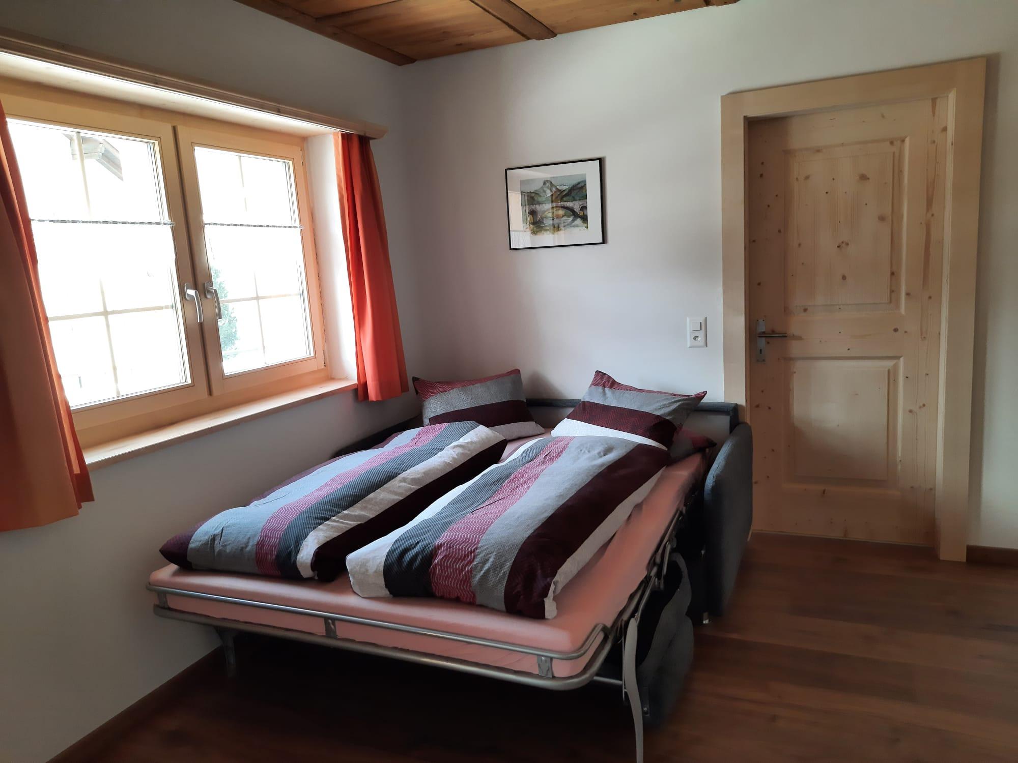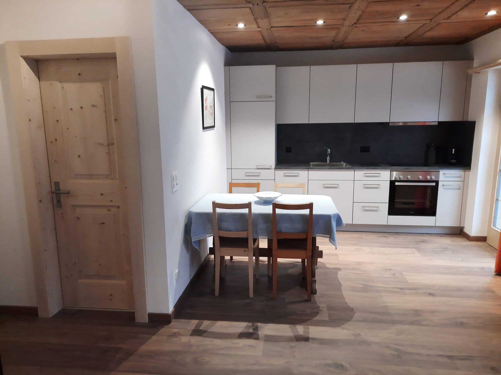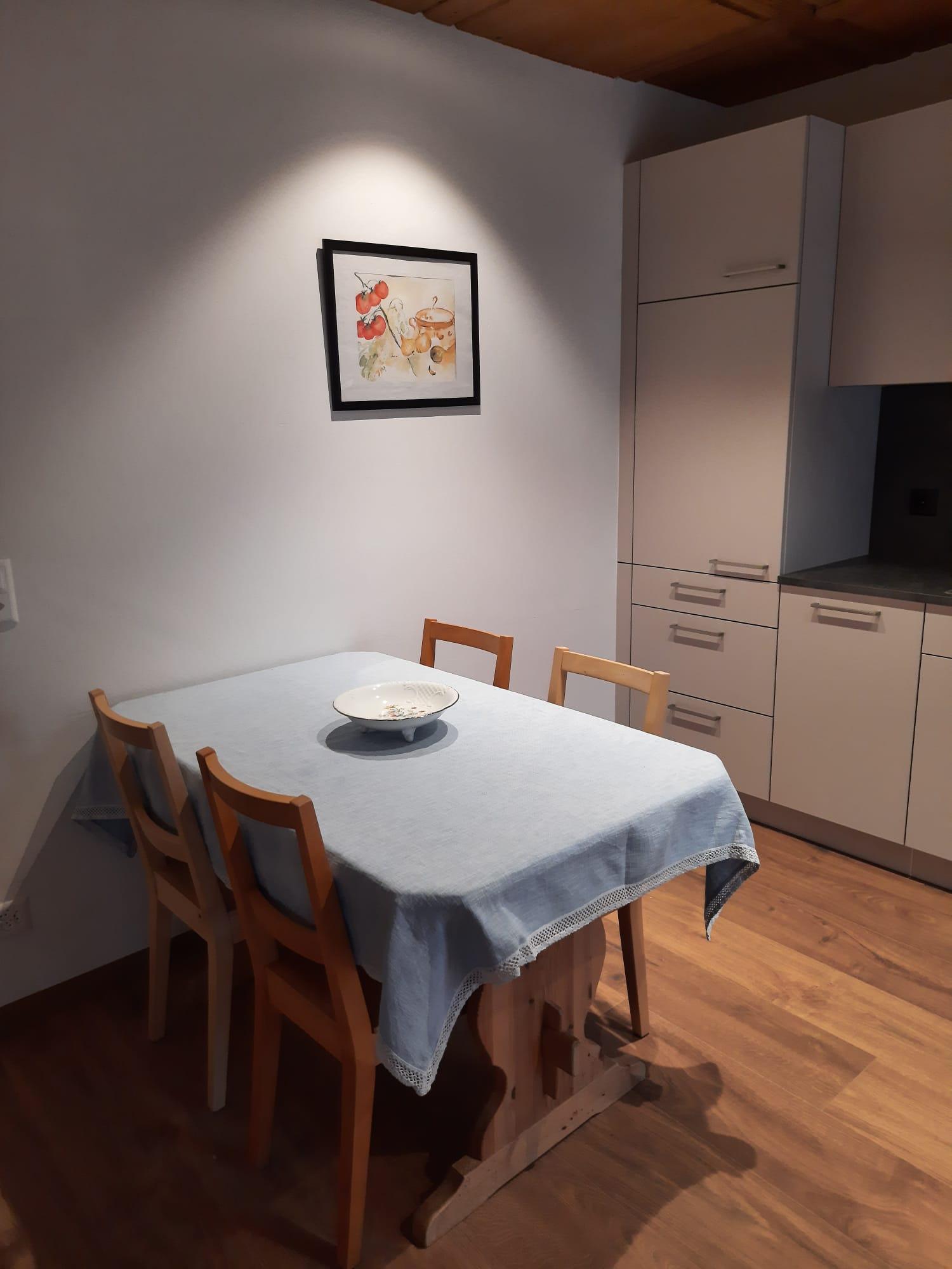 2-Zimmer-Wohnung in Mehrfamilienhaus ca. 37 m2. 1 Schlafzimmer mit einem Doppelbett (160 cm 1 Matratze). 1 Schlafsofa (140 cm 1 Matratze) im Wohnzimmer mit 2 Schlafplätzen. Insgesamt 4 Schlafplätze. Bettwäsche und Küchentücher vorhanden, für zwei Betten antiallergische Bettdeckenund Kopfkissen vorhanden. Wohnküche mit Backofen, Kühlschrank, Geschirrspülmaschine, Kaffeemaschine (Delizio). Racletteofen und Fondue-Caquelon. Dusche/WC. Haarföhn. Gartensitzplatz. Parkplatz. Kellerabteil, Waschmaschine und Wäschetrockner im Haus. WLAN. Haustiere nicht erlaubt. Nichtraucherwohnung. Wickelunterlage, Kinderstuhl,Kinder Reisebett bei Bedarf möglich, Bettgitter für Kleinkinder.