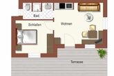 Die Wohnung besteht aus einem großen Wohnraum mit Sitzecke und Doppelcouch (Schlafcouch) , Kochnische mit E-Herd, Kühlschrank, komplettes Geschirr, Microwelle, Kaffeemaschine und Wasserkocher. Schlafzimmer mit Doppelbett, Kleiderschrank und Garderobe. Badezimmer mit Dusche und WC. Schöne, große Terasse, nach Süden ausgerichtet.