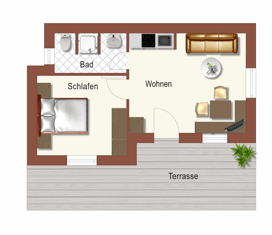 Sehr schöne, nach Süden ausgerichtete Ferienwohnung für 2-4 Personen mit einer Größe von 40 m². Die Wohnung ist nach Süden ausgerichtet und verfügt über eine eigene Terrasse.