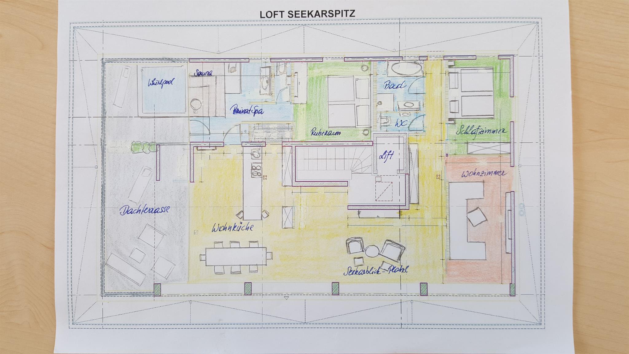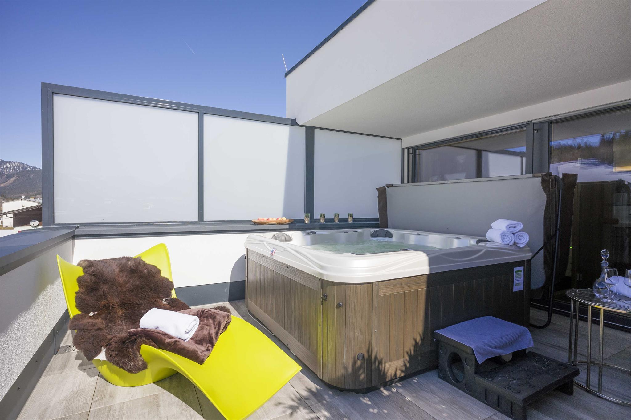 Dieses Loft lässt keine Wünsche offen - 2 Schlafzimmer, 1 Wohnzimmer mit ausziehbarer Couch und Smart-TV, Badezimmer mit Dusche und Badewanne, separates WC, großzügige offene Küche mit Seekarblick-Platzl und Esstisch für 8 Personen, vollständig eingerichtete Küche mit amerikanischem Kühlschrank, SodaStream, Nespresso-Maschine, Wasserkocher, Toaster uvm, private Wellnessoase mit separatem WC, Wellness-Dusche, Infrarot-Zirbenkabine mit Blick in die Berge und Whirlpool auf der Dachterrasse!