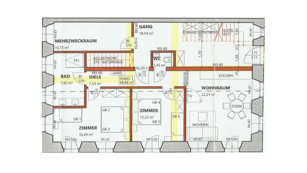 Eine 70 m2 große Erdgeschoßwohnung mit 2 Schlafzimmern jeweils 3 Betten, Wohnküche, Badezimmer mit WC und 2. WC.Gang mit Garderobe und große Terasse.