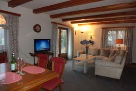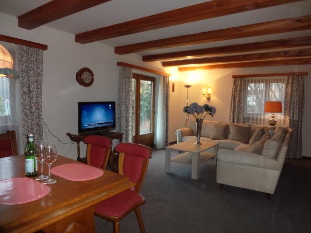 Wohnzimmer und großer Schlafnische mit 2 Betten 100/200. Mit Zirbenholz vertäfelt.Separates Schlafzimmer mit Doppelbett. Vorraum mit 2 Kleiderkasten. Kleine Küchenzeile komplett ausgestattet. Bad mit Wanne und Toilette. TV mit Kabelanschluss. WLAN kostenfrei. Panoramablick zum See. Gartenmöbel.