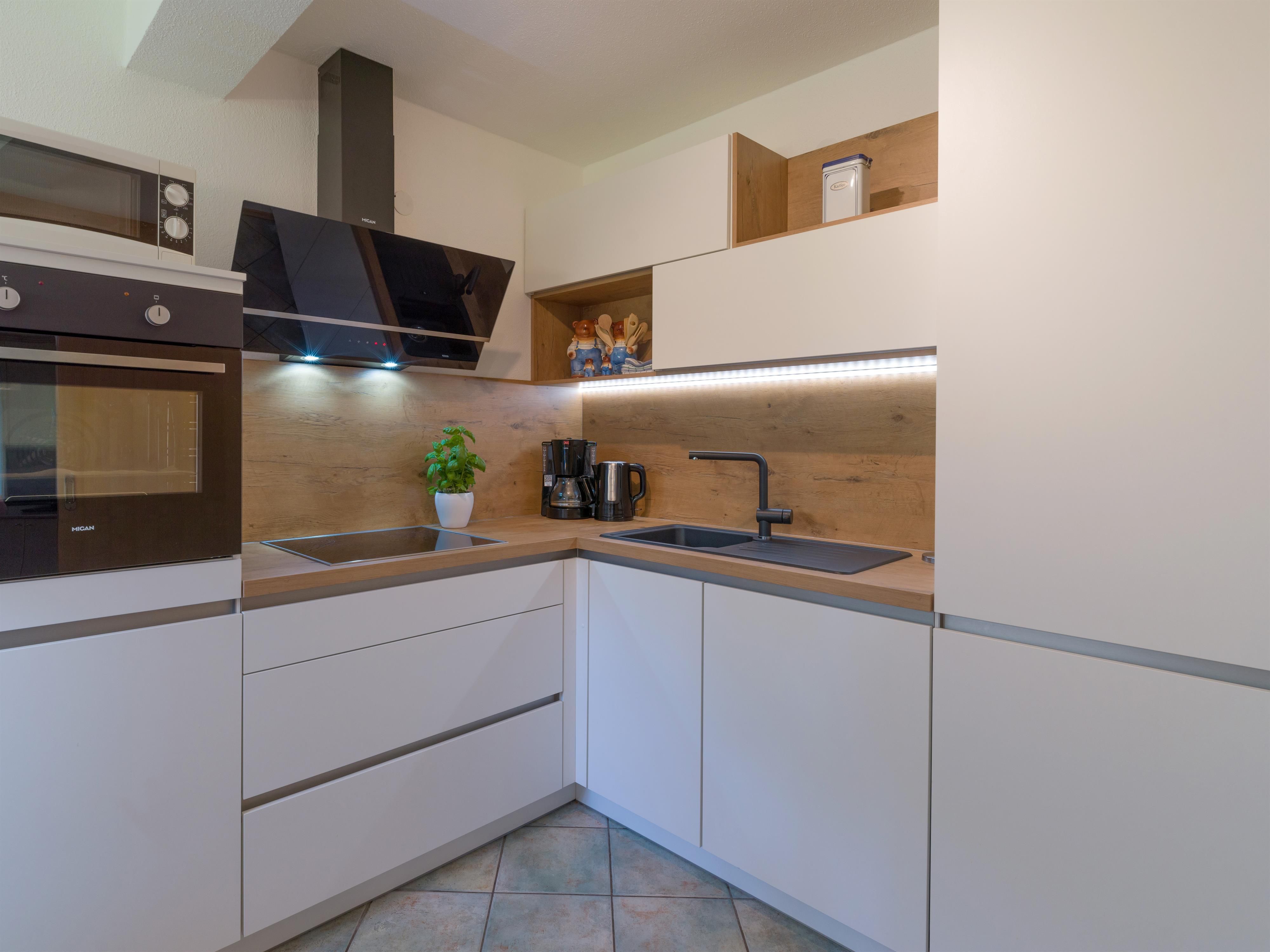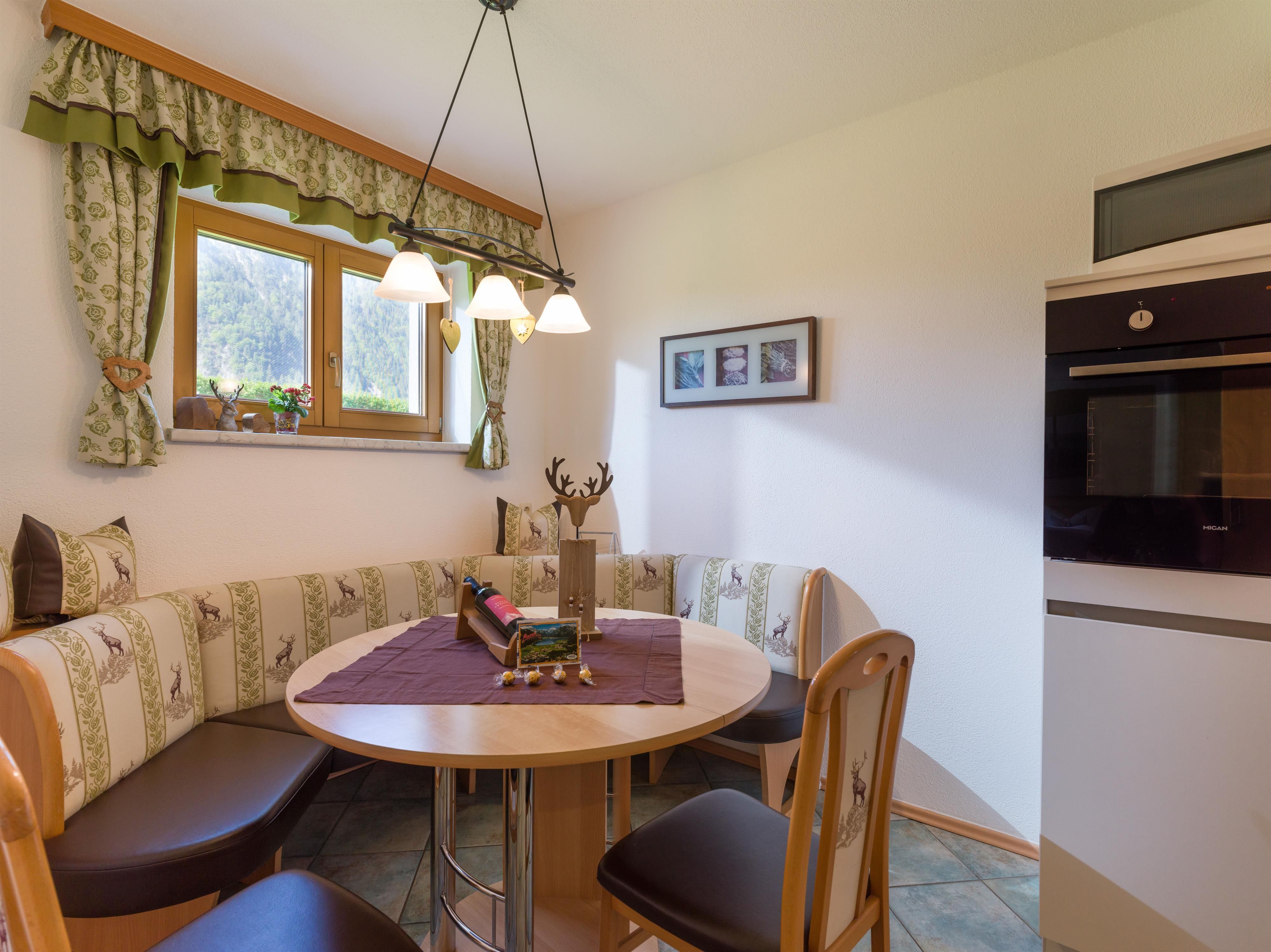 Die Küche mit einladender Sitzecke ist voll ausgestattet.