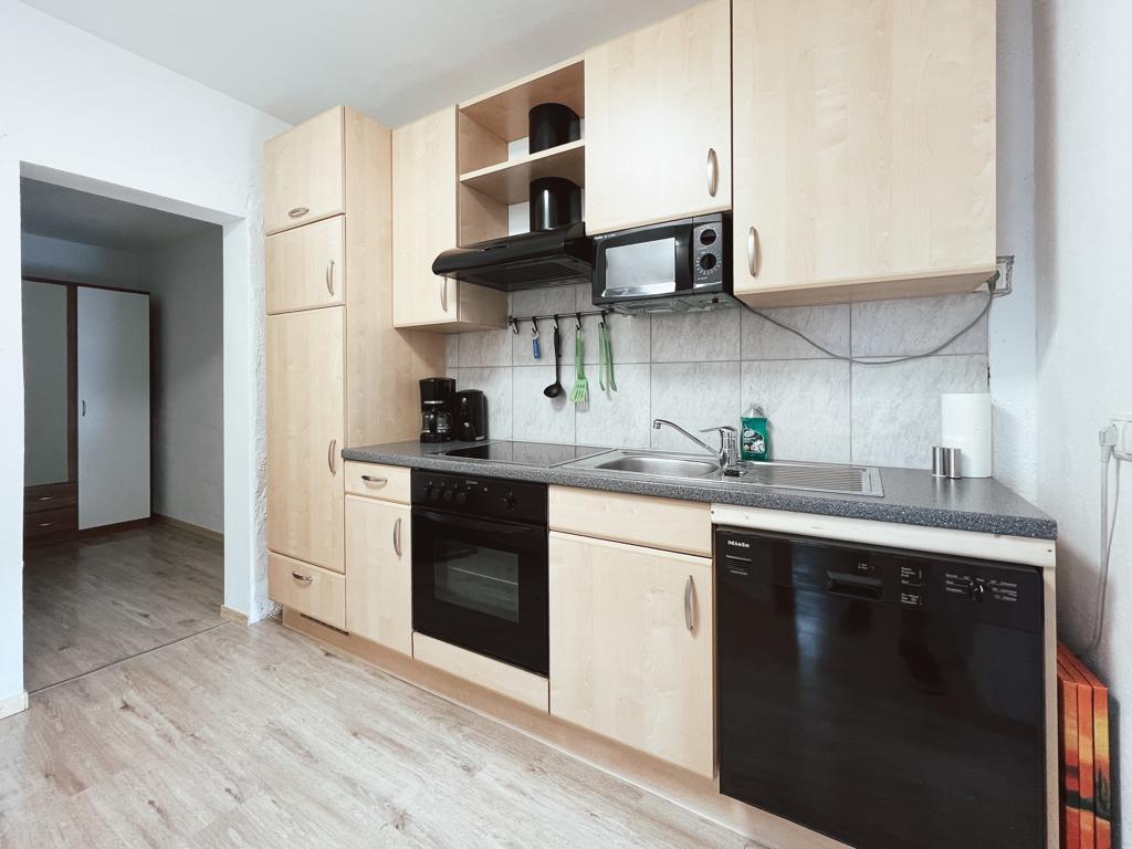 Die Küche ist mit Kühl und Gefrierschrank, Geschirrspülmaschine, Kaffeemaschine, Wasserkocher, Toaster bestens ausgestattet.