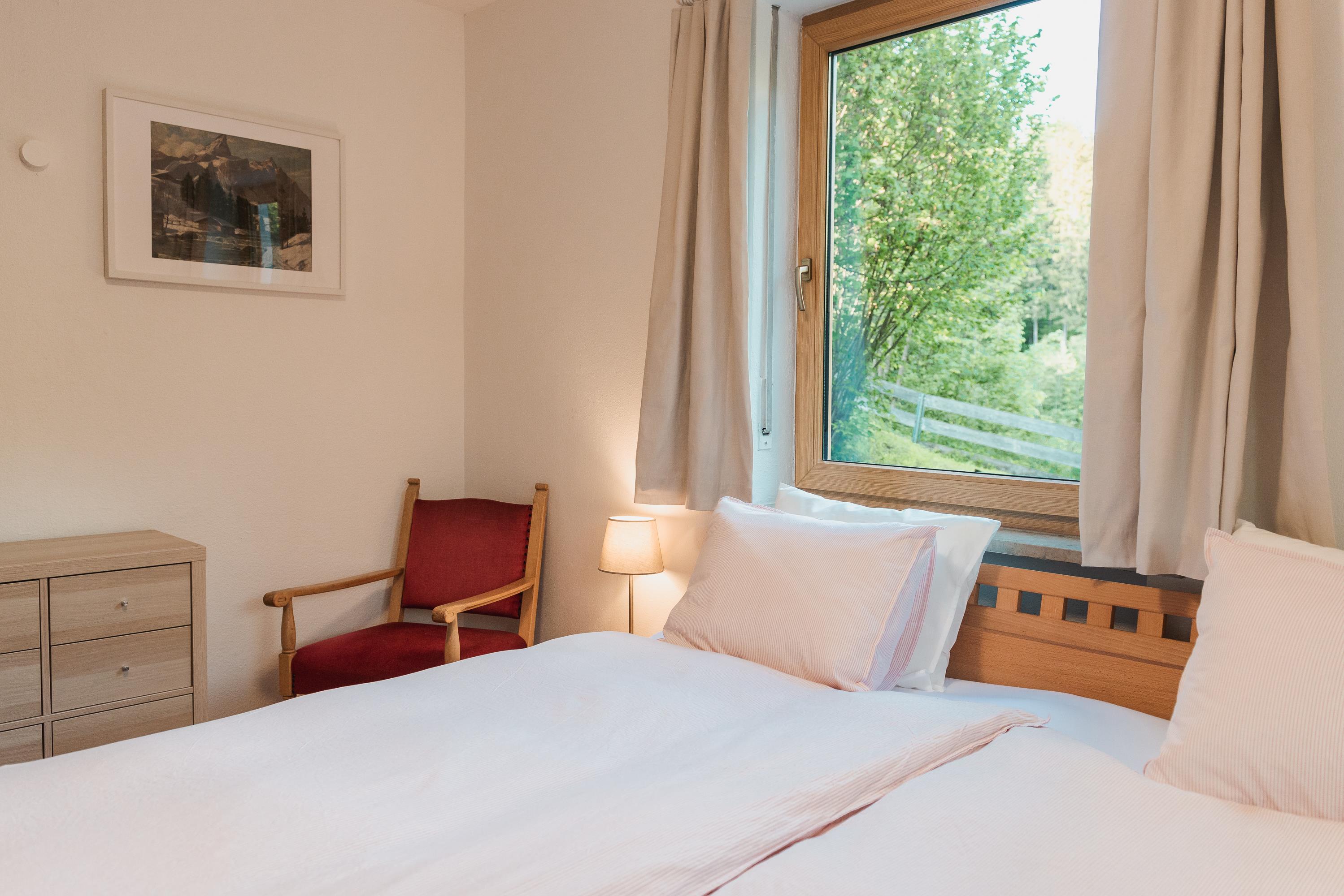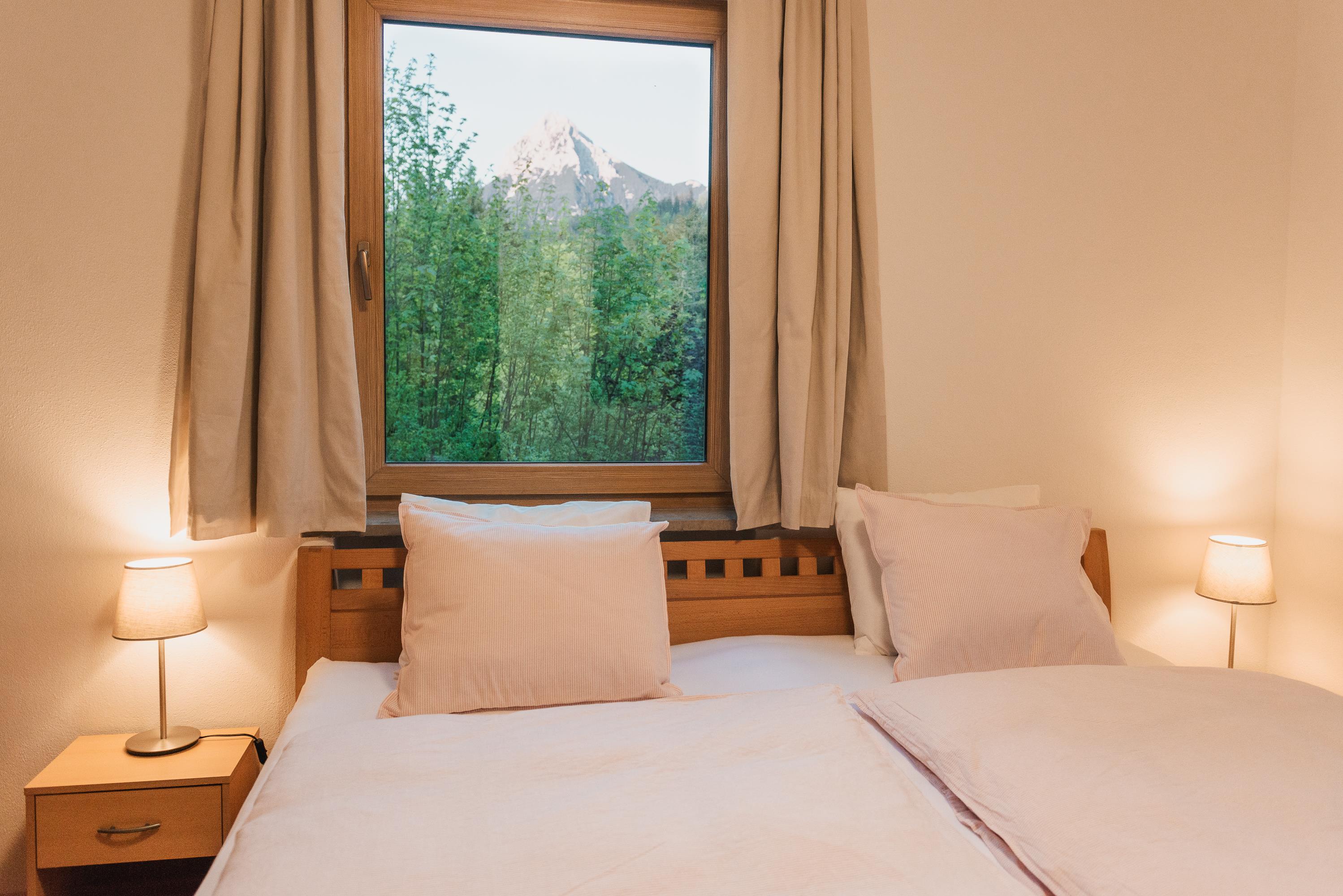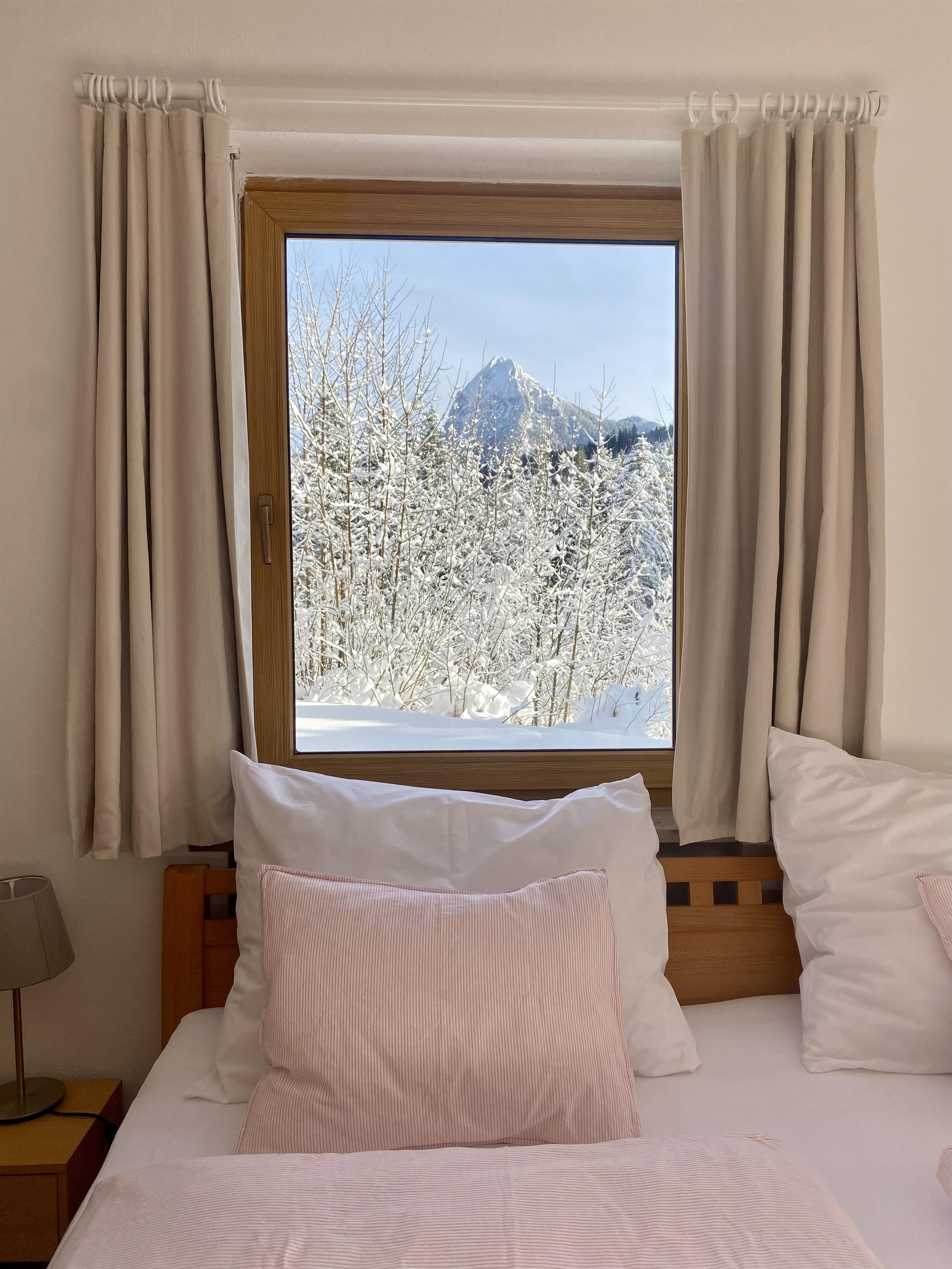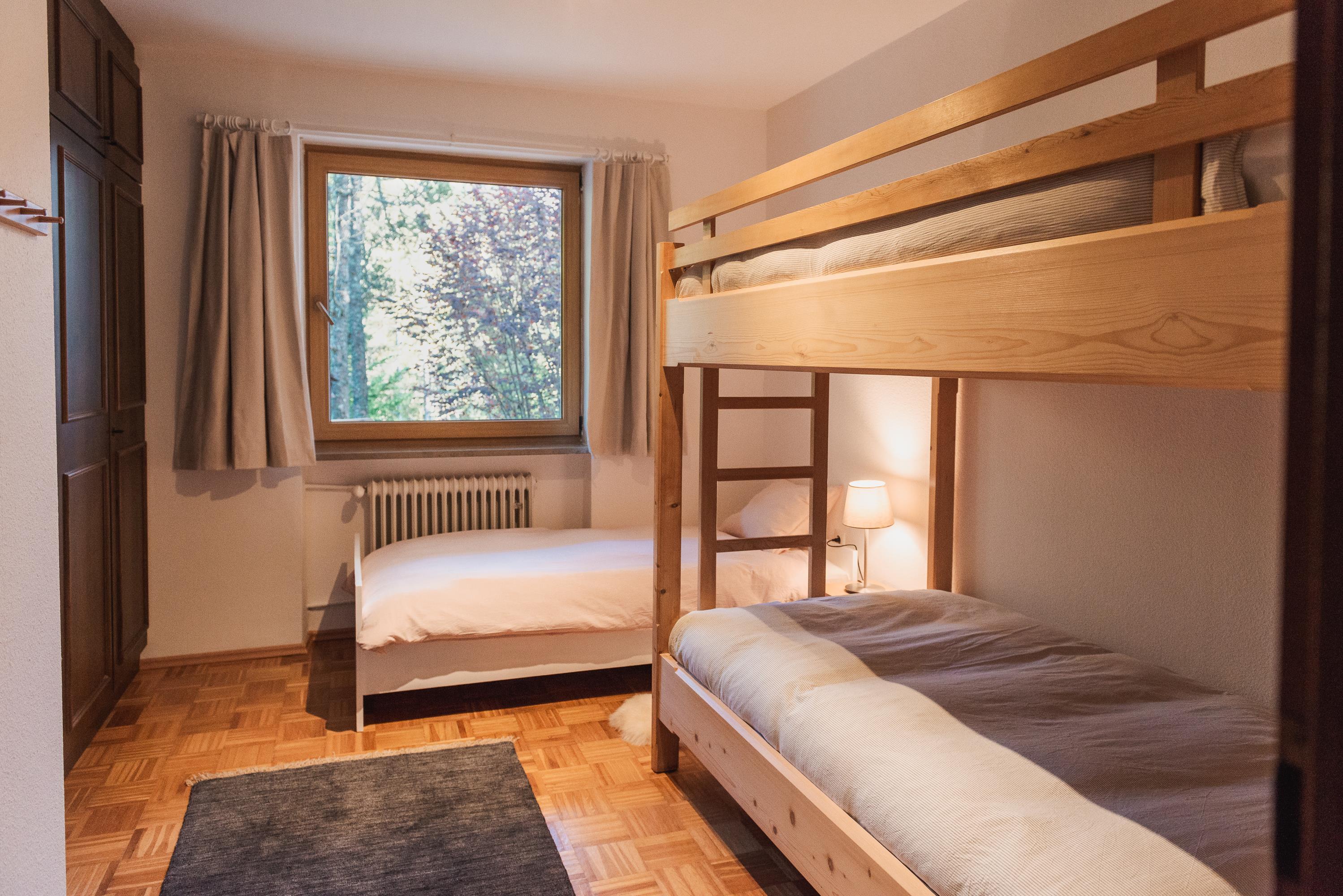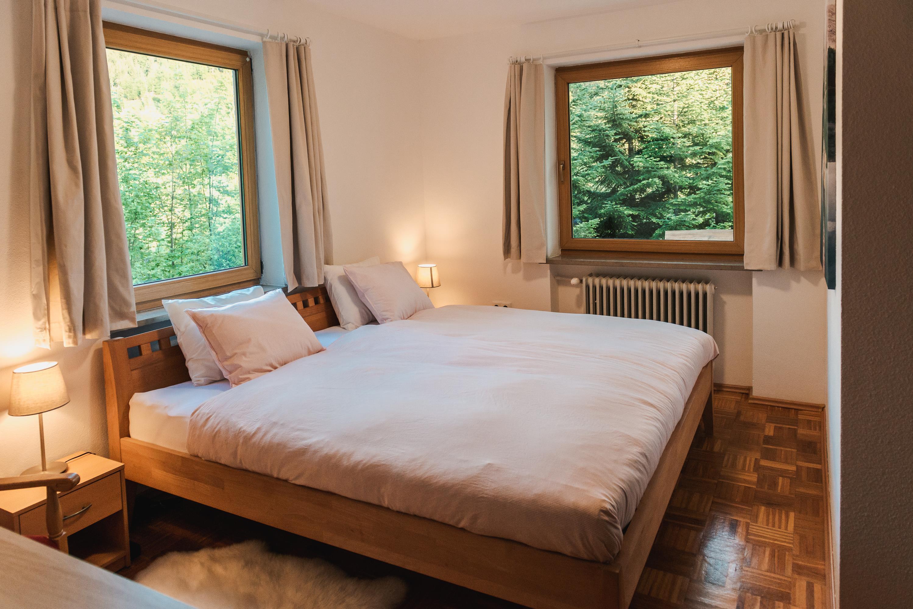Das erste Schlafzimmer hat ein Doppelbett und das zweite hat ein Etagenbett und ein Einzelbett. Beide Schlafzimmer haben große Einbauschränke und Blick auf den Wald und die Berge.