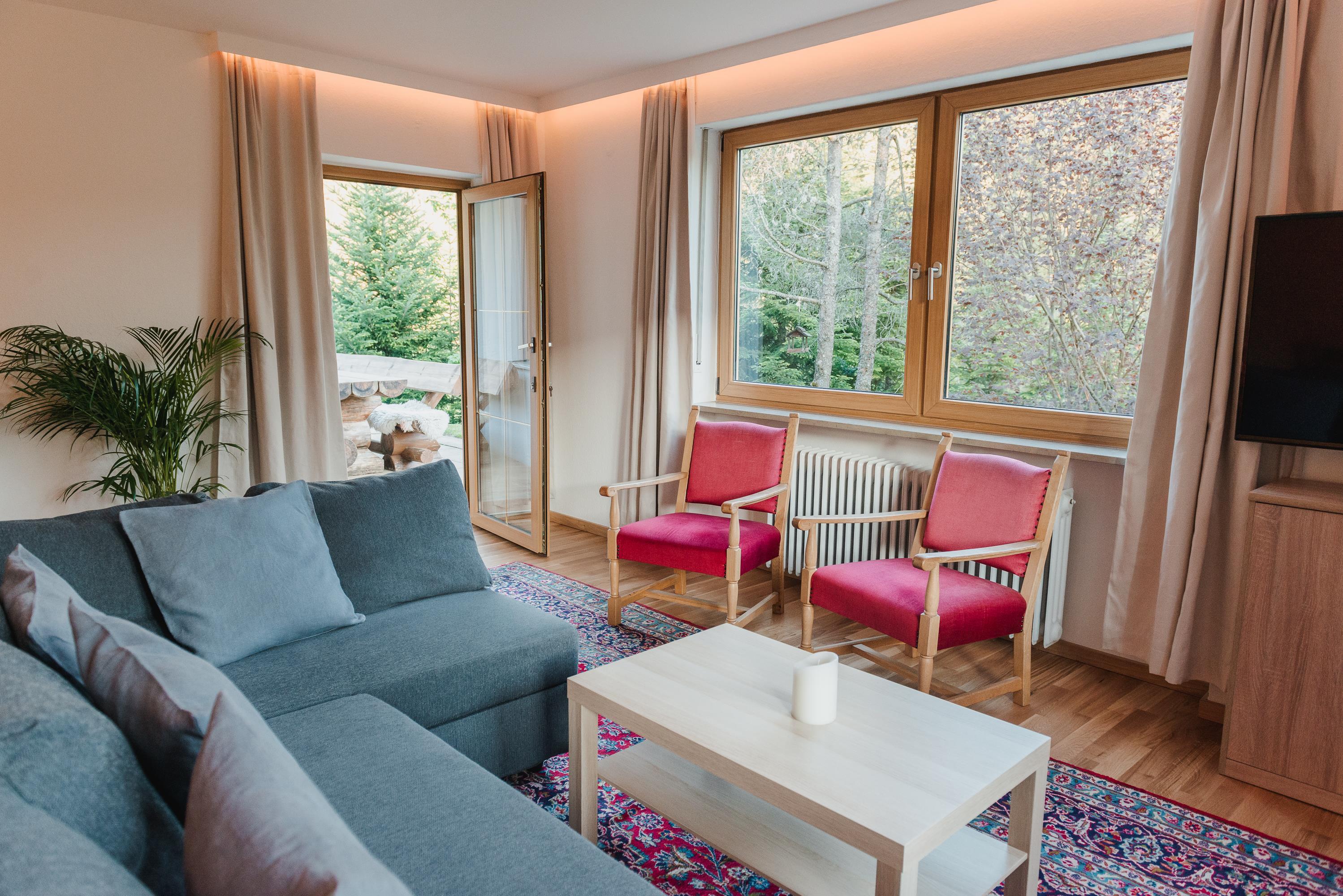 Waldgarten verfügt über eine geräumige, 95 m2 große Wohnung im Erdgeschoss. Der Zugang zur Wohnung erfolgt vom Parkplatz aus über eine separate Außentreppe. Es ist ideal für Familien oder eine Gruppe von Erwachsenen, da es zwei Schlafzimmer mit 5 Betten, eine große neue Küche und einen geräumigen Wohn- und Essbereich gibt. Im Wohnzimmer befindet sich ein Schlafsofa, auf dem 2 weitere Personen schlafen können.